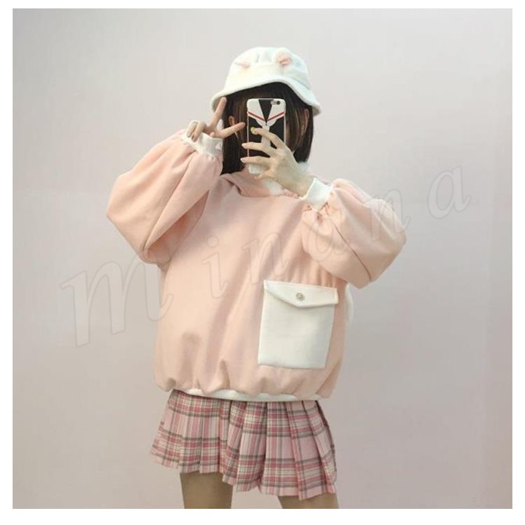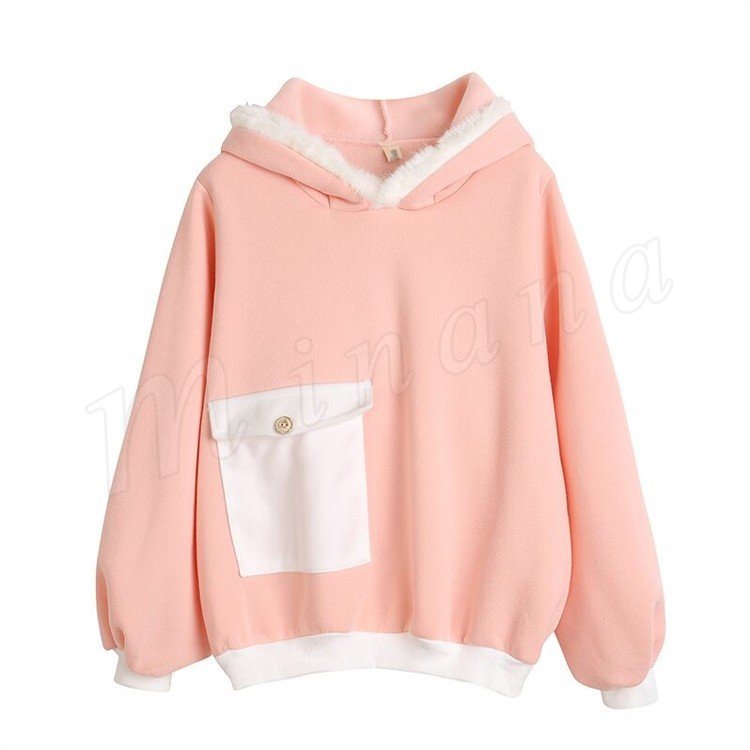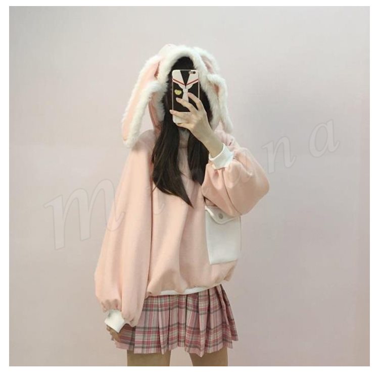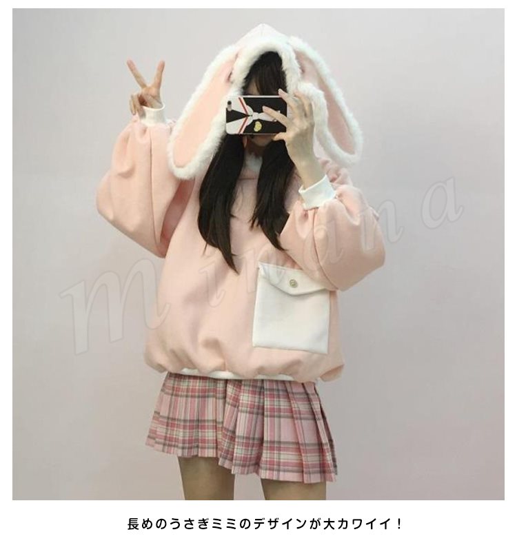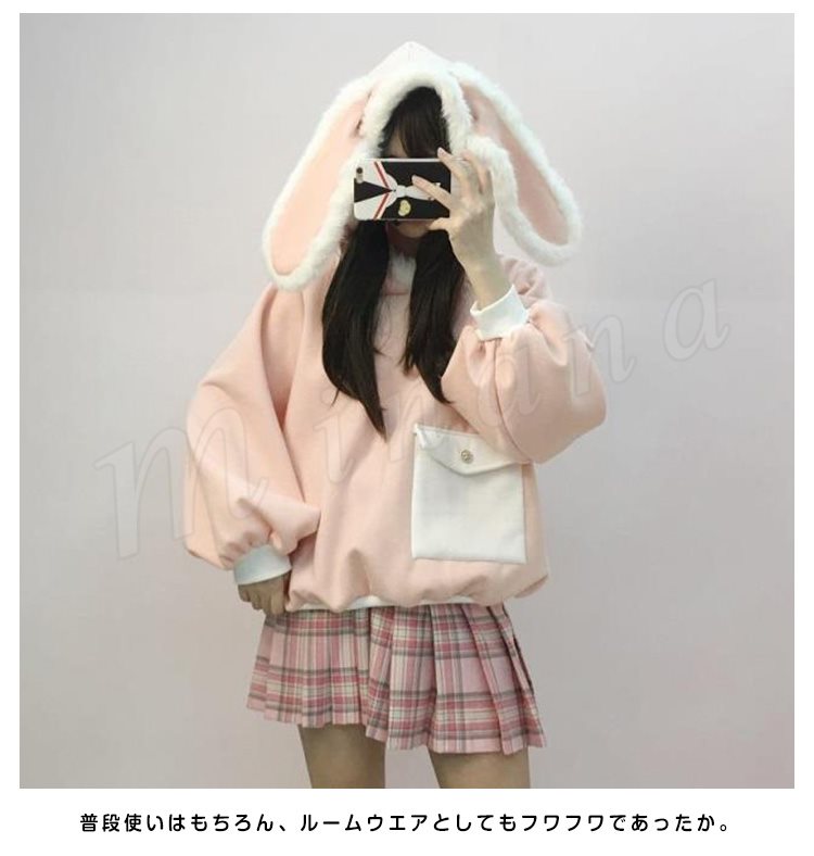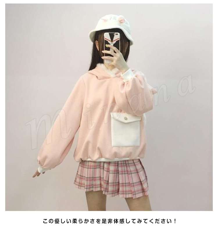 秋冬物 パーカー 兎耳 裏起毛パーカー プルオーバーパーカー うさぎ耳 プルオーバー トップス 防寒 厚手 可愛い 学生 ゆったり ピンク レ