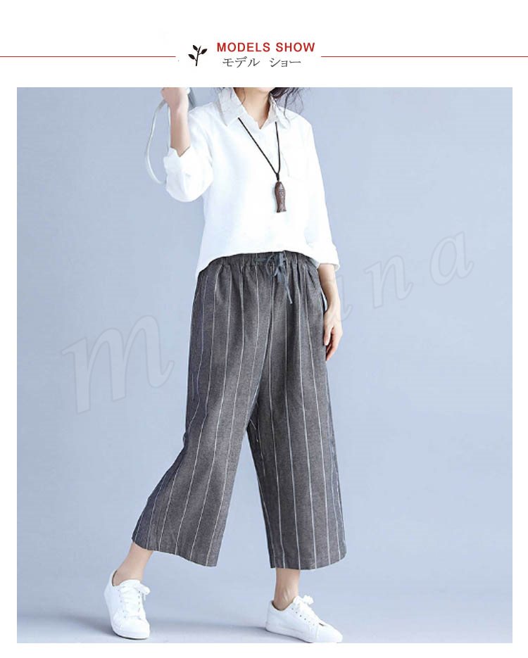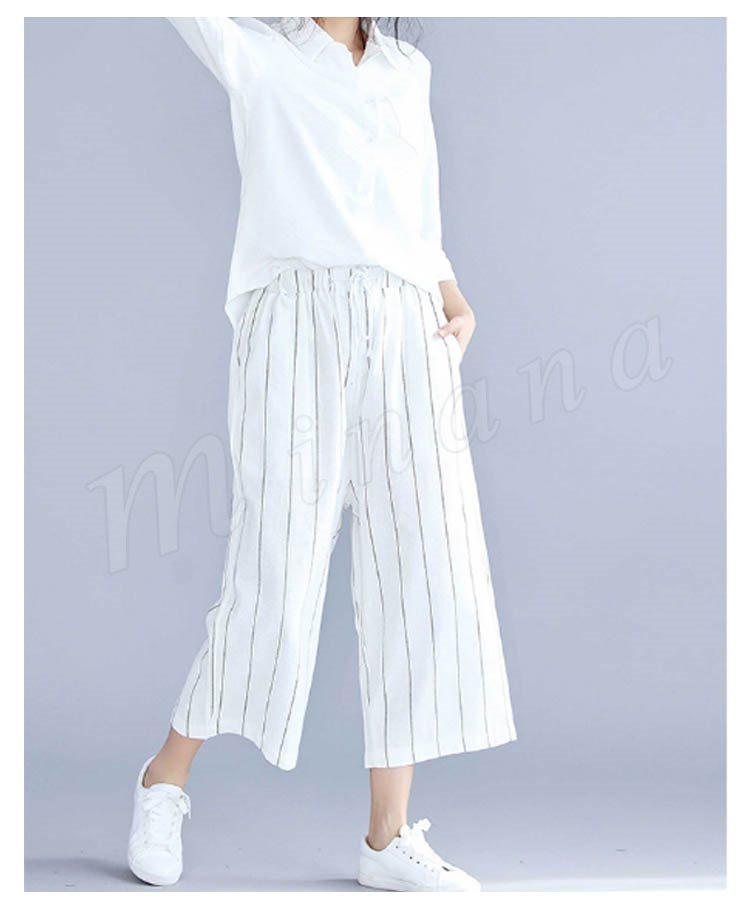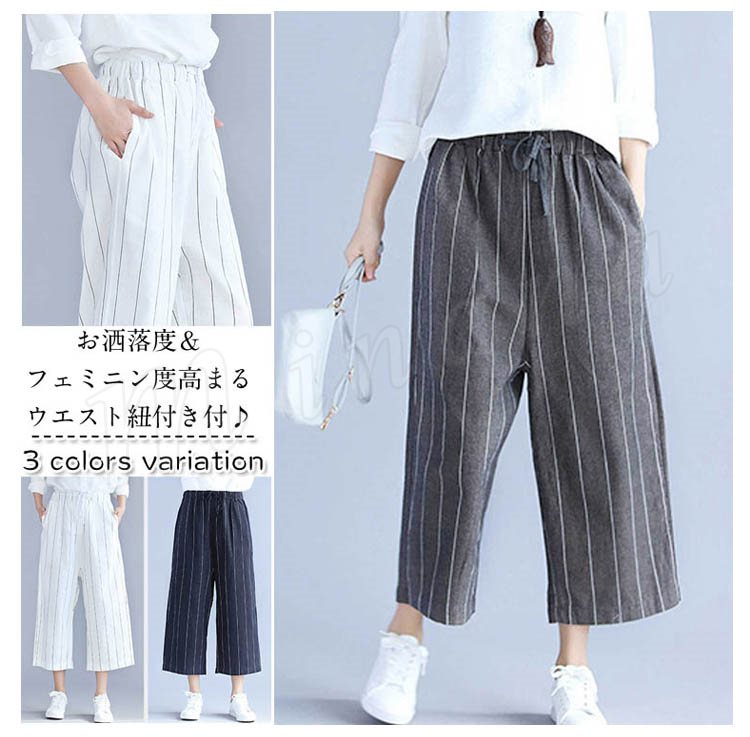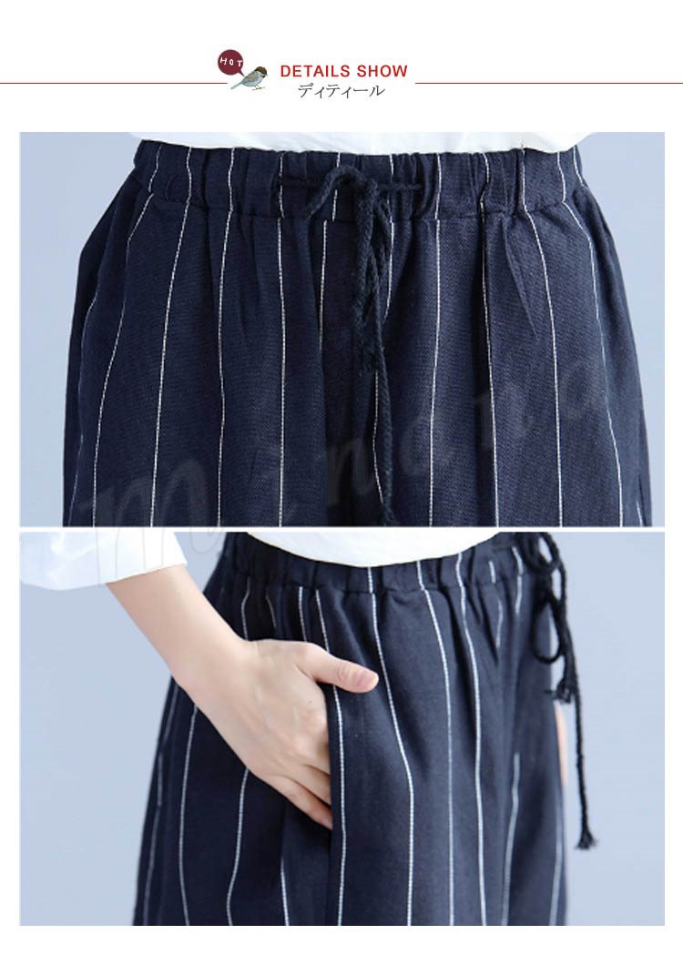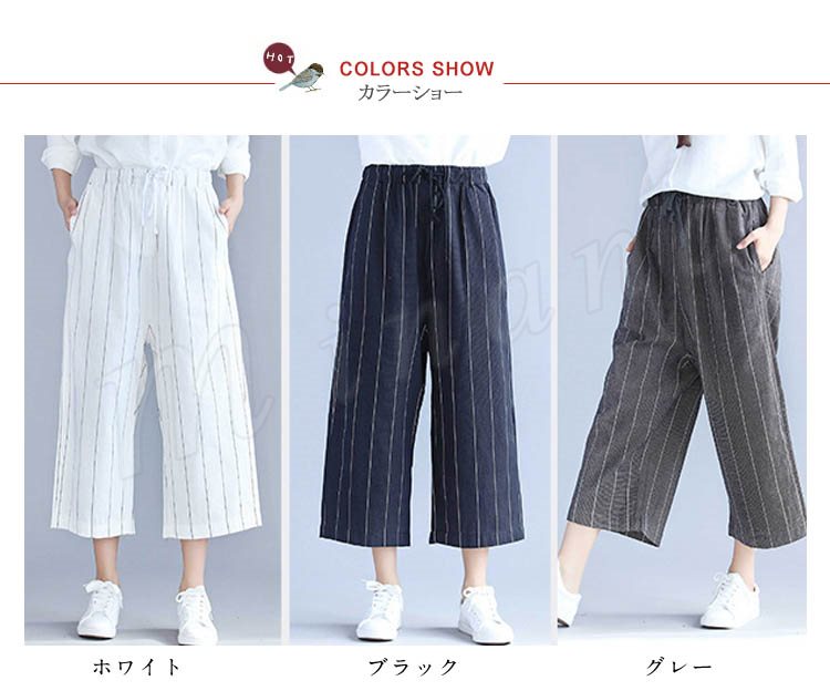 レディース ボトムス ワイドパンツ スカーチョ 7分丈 ガウチョパンツ ストライプ ロングパンツ リネン混 紐付き スカンツ Aライン 3カラー フリ