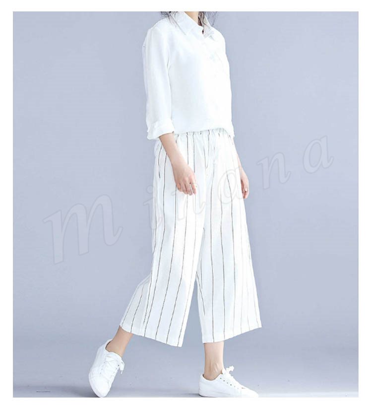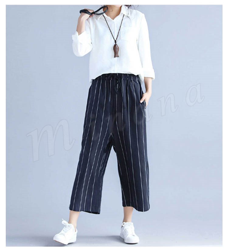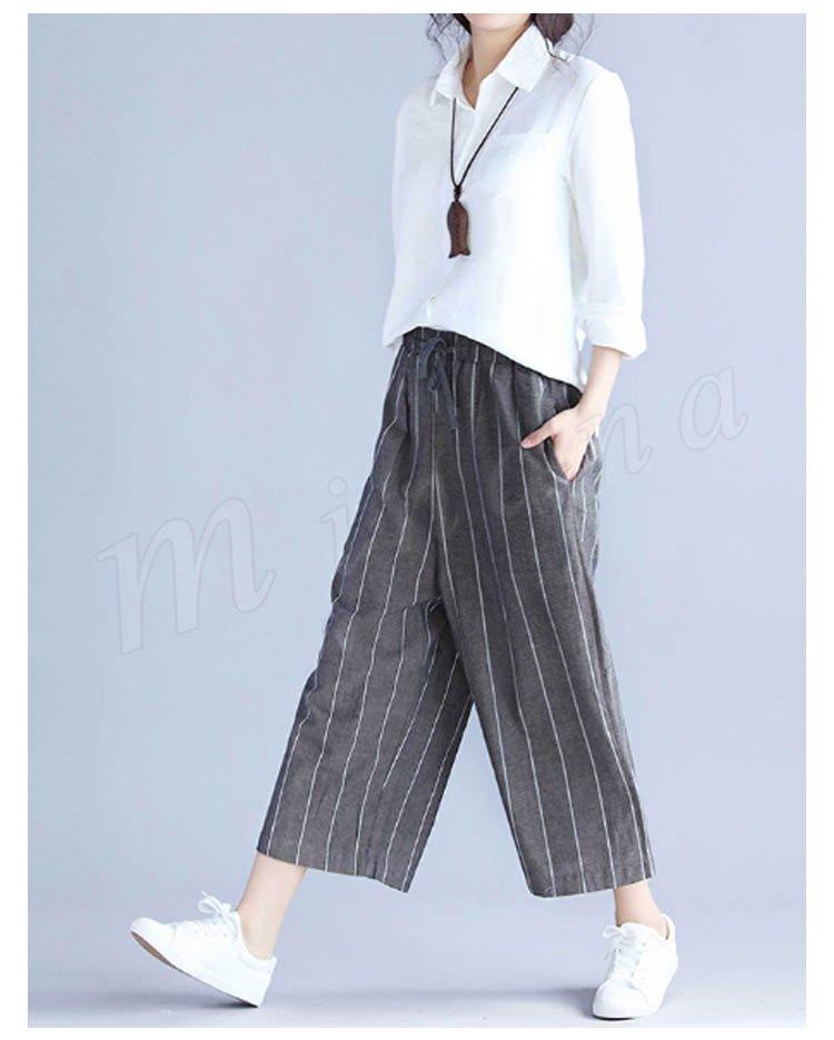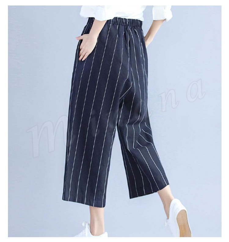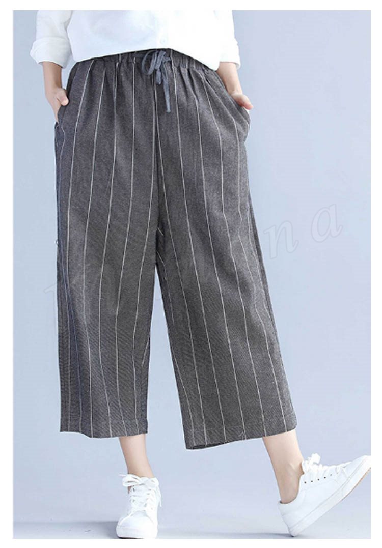 レディース ボトムス ワイドパンツ スカーチョ 7分丈 ガウチョパンツ ストライプ ロングパンツ リネン混 紐付き スカンツ Aライン 3カラー フリ