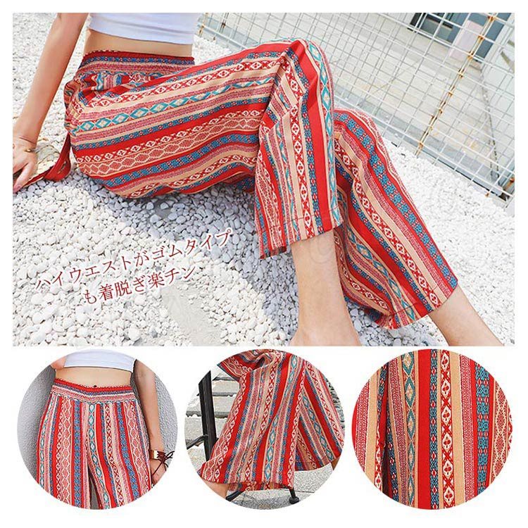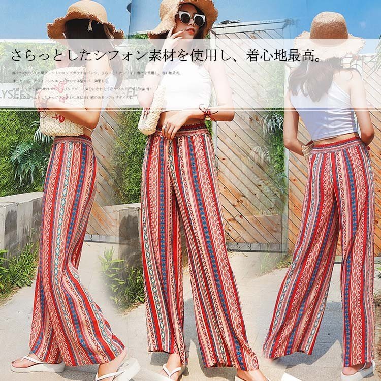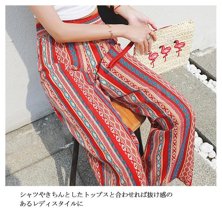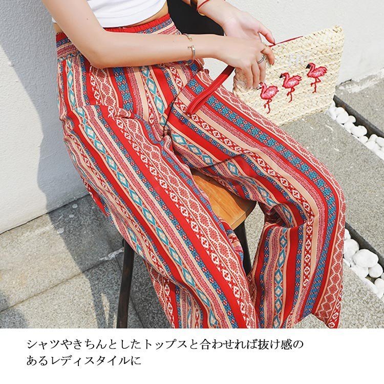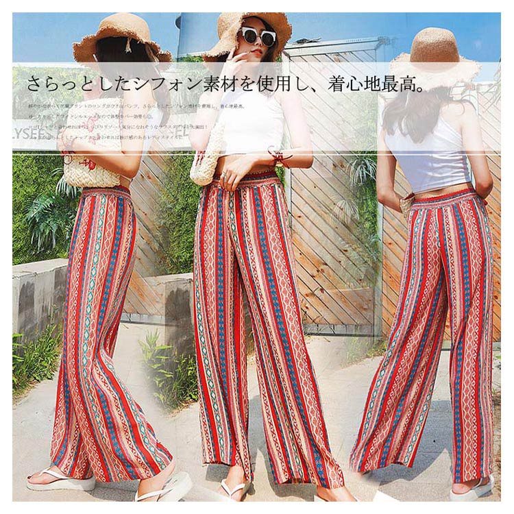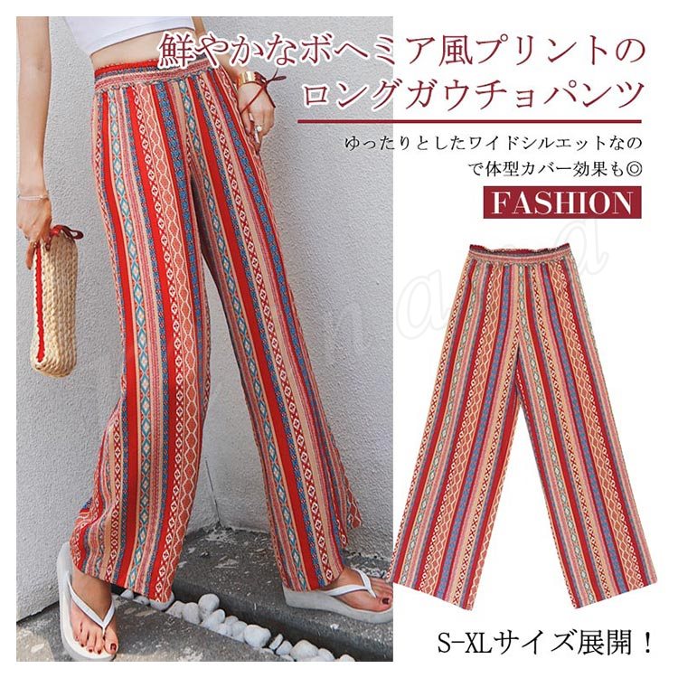 プリントワイドパンツ ワイドパンツ ガウチョパンツ レディース ワイド ロングパンツ 総柄 プリント リゾートパンツ カジュアル ウエストゴム