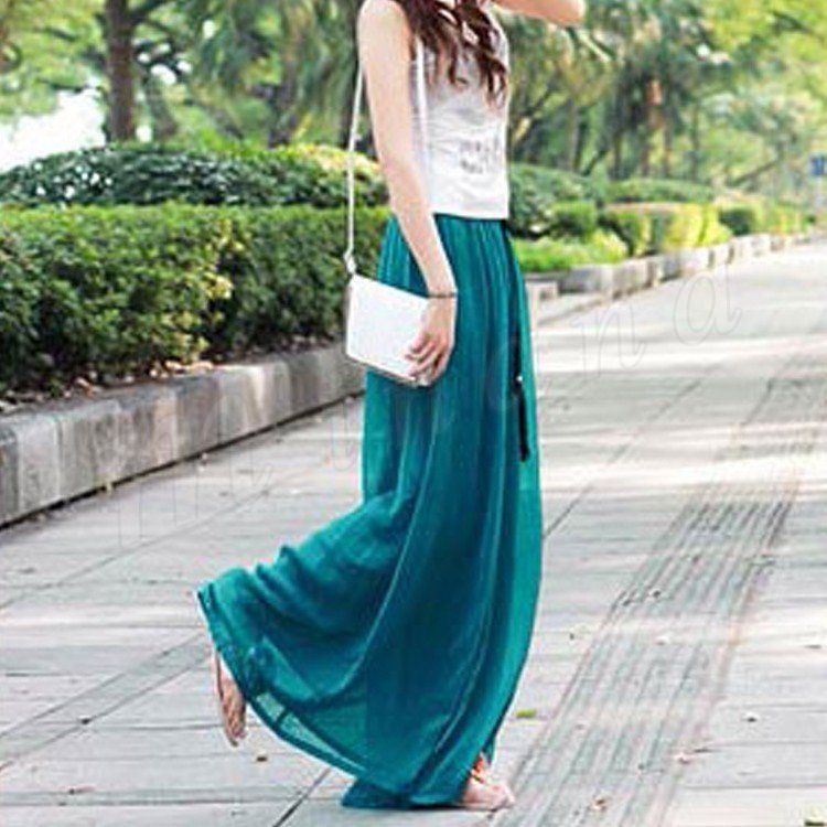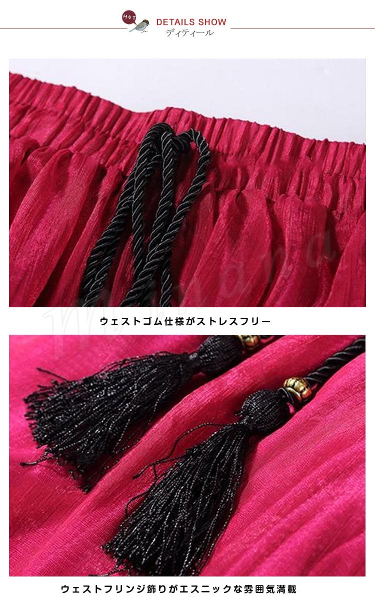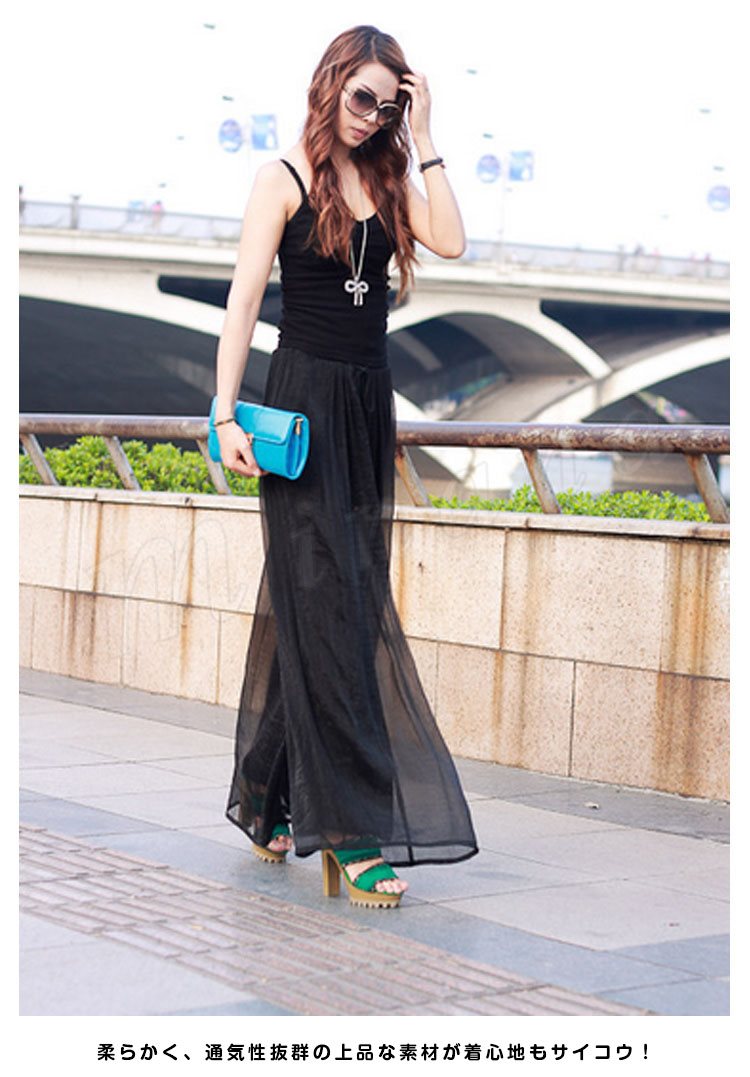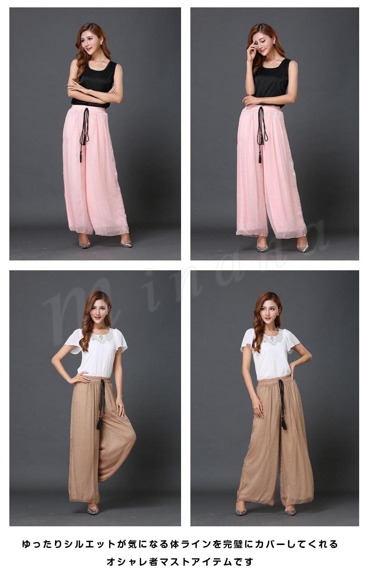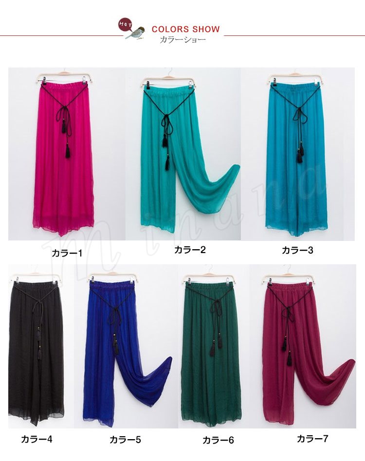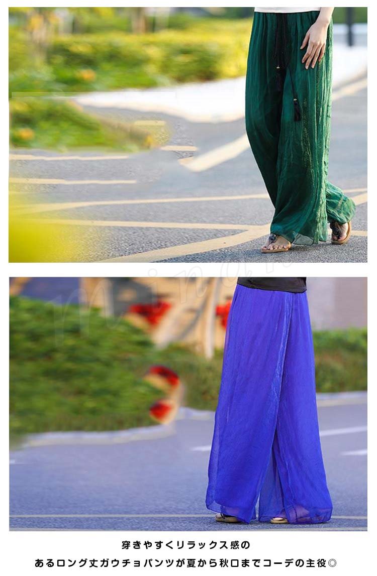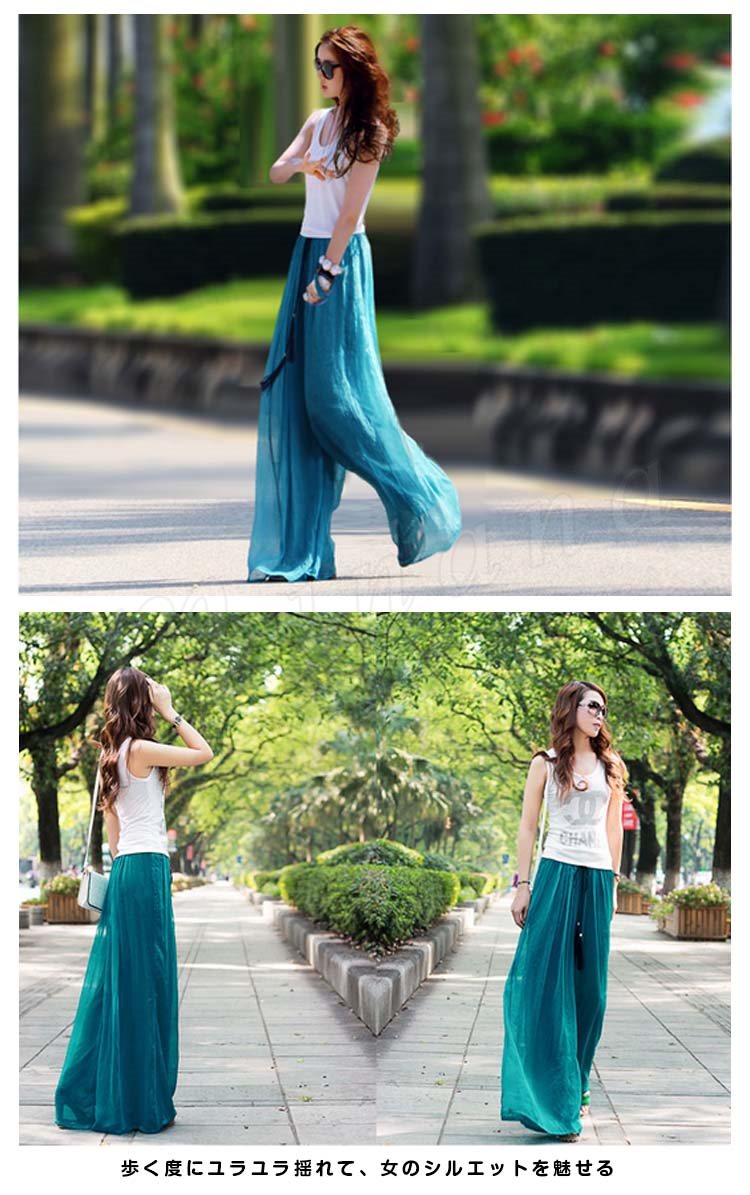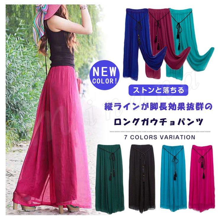 ゴムウェスト シフォン ロング ガウチョパンツ スカーチョ スカート風 キュロット プリーツ レディース 姫スタイル ボトムス ロングパンツ