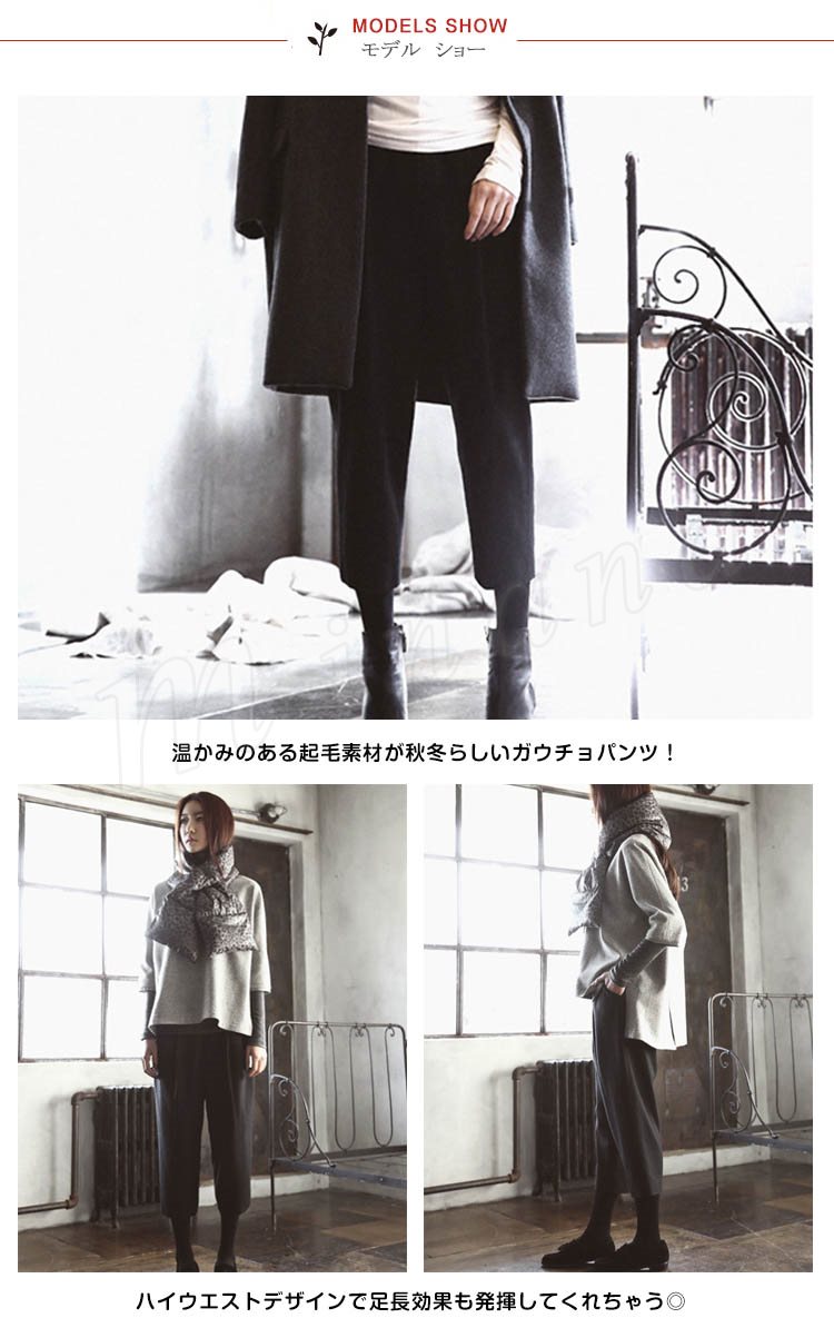 | 秋冬のシーズンムード漂うガウチョパンツの登場です。ふんわり起毛でシーズン感 UP♪ 温かみのある起毛素材が秋冬らしいガウチョパンツ! ハイウエストデザインで足長効果も発揮してくれちゃう◎ 柔らかくなめらかで独特の落ち感があり、歩く度にさらりと揺れる美しいドレープ がとっても女性らしい印象に◎ ハイネックニットやゆるめのシャツとマニッシュに品よく合わせるもヨシ◎ ざっくりニットやロングカーデを合わせて今季人気のゆるずるコーデも可愛い! クラシカルなお洒落コーデに一役買ってくれる頼れるボトム。 | |