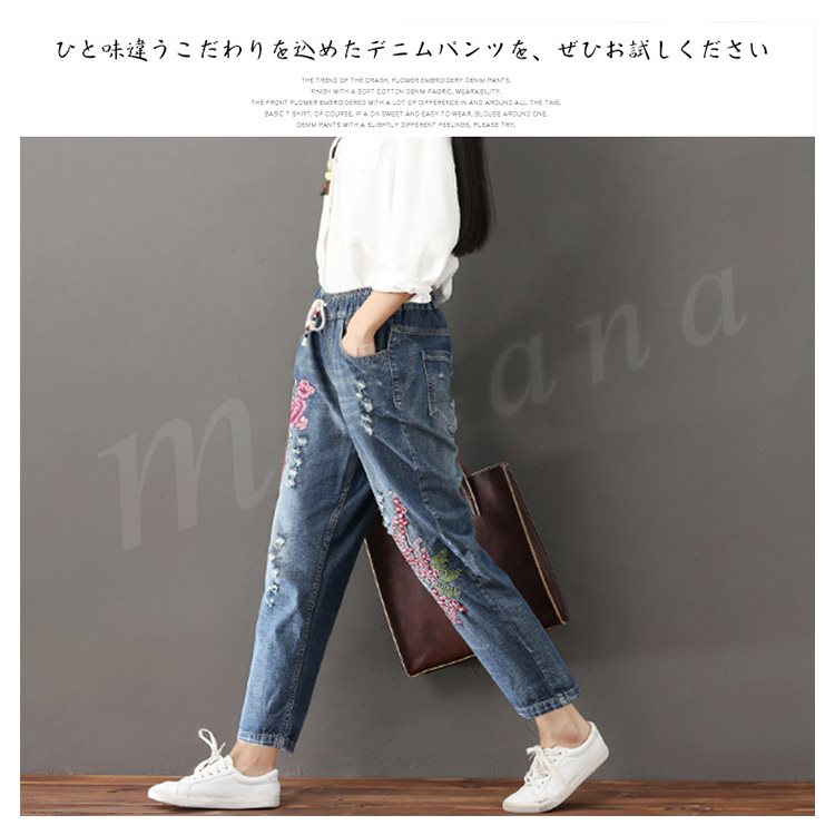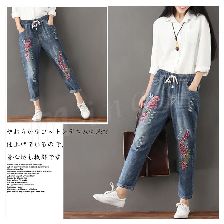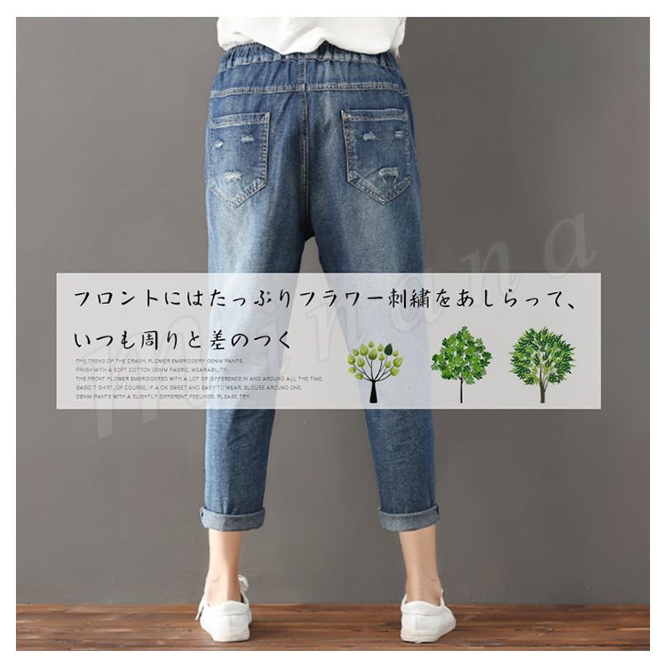 はっと目を引く、大人の花柄刺繍パンツ。デニムパンツ デニム刺繍パンツ 花柄刺繍 デニム パンツ ロングパンツ 9分丈 フラワー 刺繍 カジュア