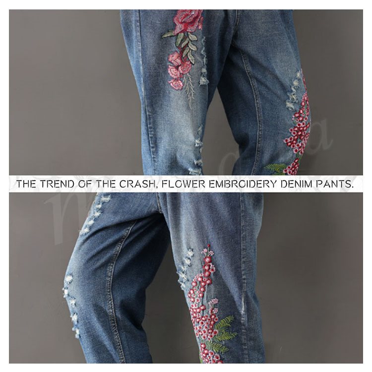 トレンドのクラッシュ、フラワー刺繍デニムロングパンツ。