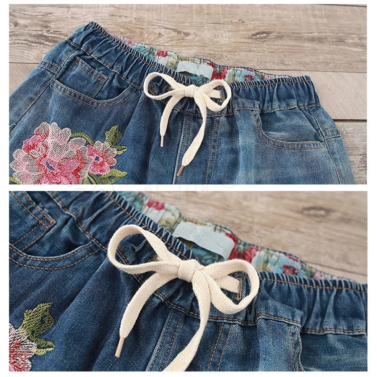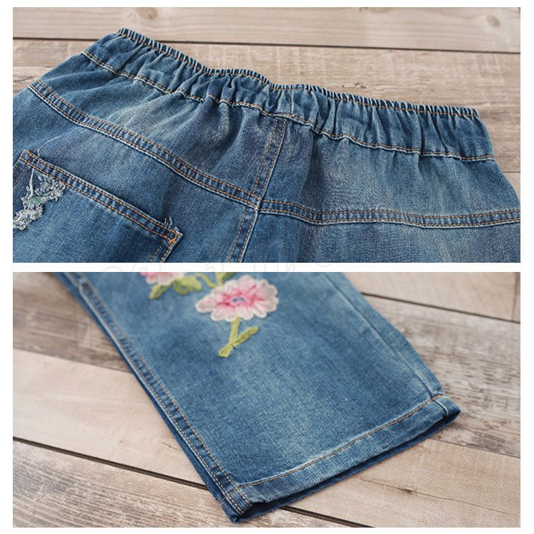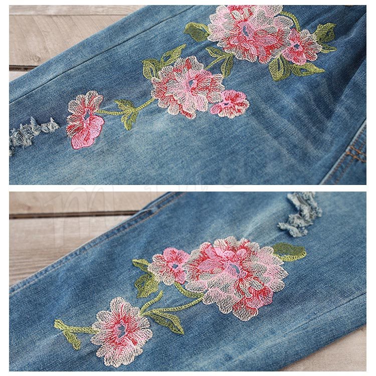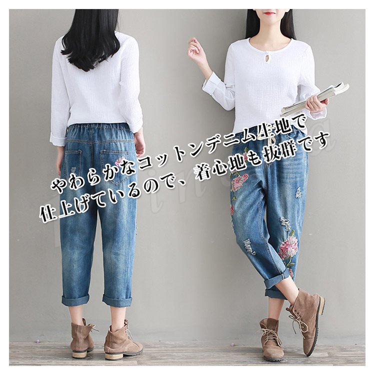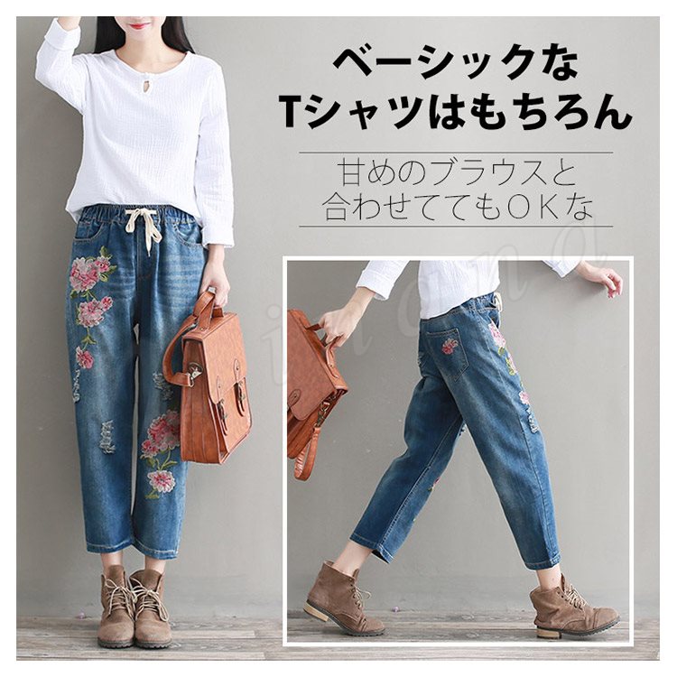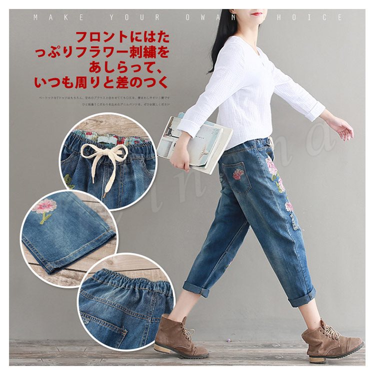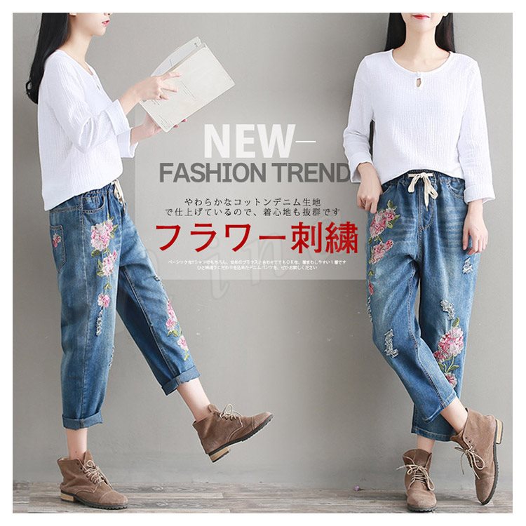 はっと目を引く、大人の花柄刺繍パンツ。デニムパンツ デニム刺繍パンツ 花柄刺繍 デニム パンツ ロングパンツ 9分丈 フラワー 刺繍 カジュア