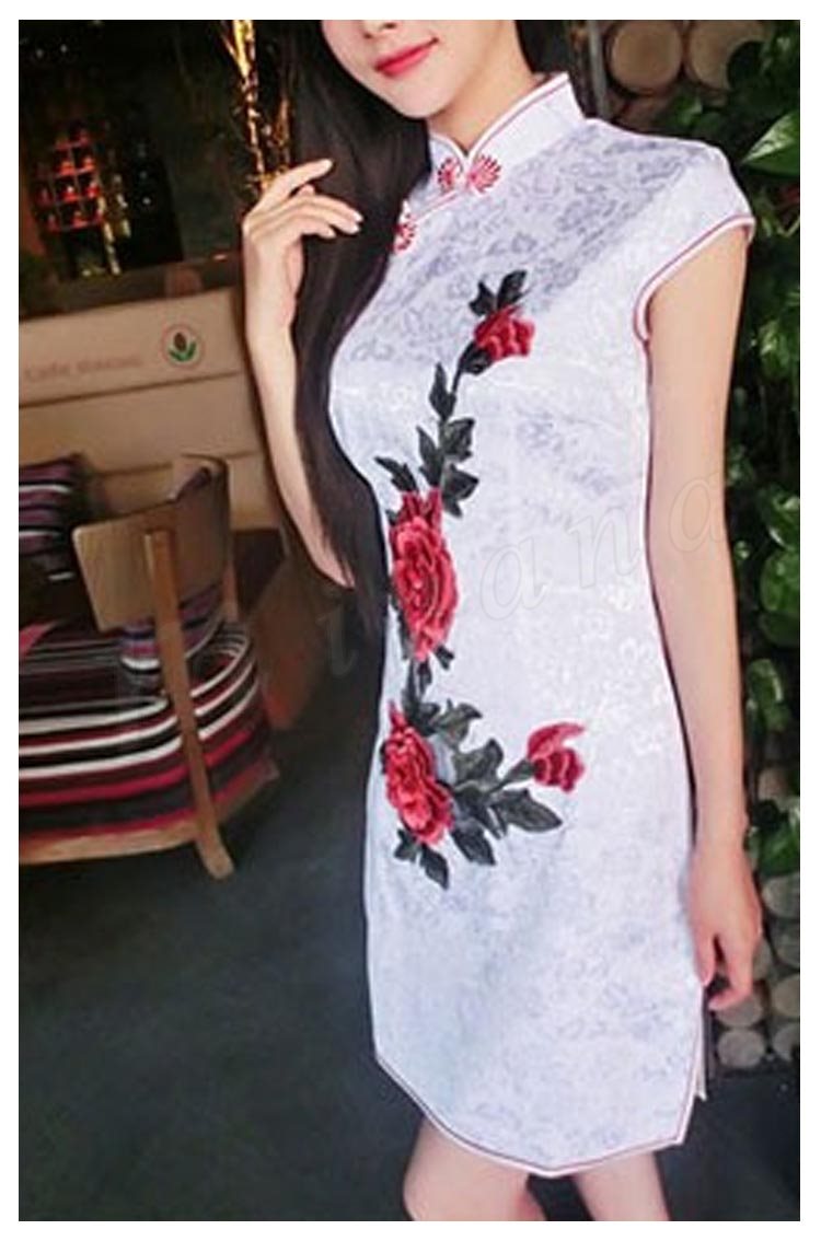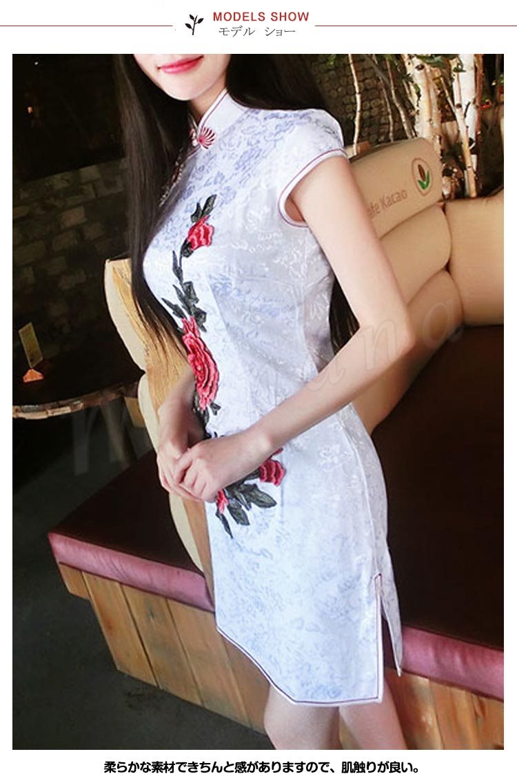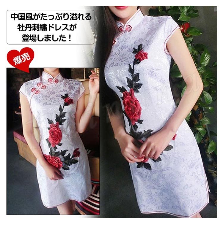 ショート花柄刺繍チャイナドレス立ち襟牡丹柄中国風ドレスエスニック風タイトワンピースチャイナボタン半袖夏ワンピース
