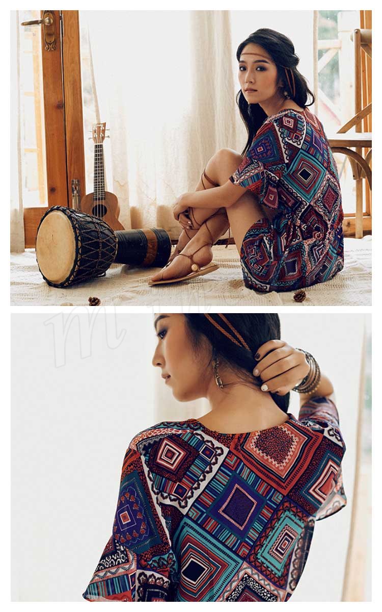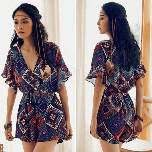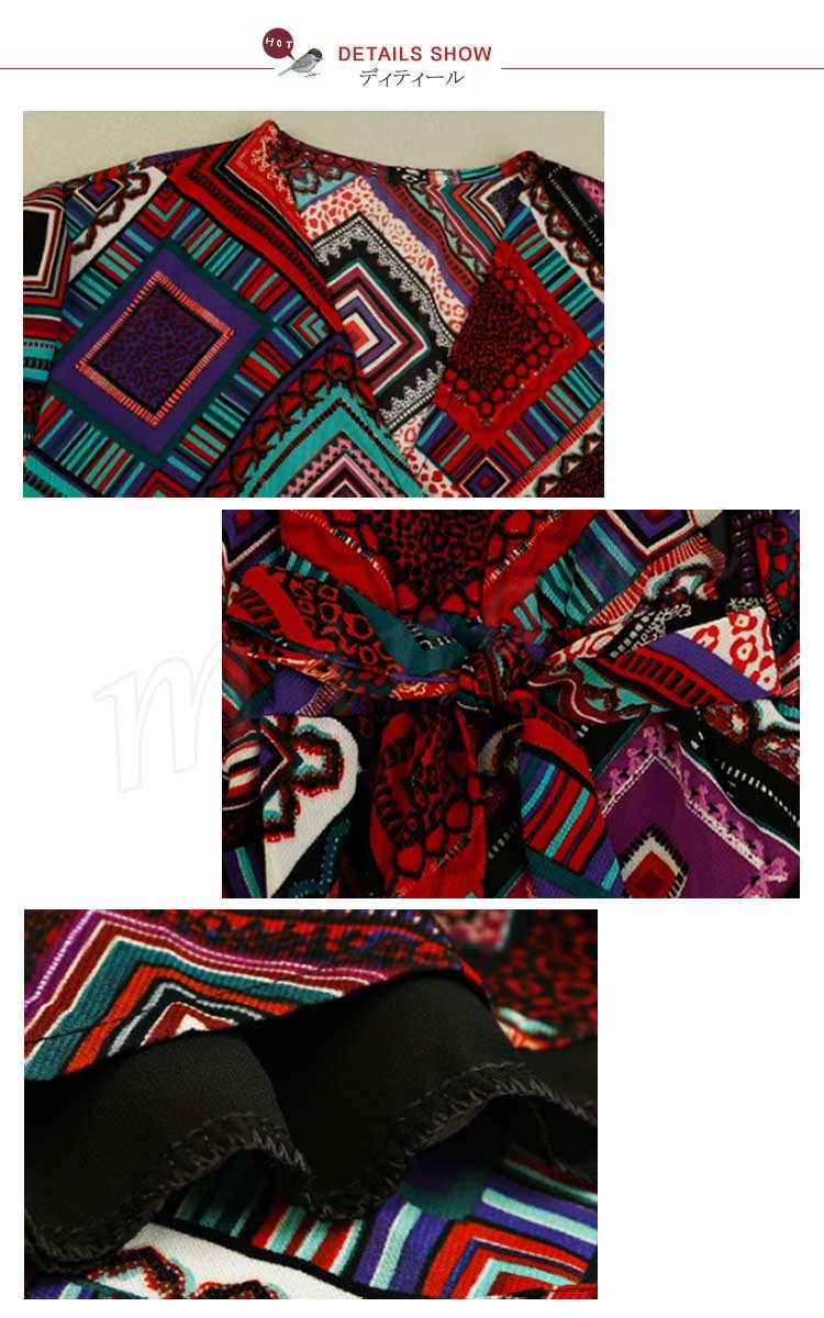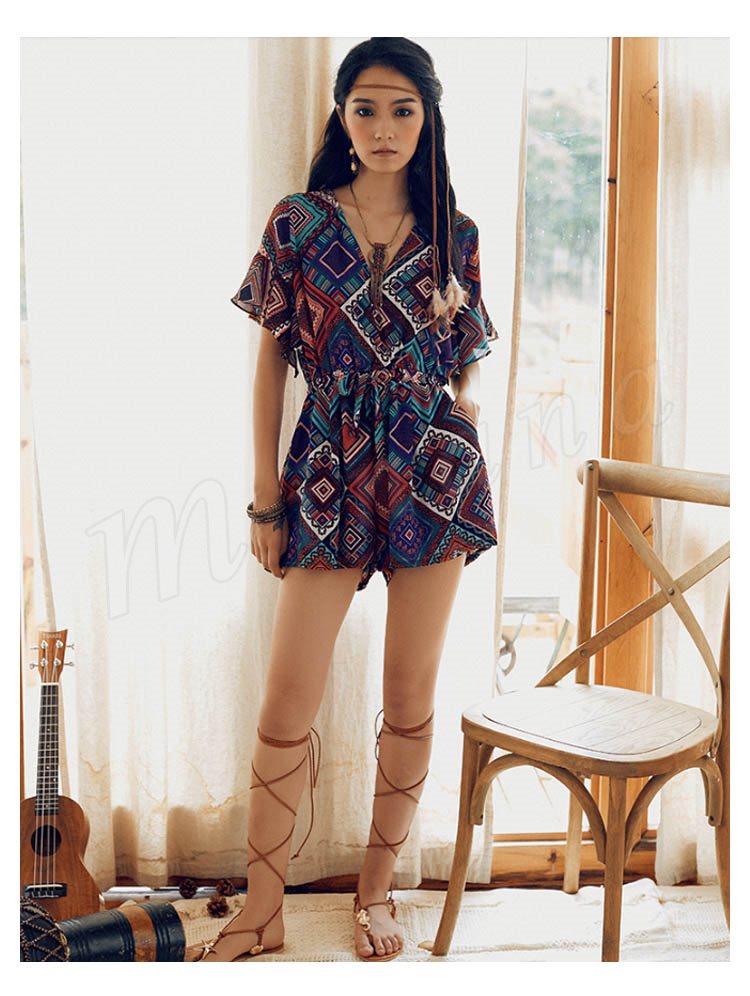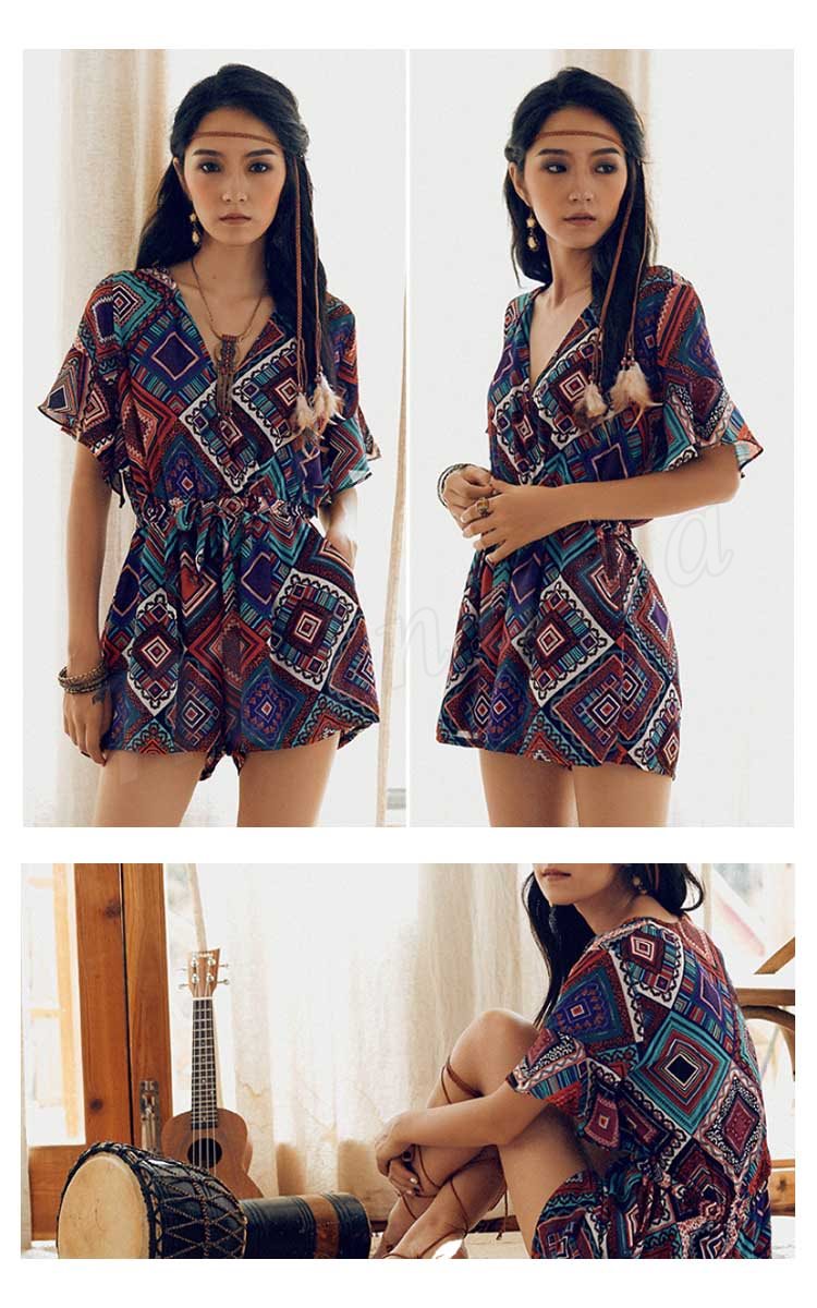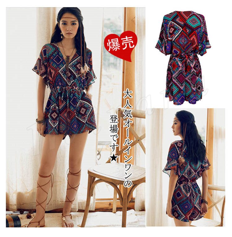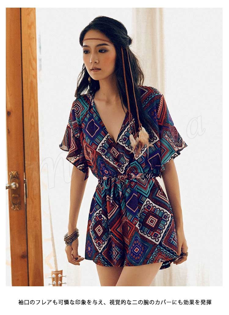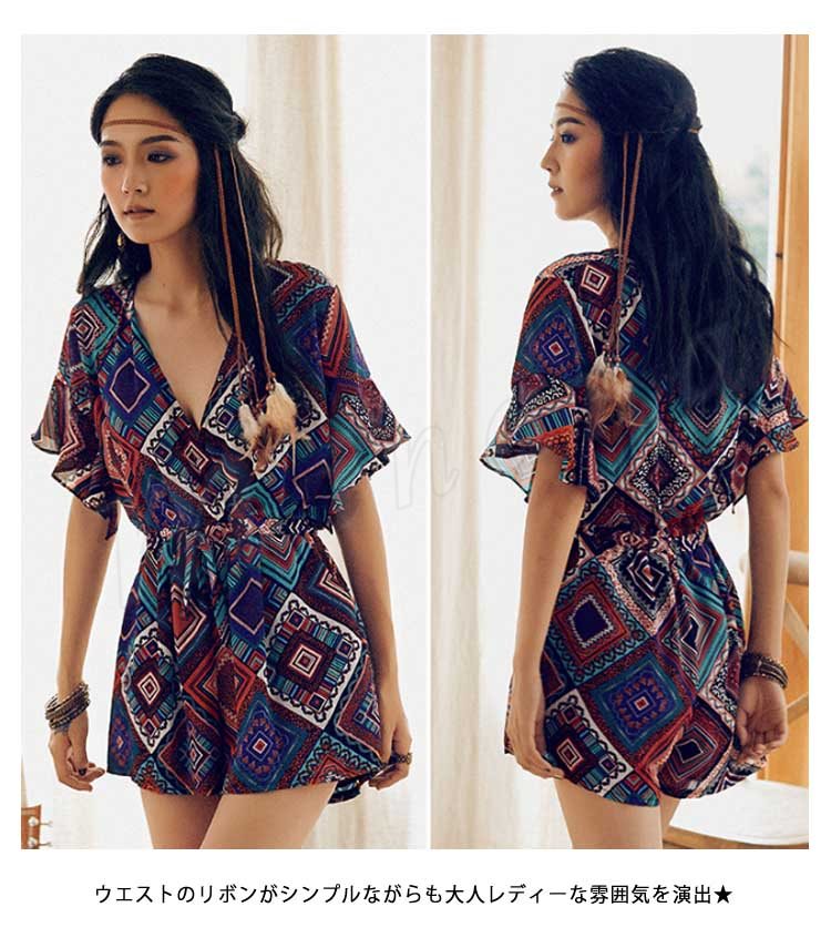ショートパンツオールインワンリボンサロペットパンツレディースVネックフリル袖フレア袖ボヘミア風着痩せ海外旅行民族風海リゾート