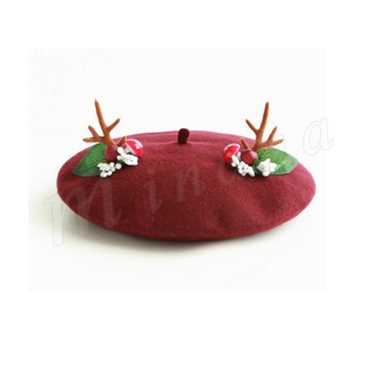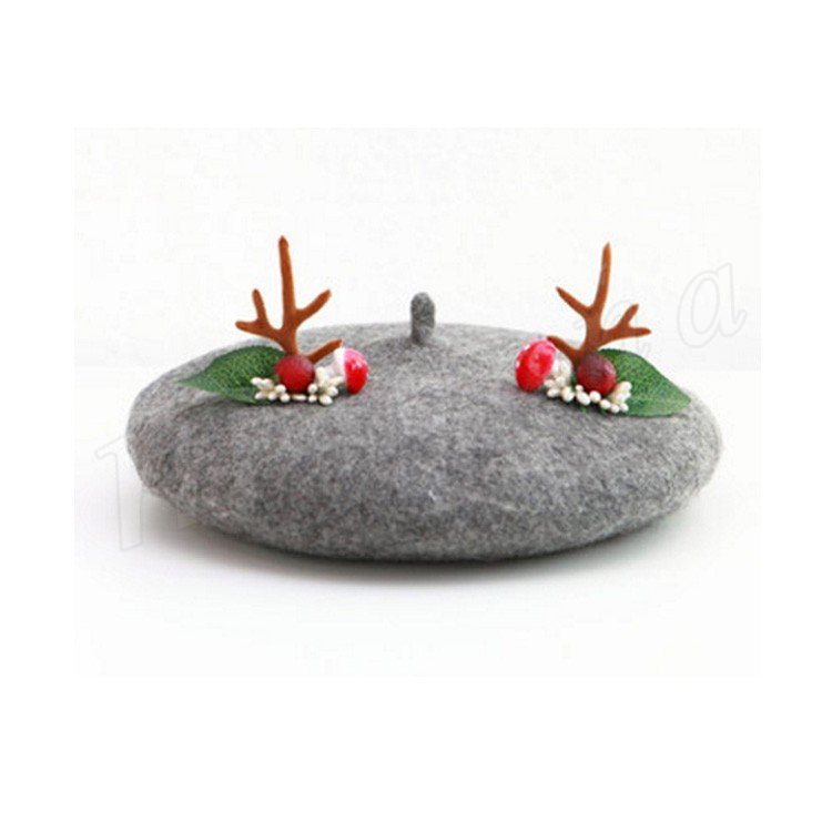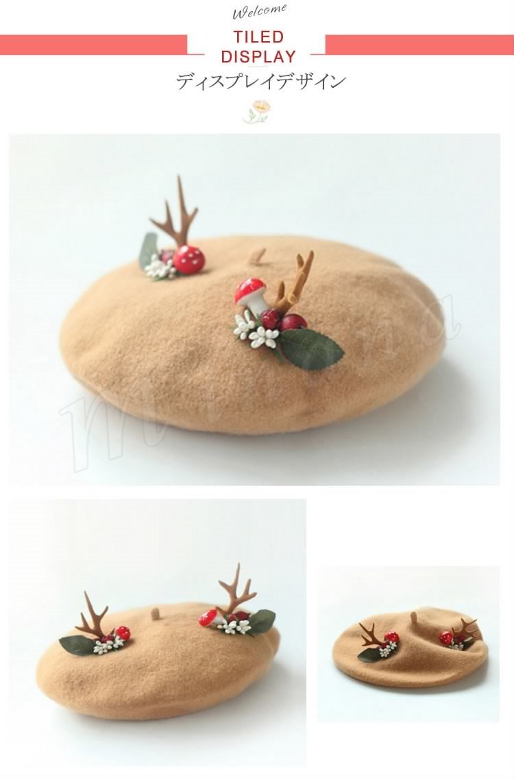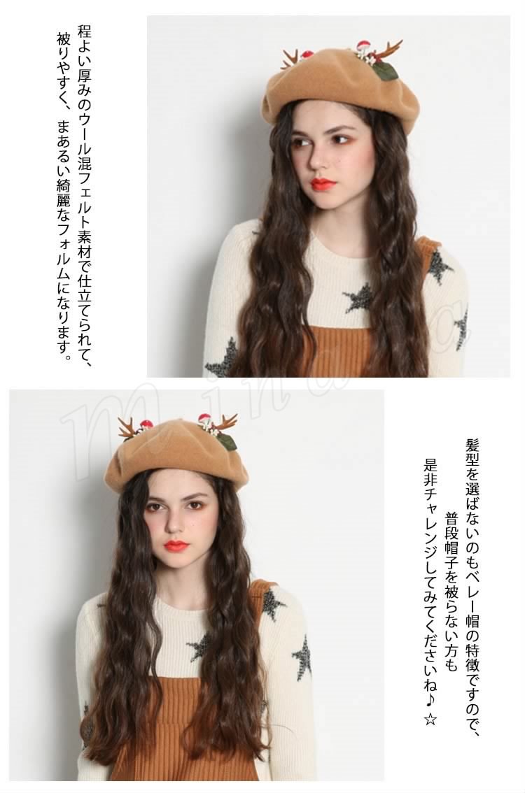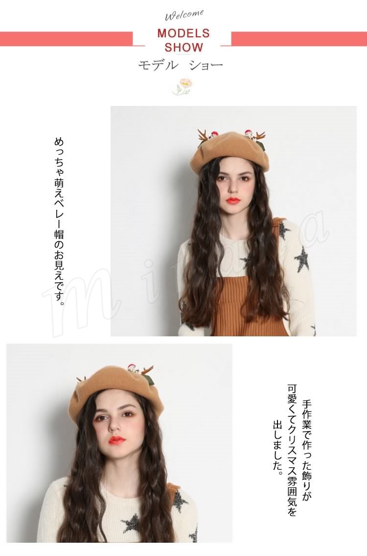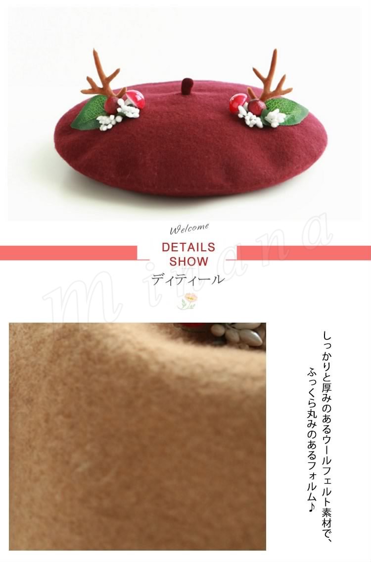 | めっちゃ萌えベレー帽のお見えです。 手作業で作った飾りが可愛くてクリスマス雰囲気を出しました。 程よい厚みのウール混フェルト素材で仕立てられて、被りやすく、まあるい綺麗なフォルムになります。 髪型を選ばないのもベレー帽の特徴ですので、普段帽子を被らない方も是非チャレンジしてみてくださいね♪ ☆ | |