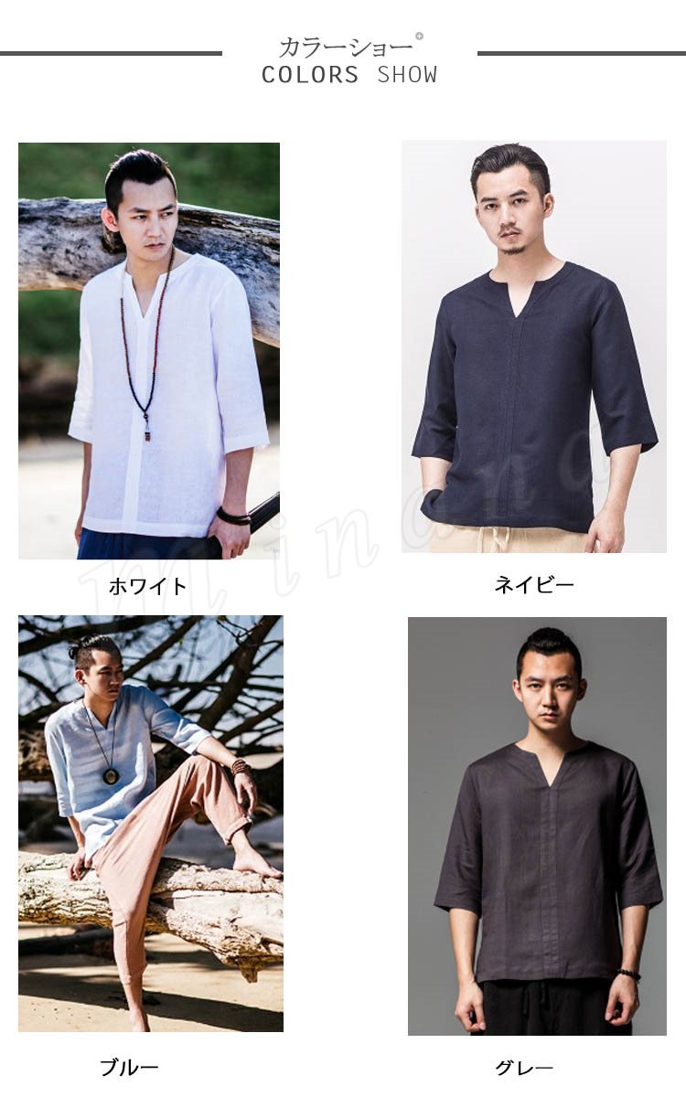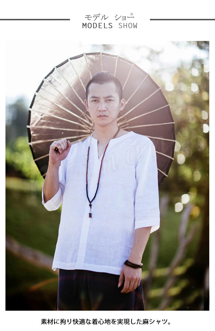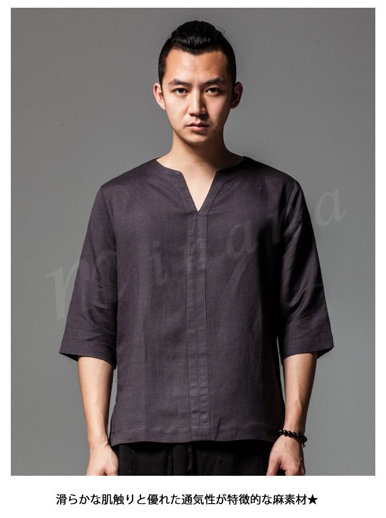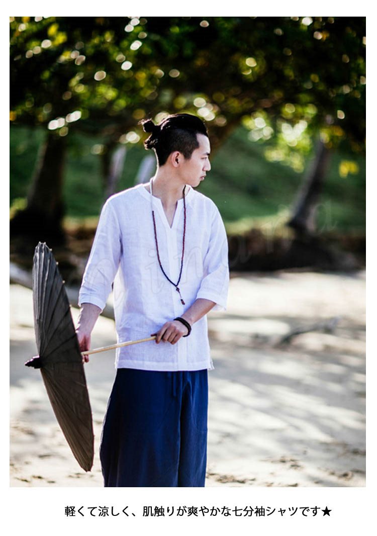 メンズシャツシャツリネンシャツ麻生地チャイナ風7分袖無地アジアン風リゾート感リラックスサマーシャツカジュアル襟切りエスニック