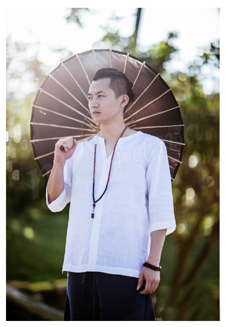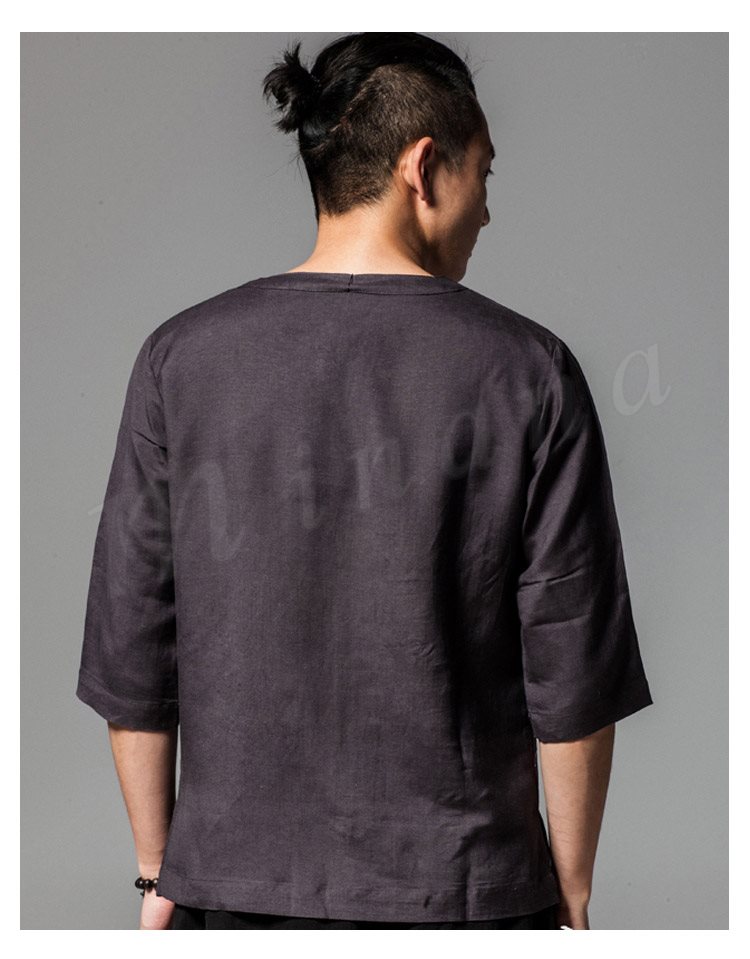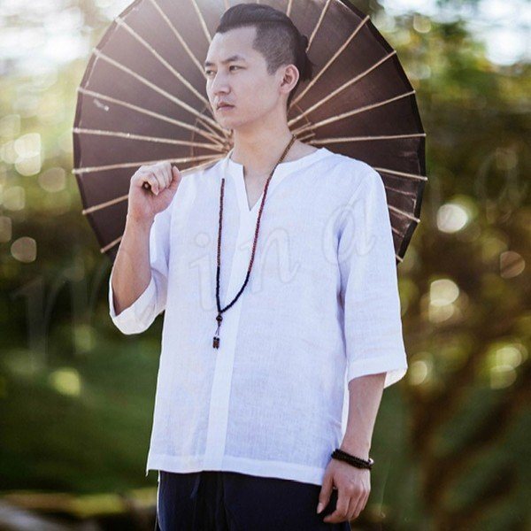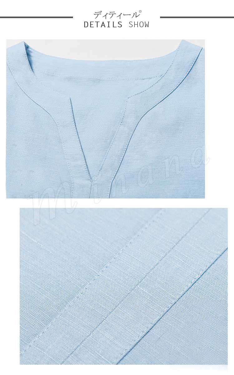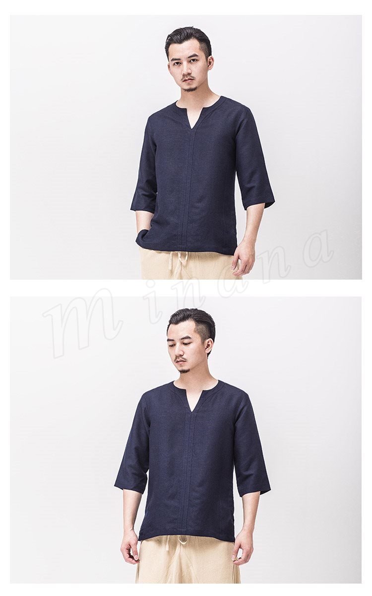 メンズシャツシャツリネンシャツ麻生地チャイナ風7分袖無地アジアン風リゾート感リラックスサマーシャツカジュアル襟切りエスニック