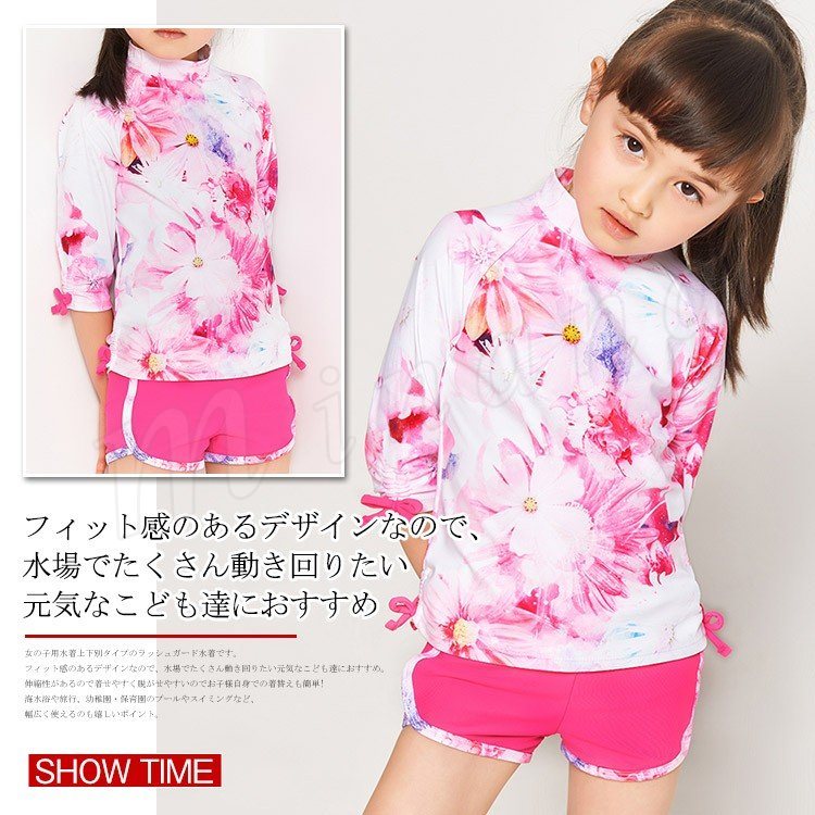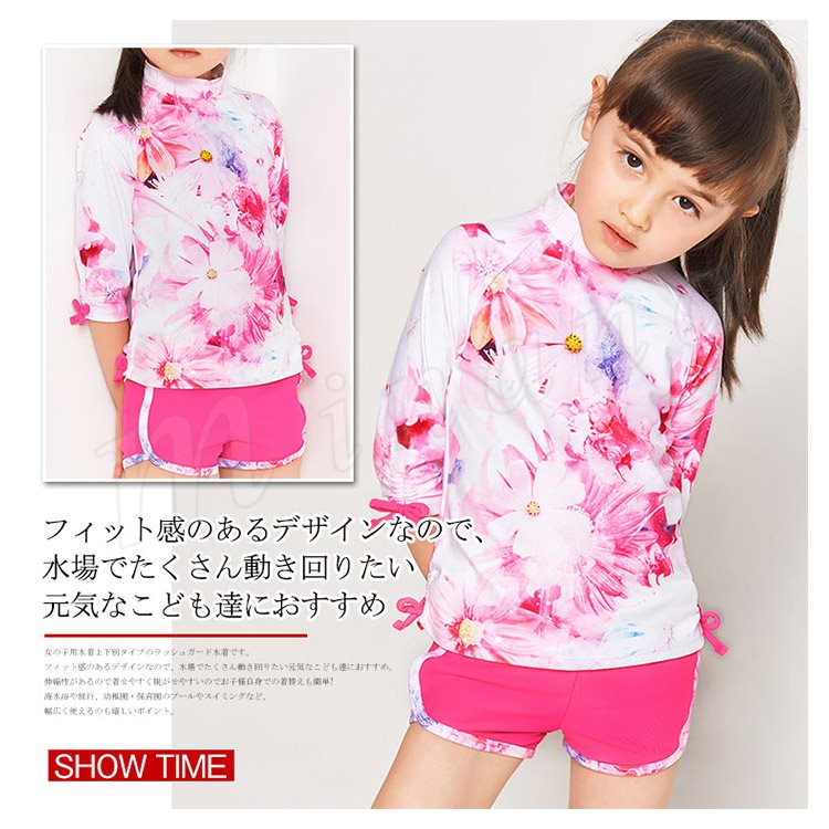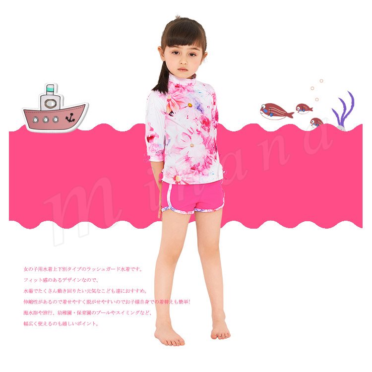 | 女の子用水着上下別タイプのラッシュガード水着です。 フィット感のあるデザインなので、水場でたくさん動き回りたい元気なこども達におすすめ。 伸縮性があるので着せやすく脱がせやすいのでお子様自身での着替えも簡単! 海水浴や旅行、幼稚園・保育園のプールやスイミングなど、幅広く使えるのも嬉しいポイント。 | |