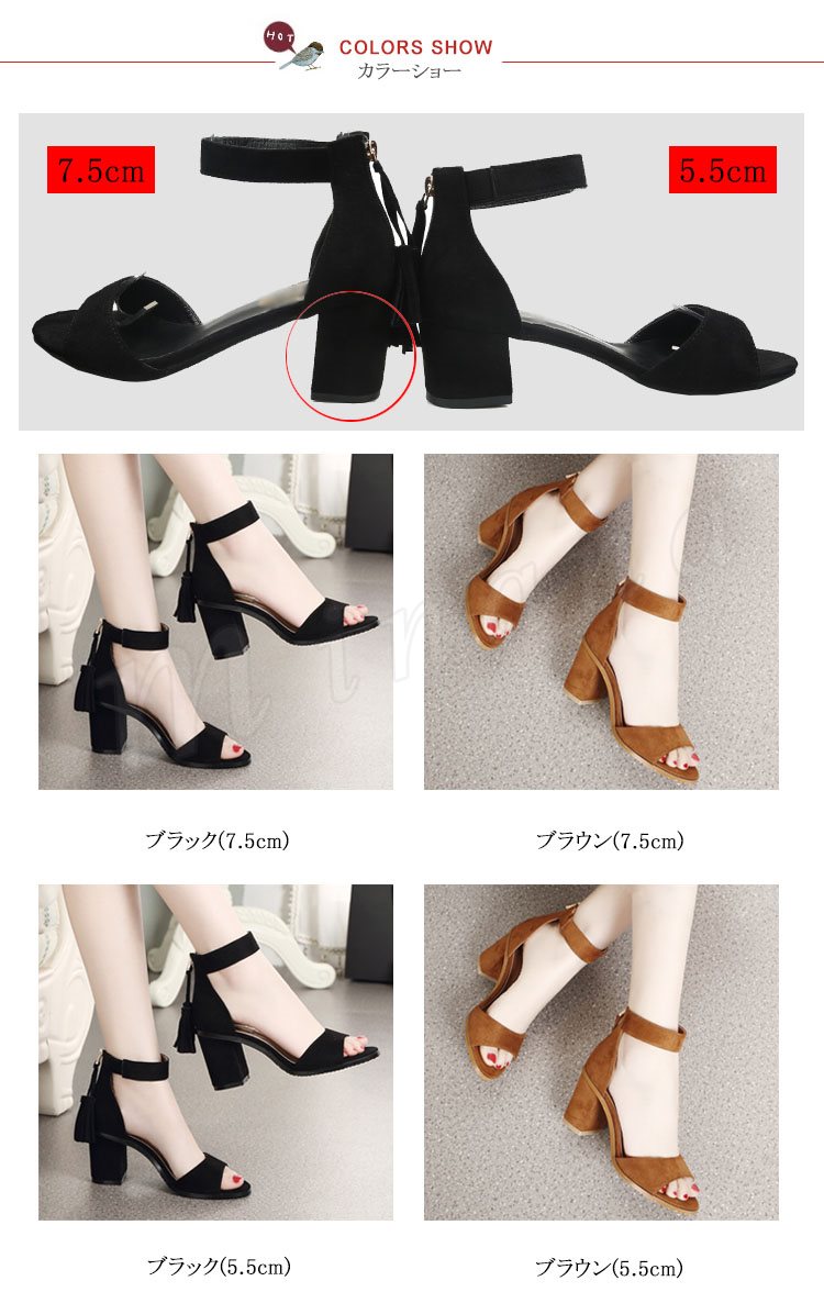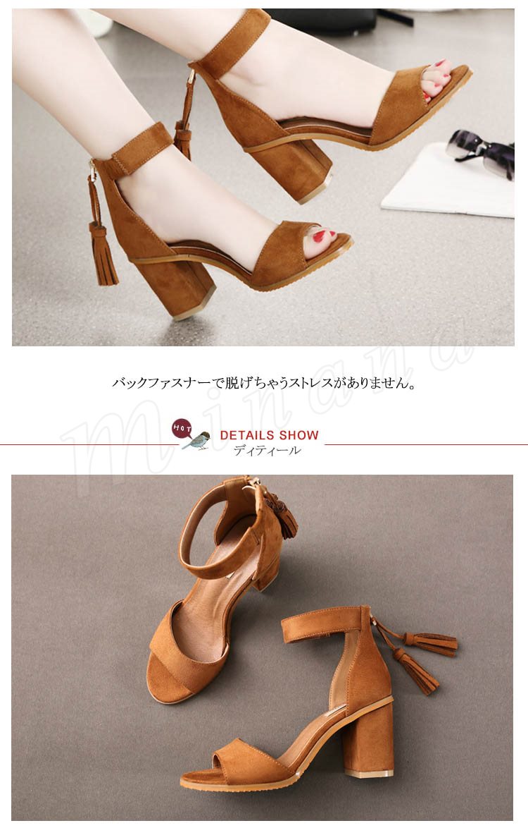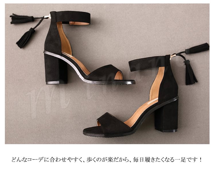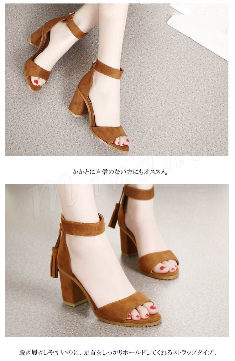 ひら揺れるタッセルがpoint。スエード調 ストラップ サンダル 太めヒール シューズ レディース ヒール ストラップサンダル 歩きやすい 美脚 シン
