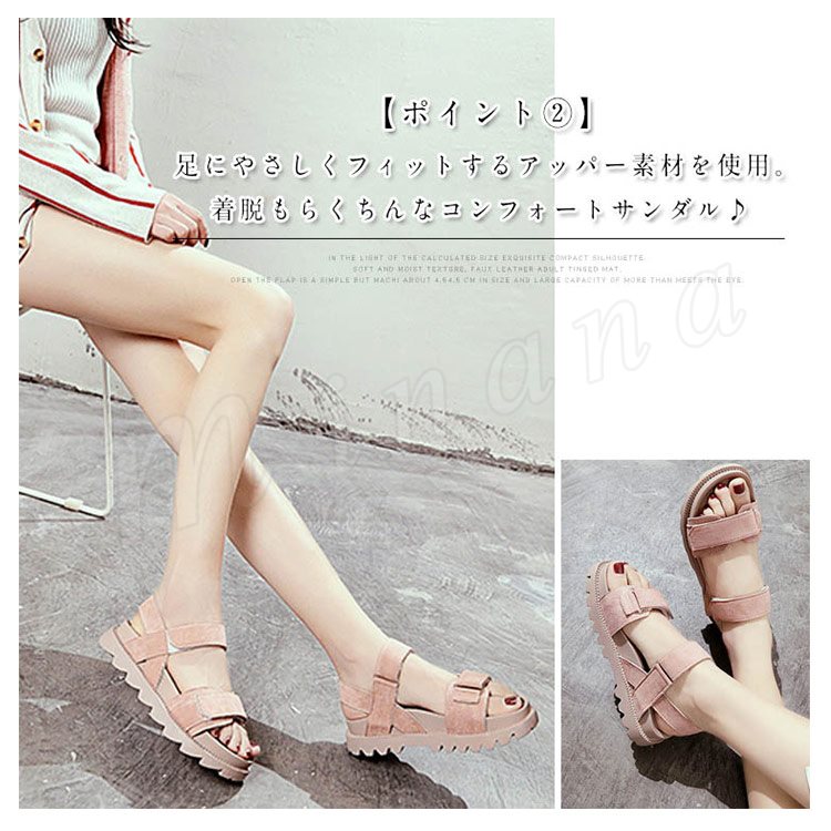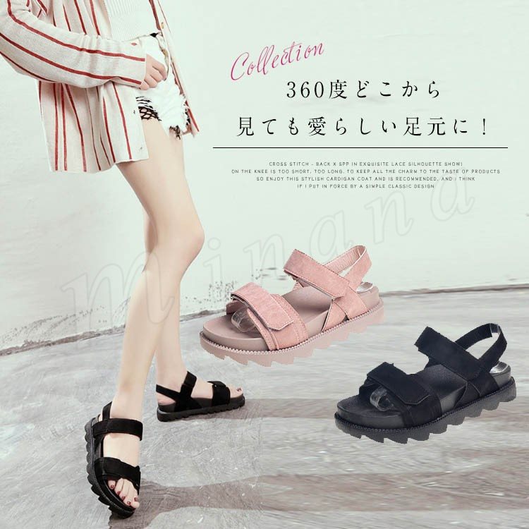 | シンプルでも存在感のあるスポーツサンダル 360度どこから見ても愛らしい足元に! 約4cmのローウェッジで美脚効果も期待できる! 普段使いや遊びに行って絶対に疲れたくない足に! | |