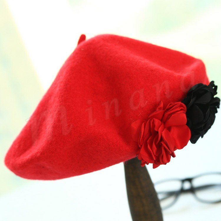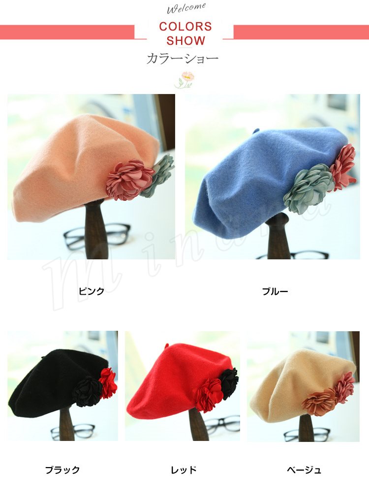 クラシカル フラワー付き カラーベレー帽 レディース ポッチ付き ウール ベレー帽 フェルト ベレー帽 ベレー 帽子 キャップ ハット 小顔