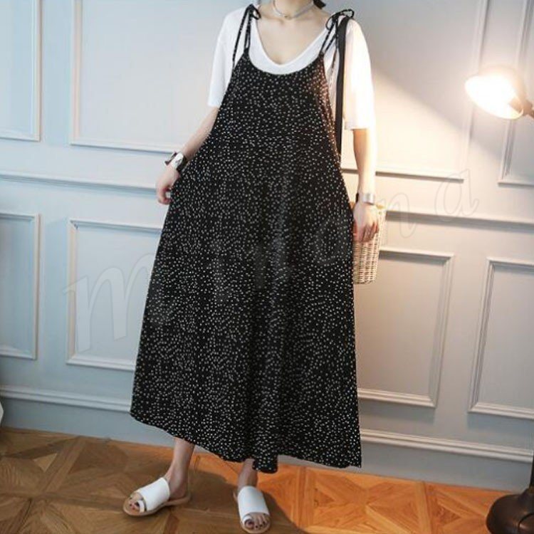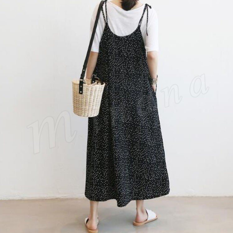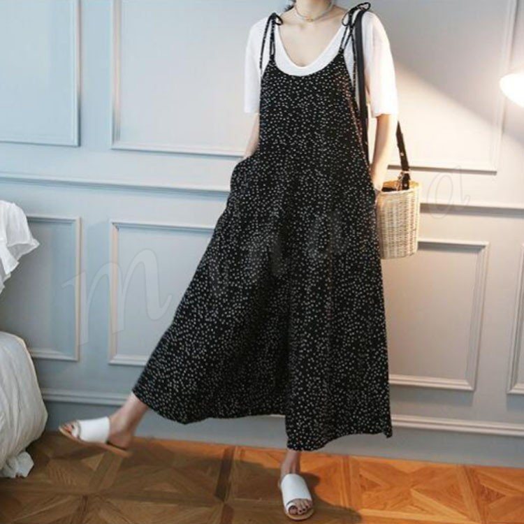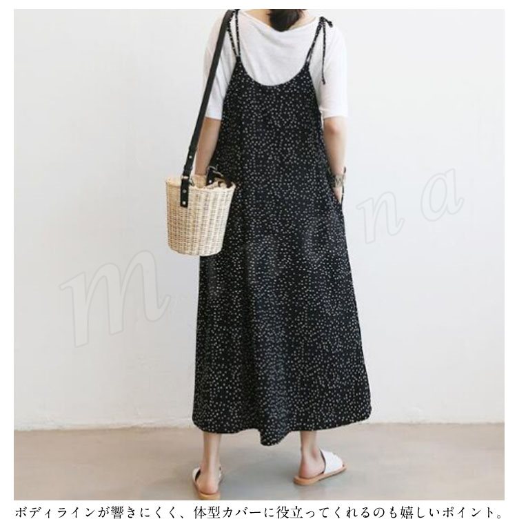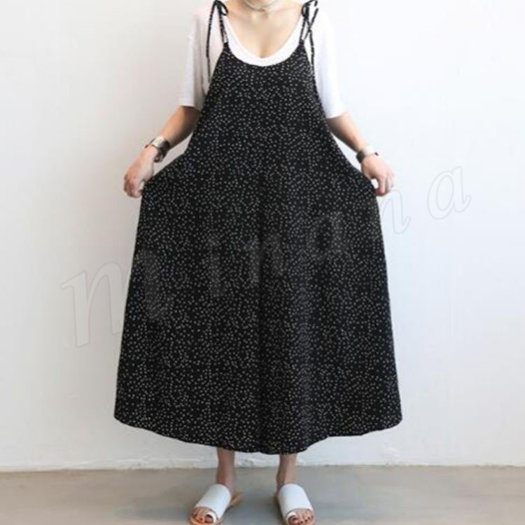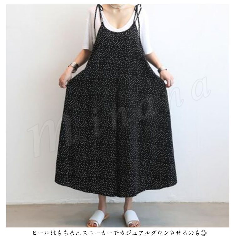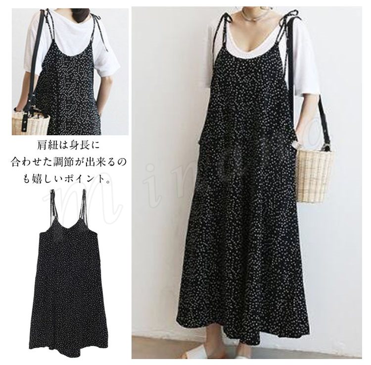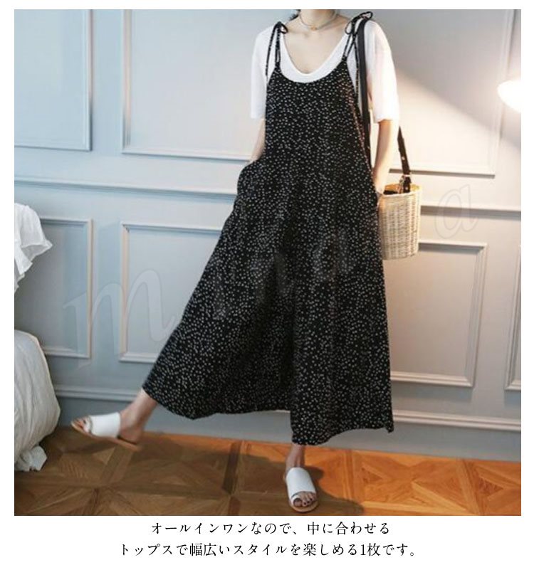 レディース オールインワン ワイドパンツ ドット柄 水玉キャミソール サロペット マキシ ガウチョパンツ シフォン ゆったり ロング丈 フリーサイズ