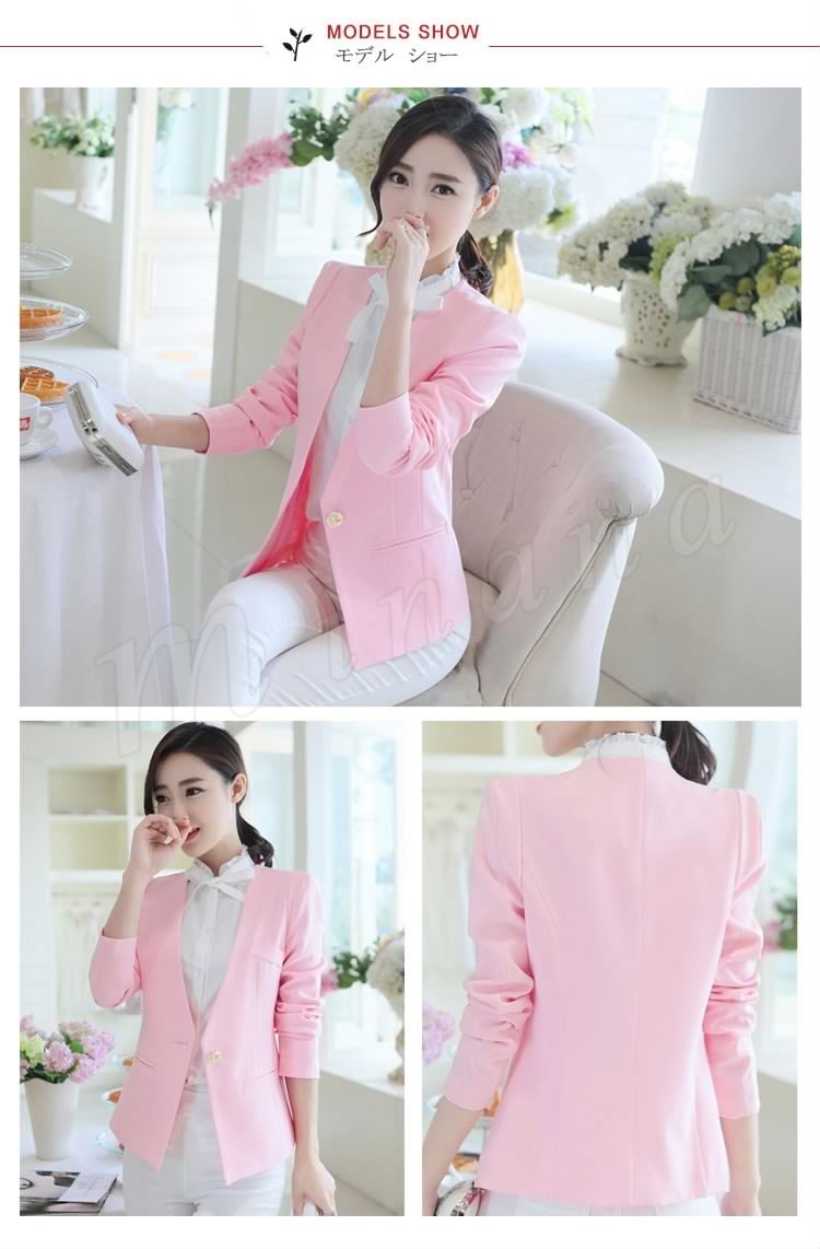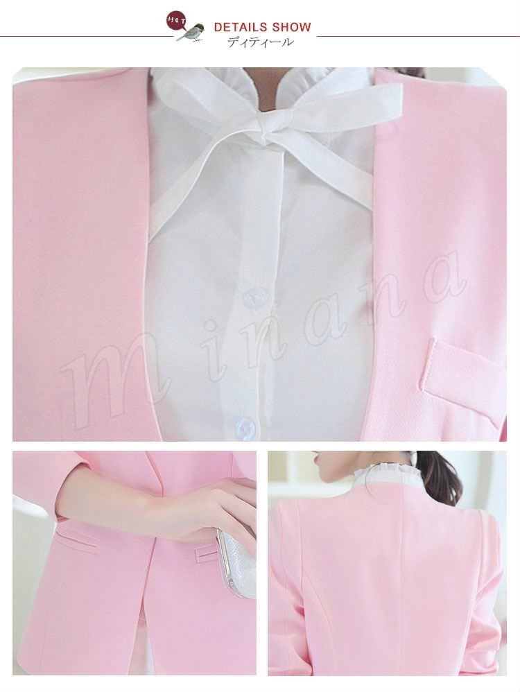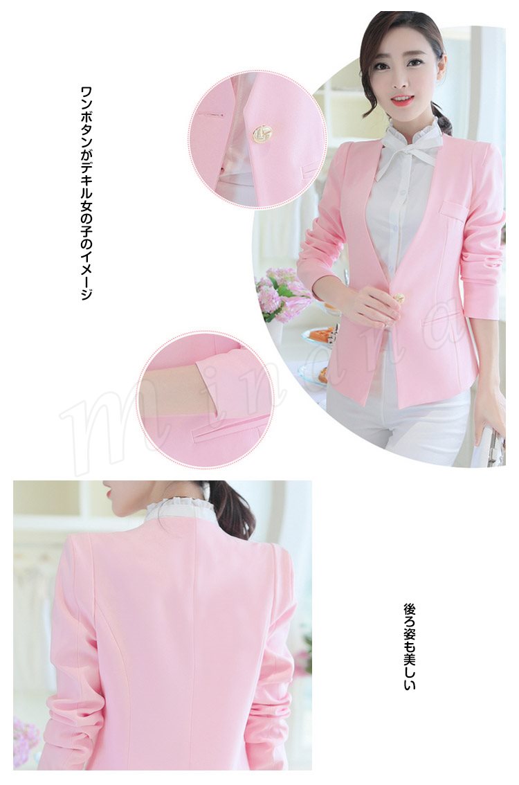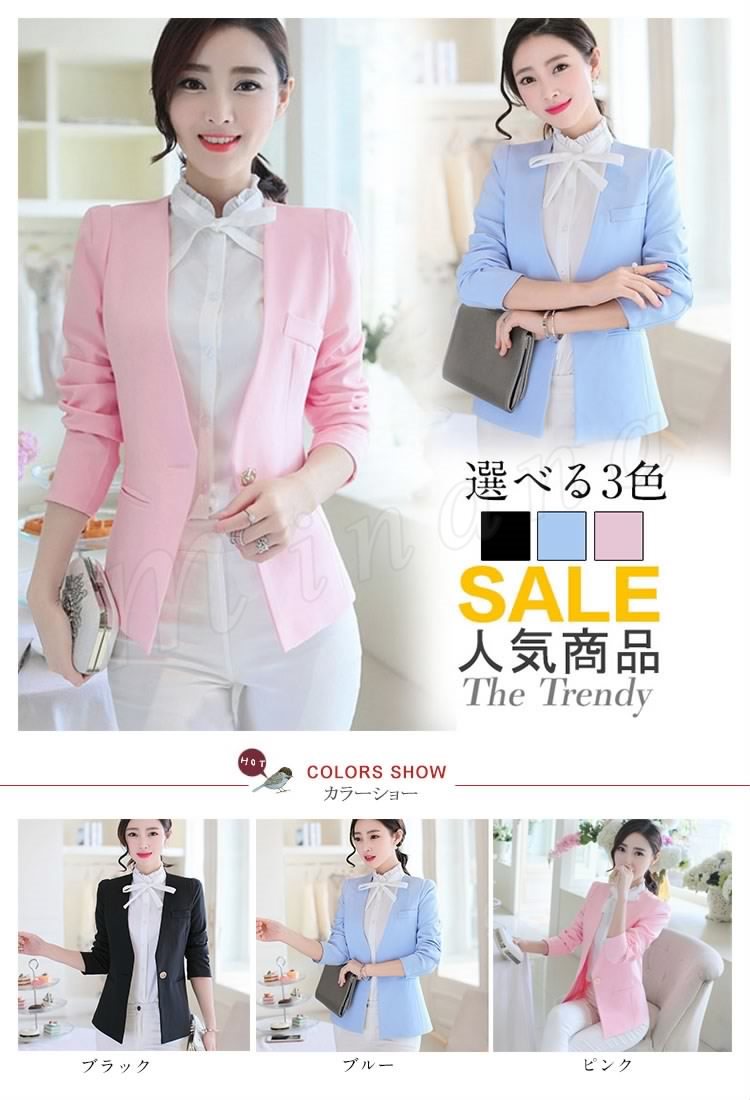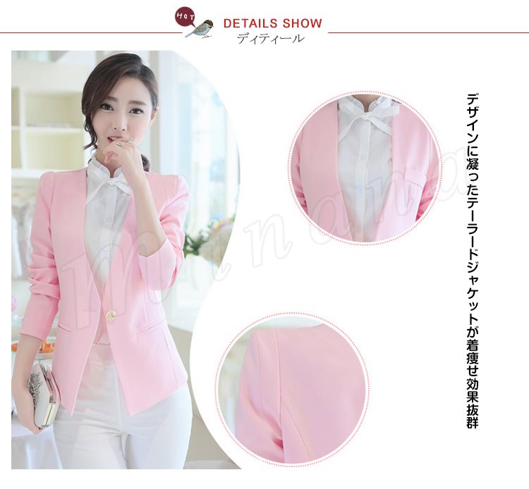| 個性的なノーカラーテーラードジャケット 女性の体ラインに優しくそって、美シルエットを演出♪ 清楚で上品なレディーススーツなので、様々なシーンにぴったり シンプルなデザインでデキル女のイメージを◎ | |