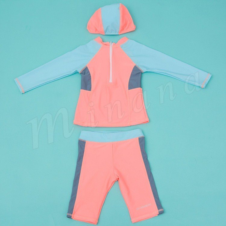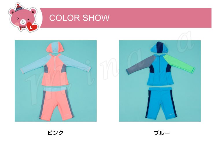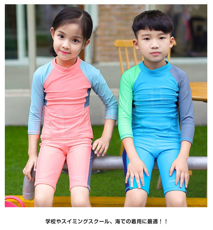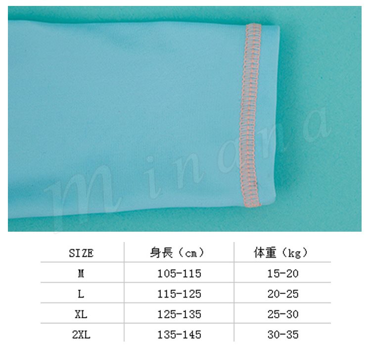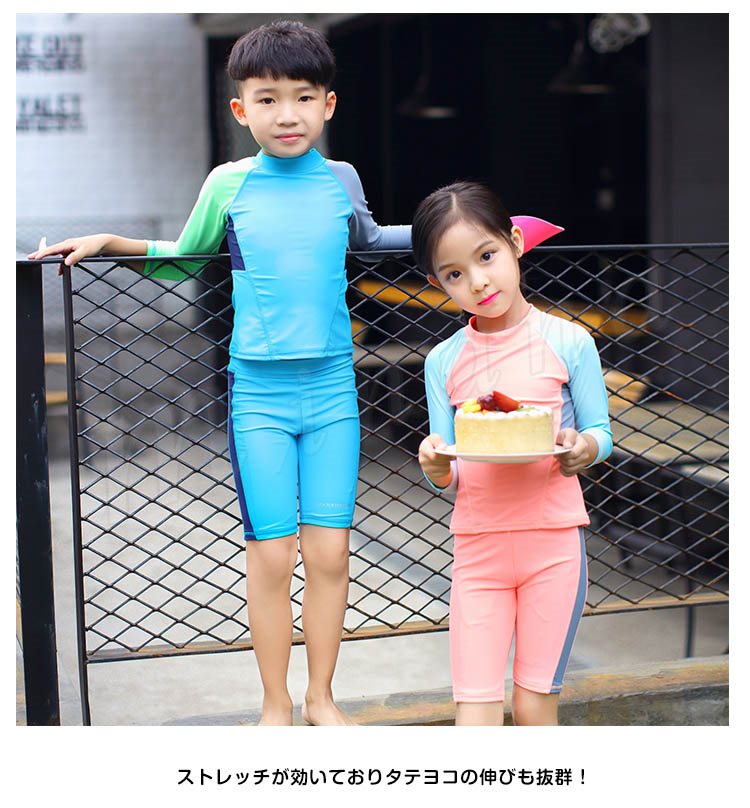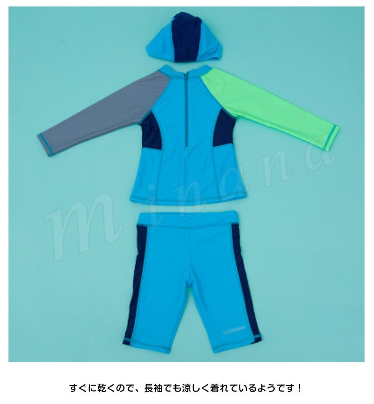 | トップス+パンツ+キャップの3点セットです。 学校やスイミングスクール、海での着用に最適!! ストレッチが効いておりタテヨコの伸びも抜群! 紫外線避けに肌着として着せています。 すぐに乾くので、長袖でも涼しく着れているようです! | |
