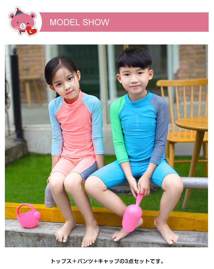 紫外線避けに。キッズ 水着 男女兼用 3点セット トップス+パンツ+キャップ 水着 男の子 女の子 スイムウェア スクール水着 子供 ジュニア