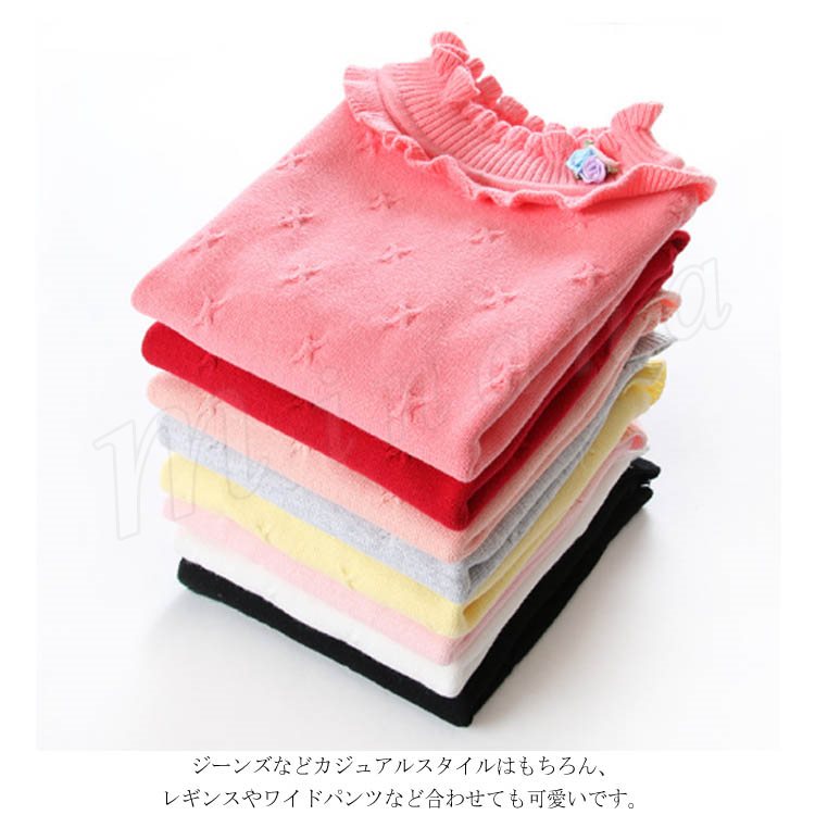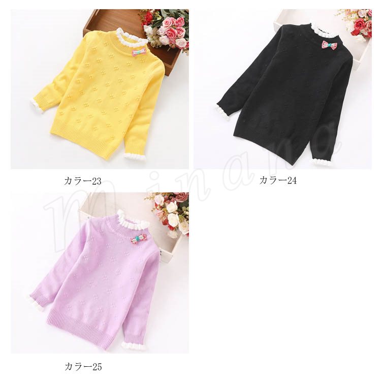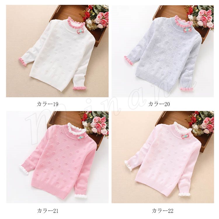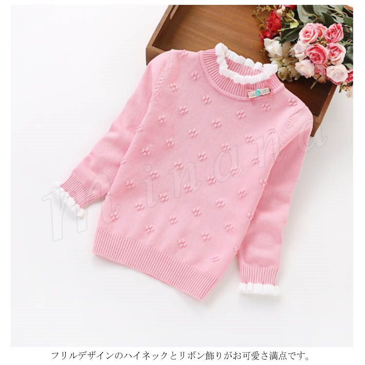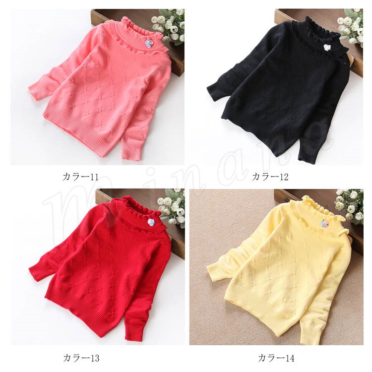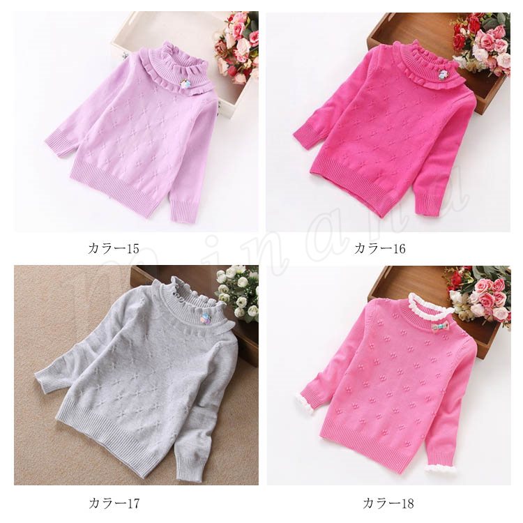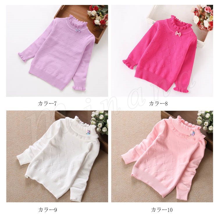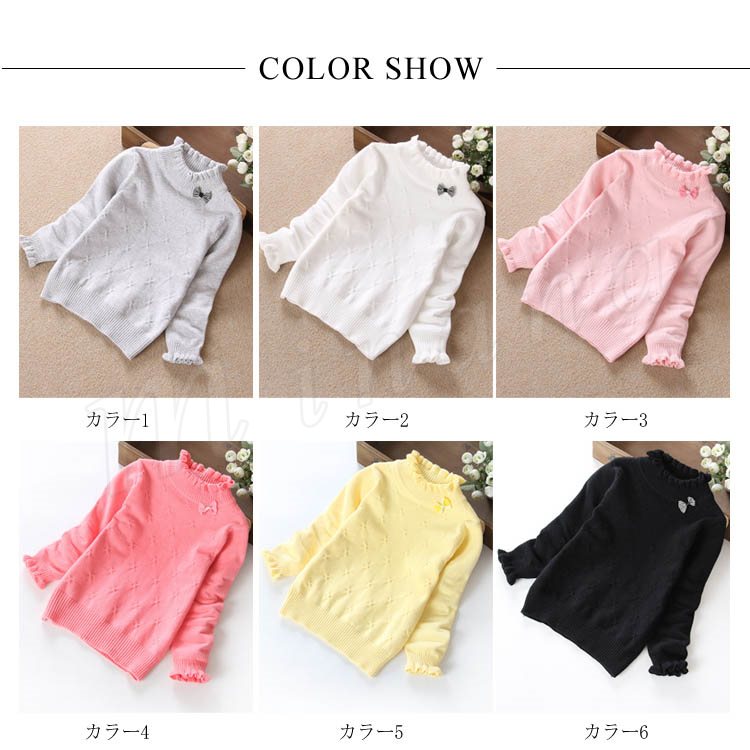 | 子供に向け超可愛い長袖ニットプルオーバーが登場です。 フリルデザインのハイネックとリボン飾りがお可愛さ満点です。 春秋の時、一枚だけご着用でき、冬の時インナーとして、外にジャケットやコートをカバーしても窮屈感もなし。 ジーンズなどカジュアルスタイルはもちろん、レギンスやワイドパンツなど合わせても可愛いです。 | |