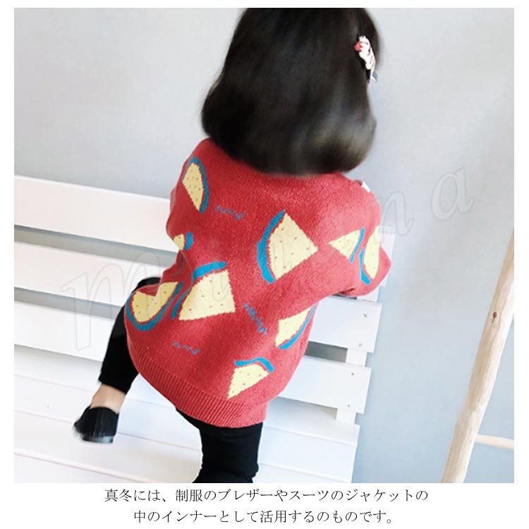 | とっても肌触りのいいニットセーターです。 真冬には、制服のブレザーやスーツのジャケットの中のインナーとして活用するのものです。 しっかりとした生地で、暖かく、これからの季節にぴったりの1枚です。 幼稚園、小学校などの通園、通学などにデイリーに使える1枚、可愛いデザインでプレゼントにしてもいい選別です。 | |