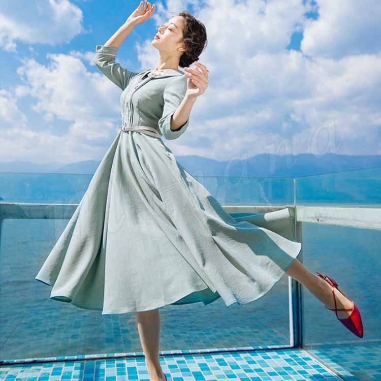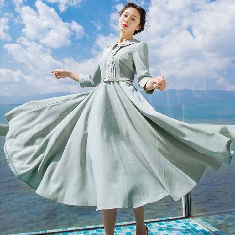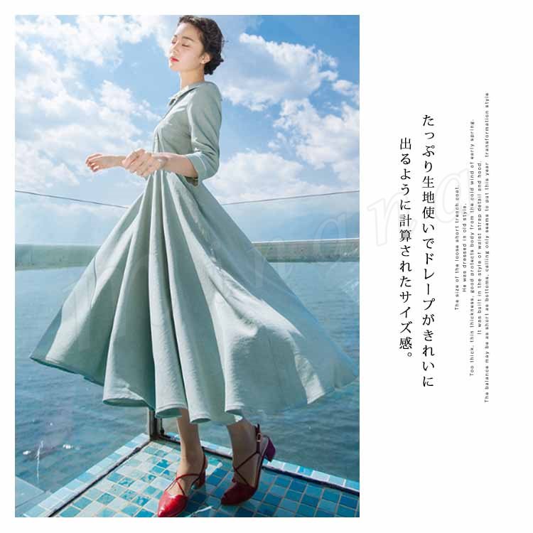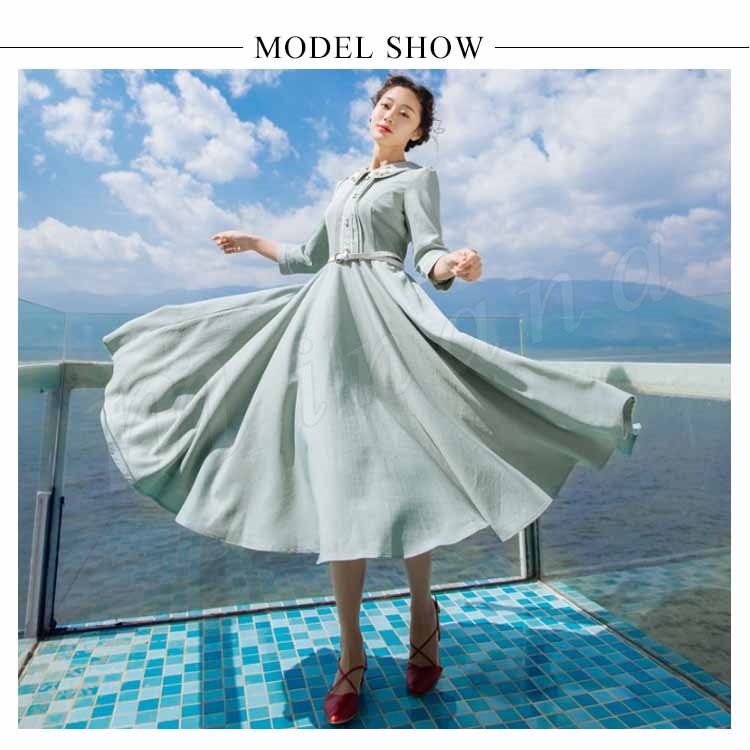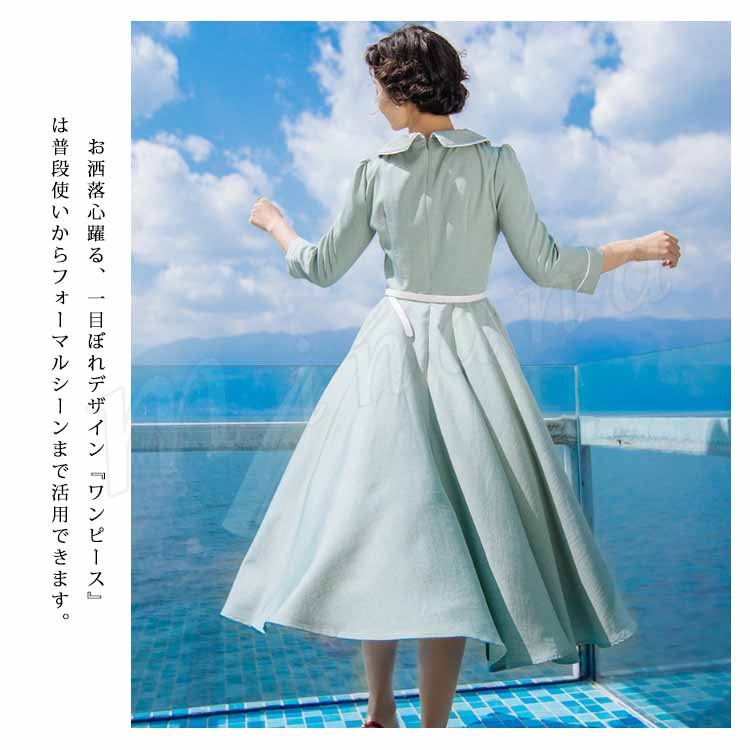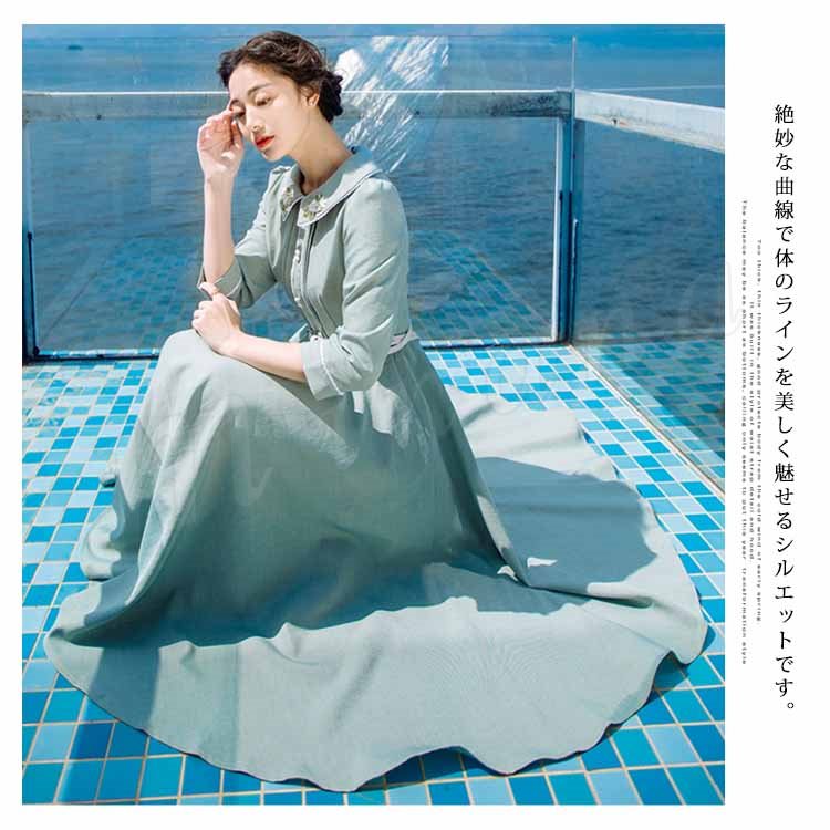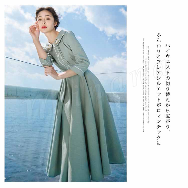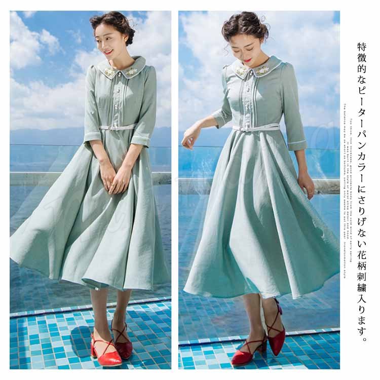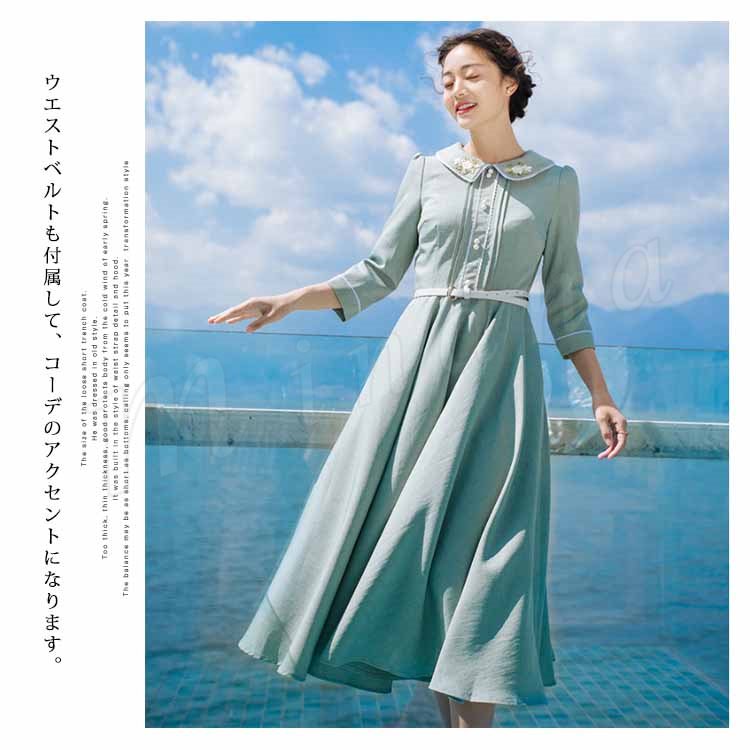 さりげない花柄刺繍入り。トレロワンピース レディース 丸襟ワンピース 七分袖 ロングワンピース ミモレ丈 フレアワンピース ハイウエスト ベルト付き