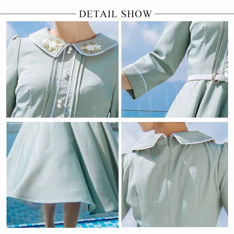 | 今季イチオシのミモレ丈七分袖ワンピース。 特徴的なピーターパンカラーにさりげない花柄刺繍入ります。 ハイウェストの切り替えから広がり、ふんわりとフレアシルエットがロマンチックに ウエストベルトも付属して、コーデのアクセントになります。 絶妙な曲線で体のラインを美しく魅せるシルエットです。 たっぷり生地使いでドレープがきれいに出るように計算されたサイズ感。 お洒落心躍る、一目ぼれデザイン『ワンピース』は普段使いからフォーマルシーンまで活用できます。 | |