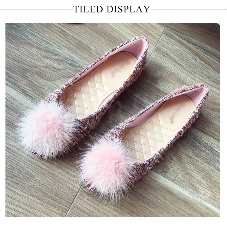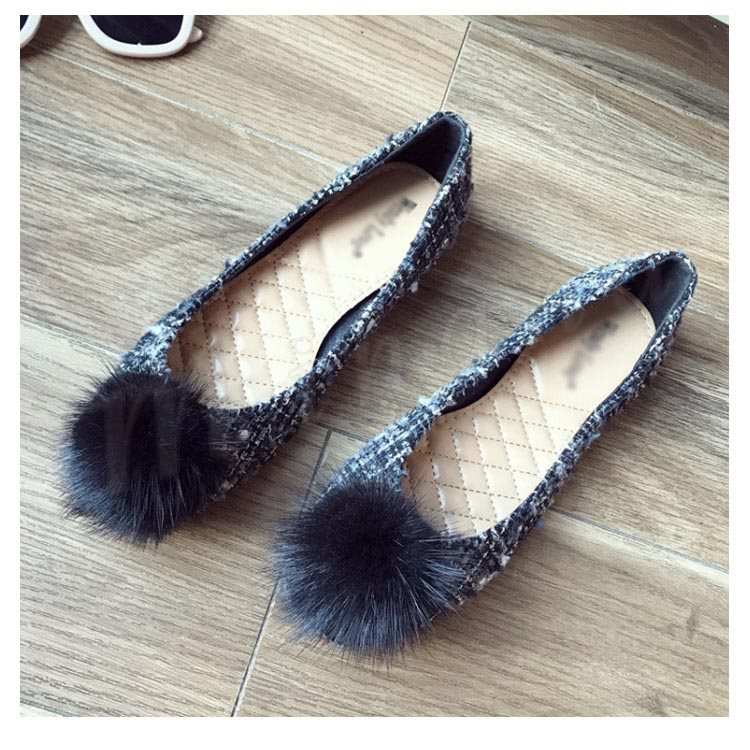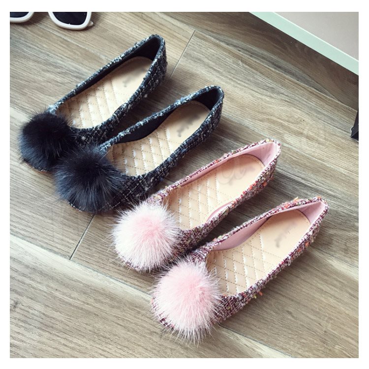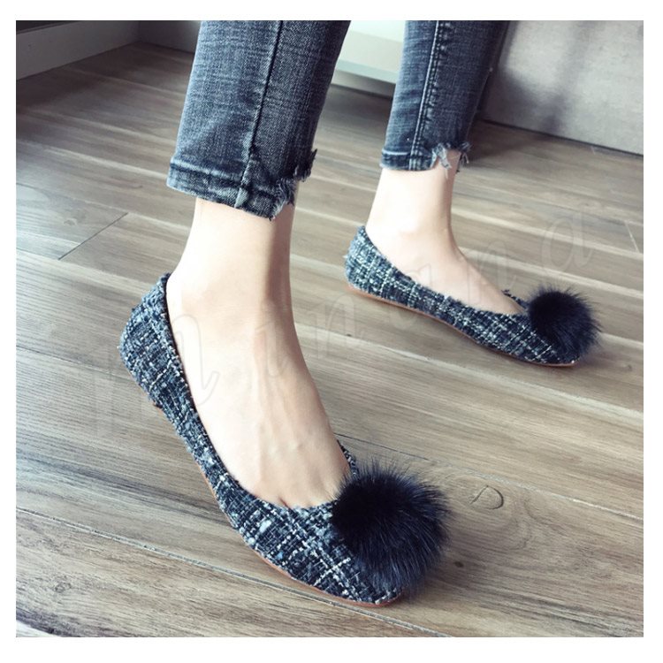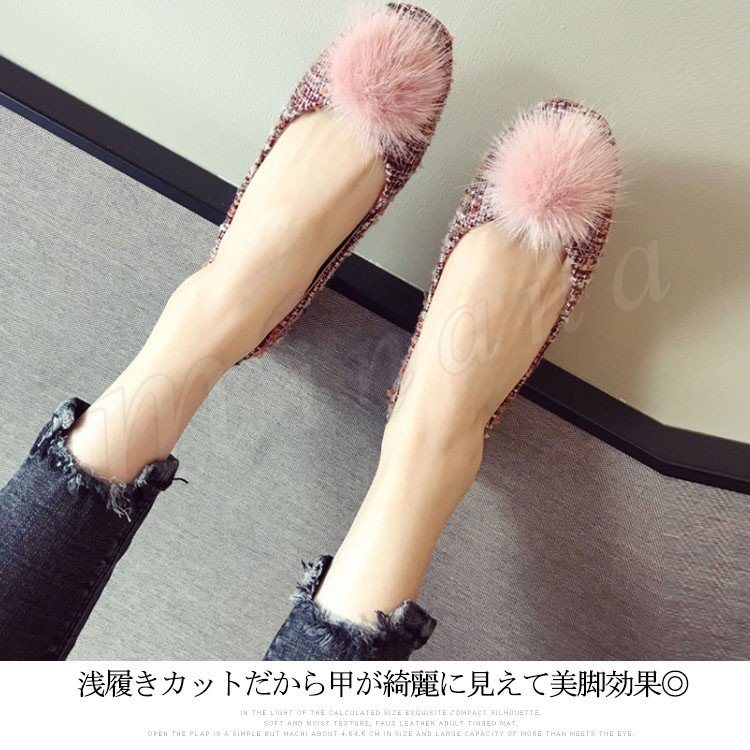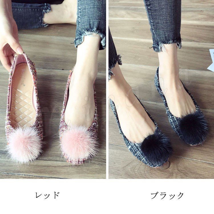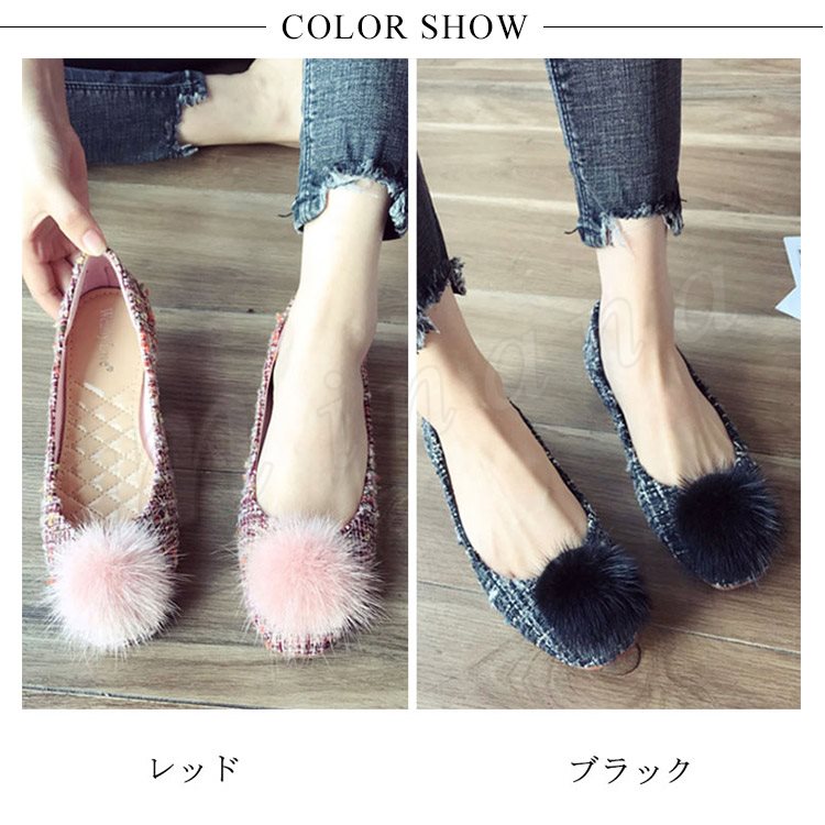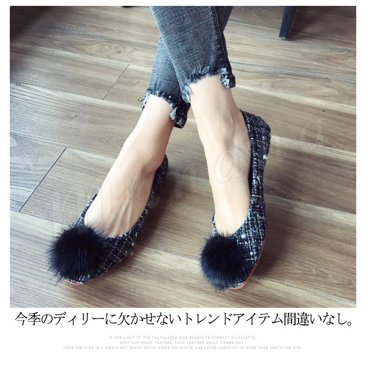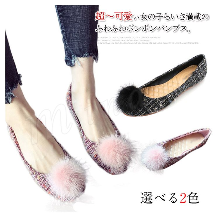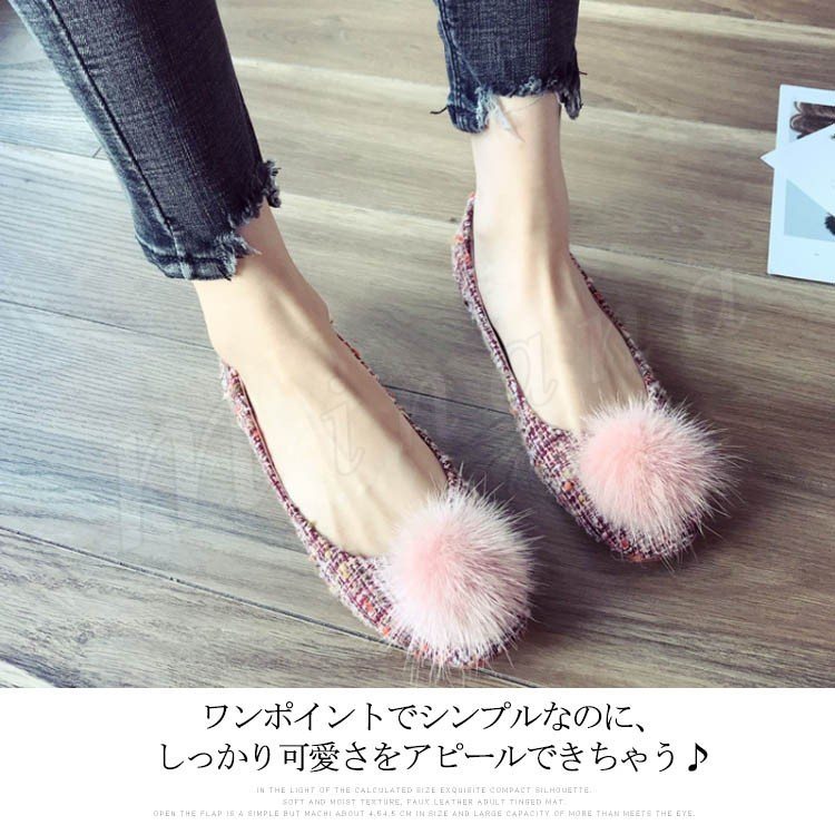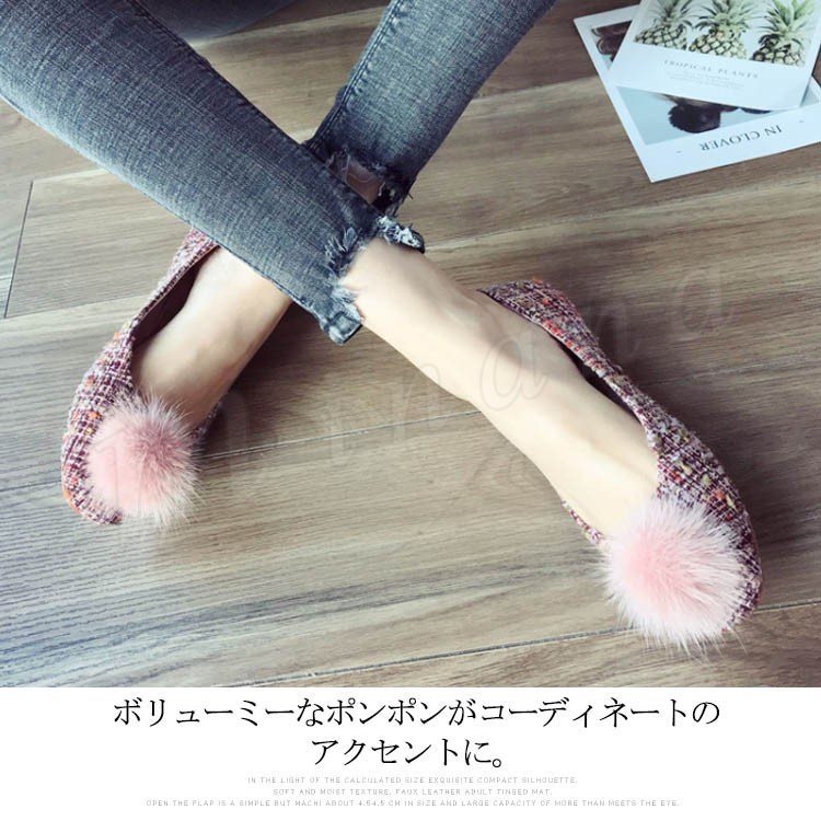 ポンポン付き ラウンドトゥパンプス パンプス ポンポン付パンプス フラットシューズ ツイード調 ローヒール 靴 シューズ レディース 春 秋
