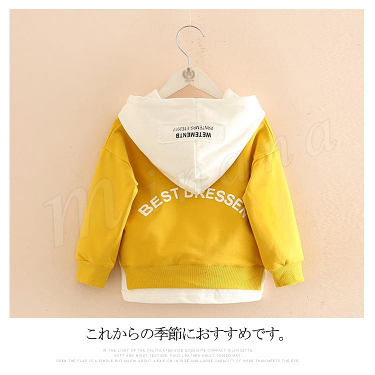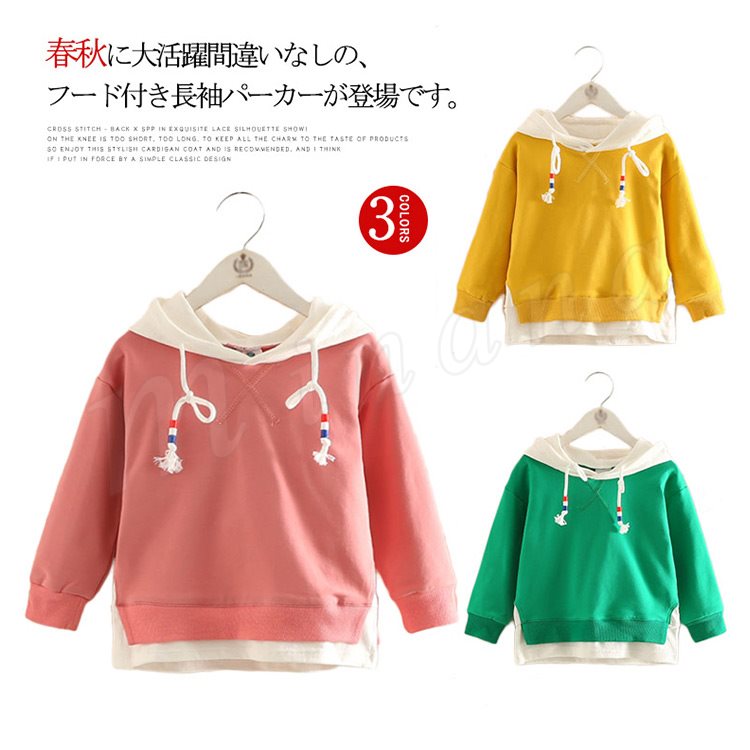 | 春秋に大活躍間違いなしの、フード付き長袖パーカーが登場です。 コットン生地で肌触りが柔らかくて肌に優しい。 通園や通学、お出かけに大活躍なアイテムです。 これからの季節におすすめです。 | |