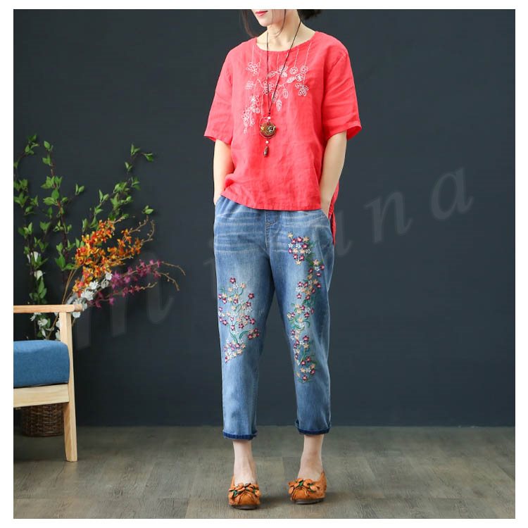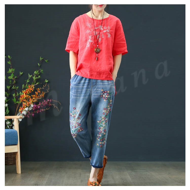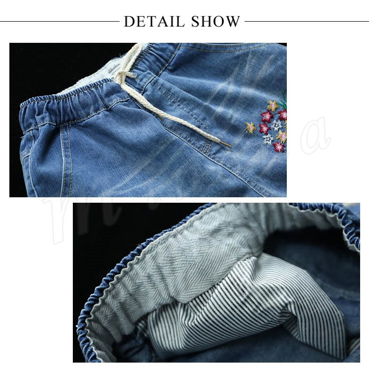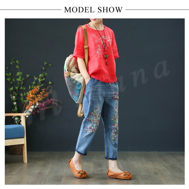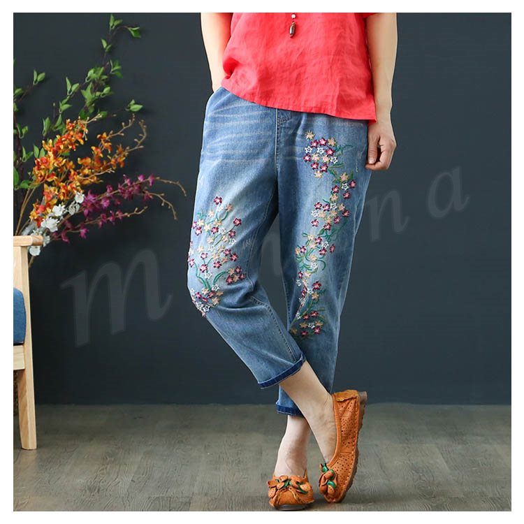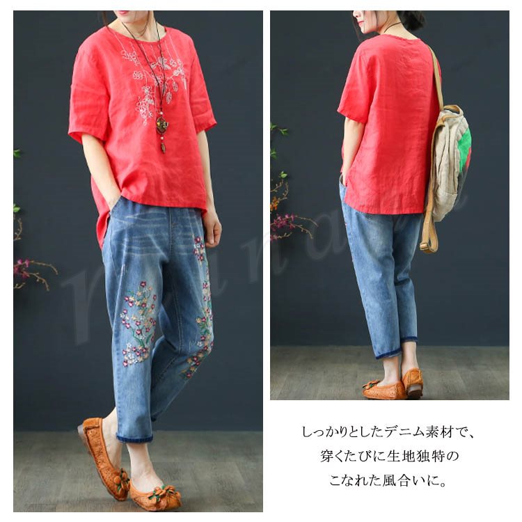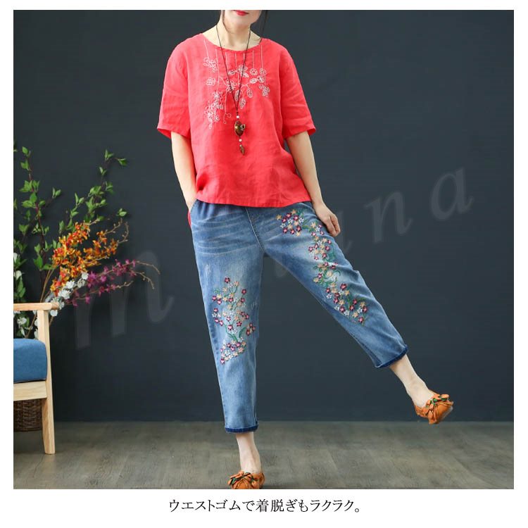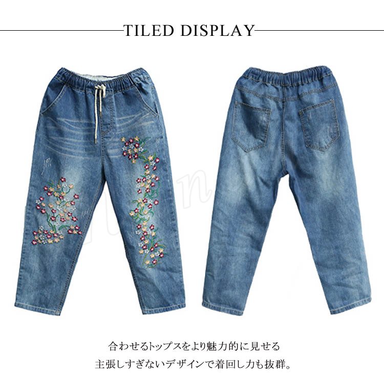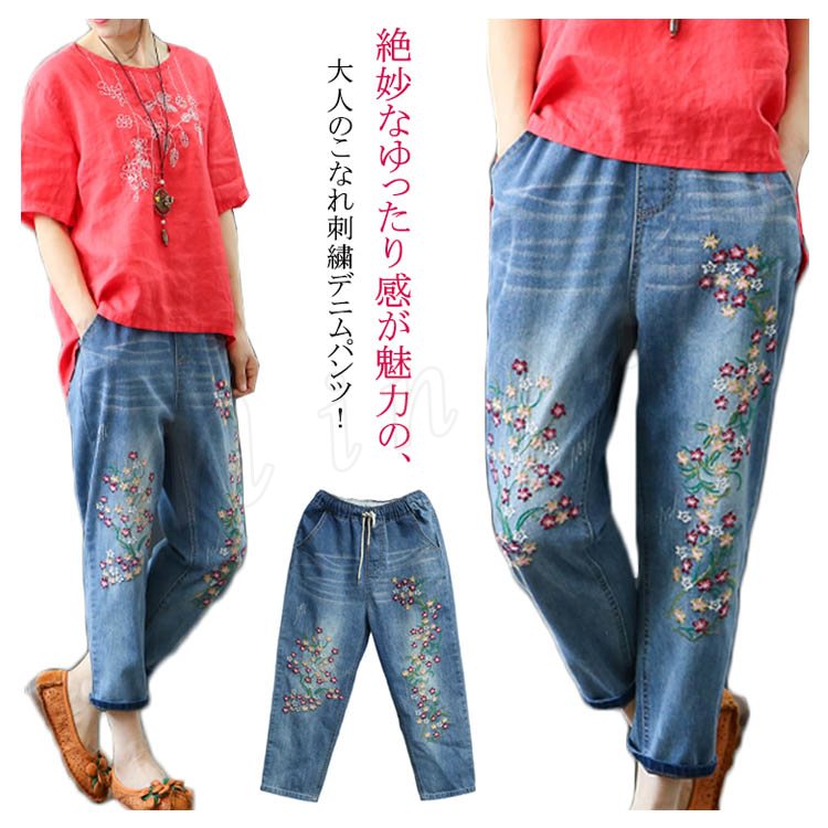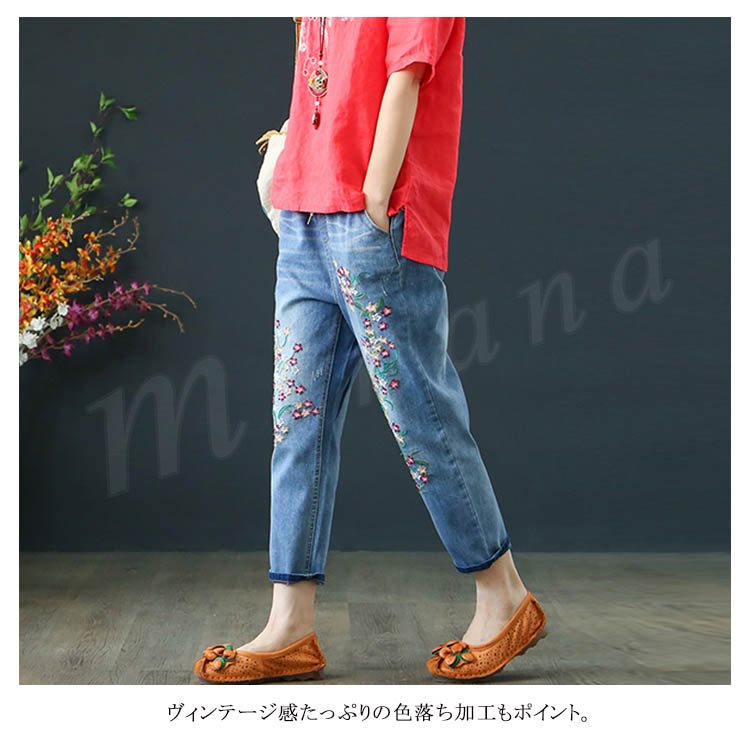 刺繍デニムパンツ レディース 七分丈 フラワー刺繍パンツ デニムパンツ クロップドパンツ デニム ジーンズ カジュアル 花柄 刺繍 春 夏 ゆったり