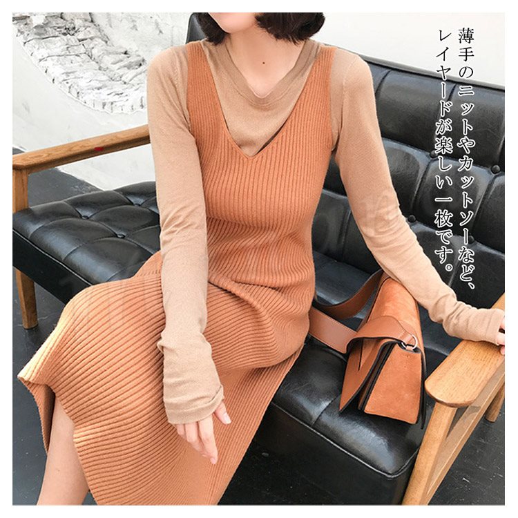 薄手のニットやカットソーなど、レイヤードが楽しい一枚です。