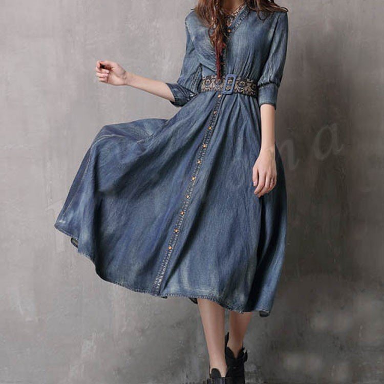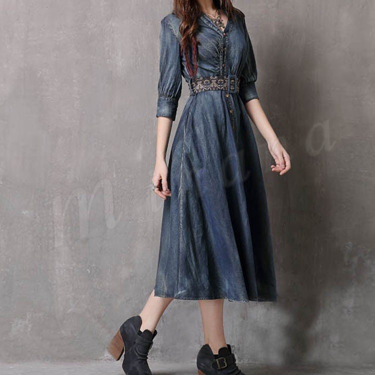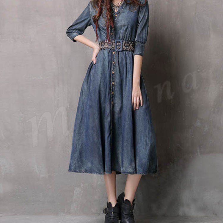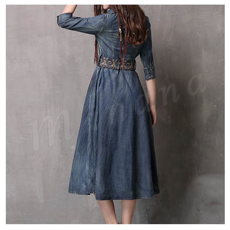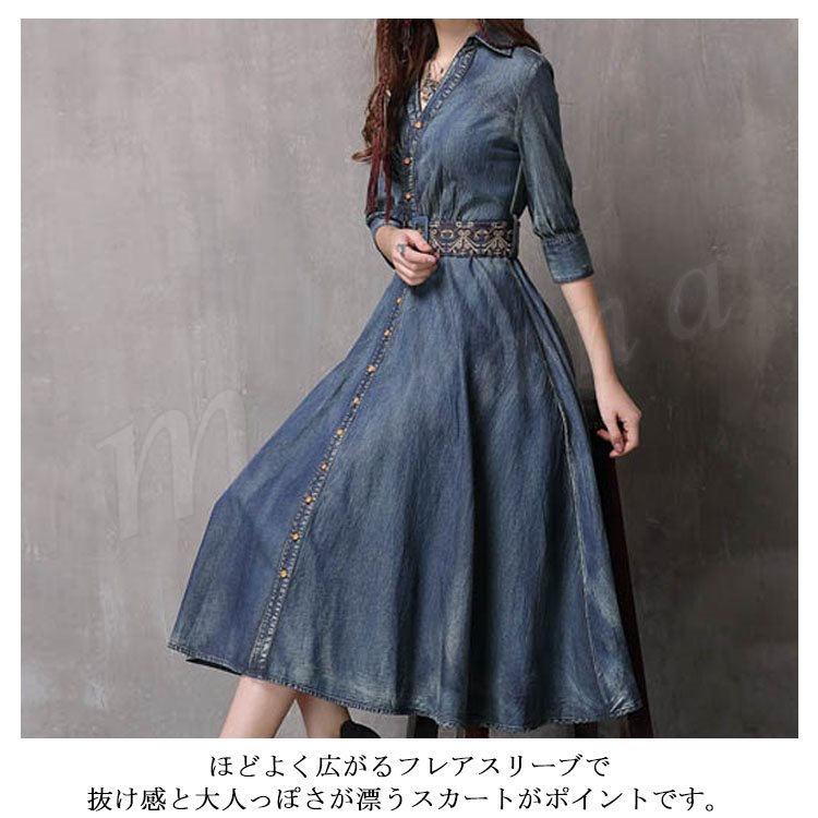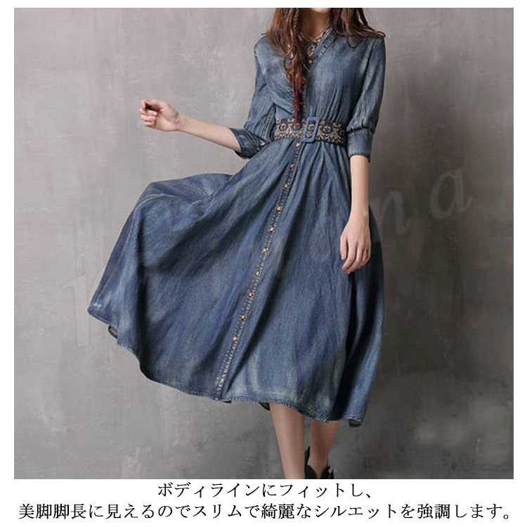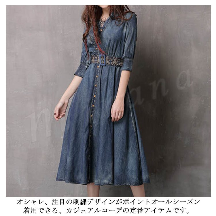 デニムワンピース フレアワンピース Aラインワンピース レディース 5分袖 刺繍柄 刺繍柄ドレス チュニックワンピース 体型カバー おしゃれ デート