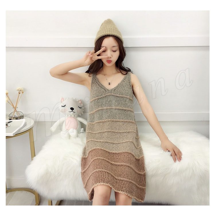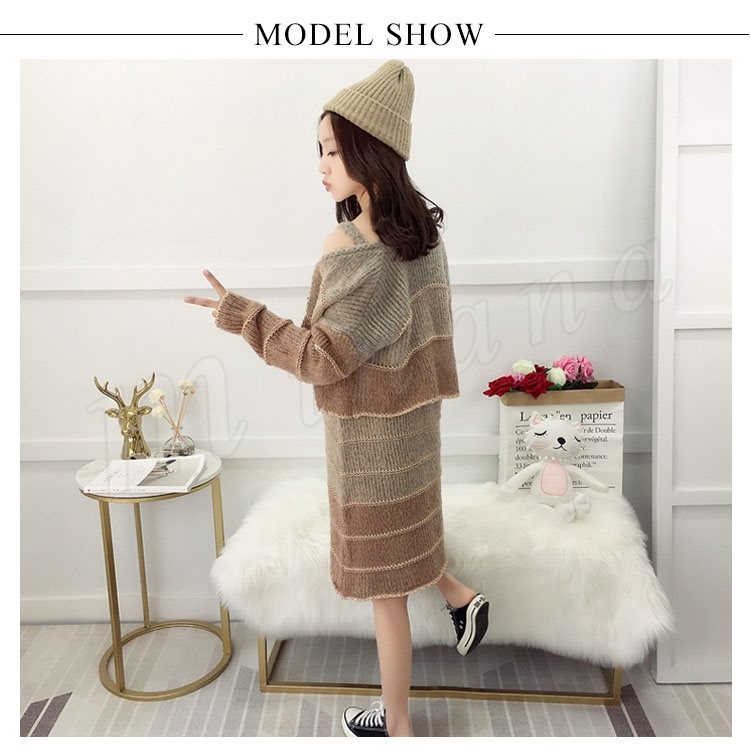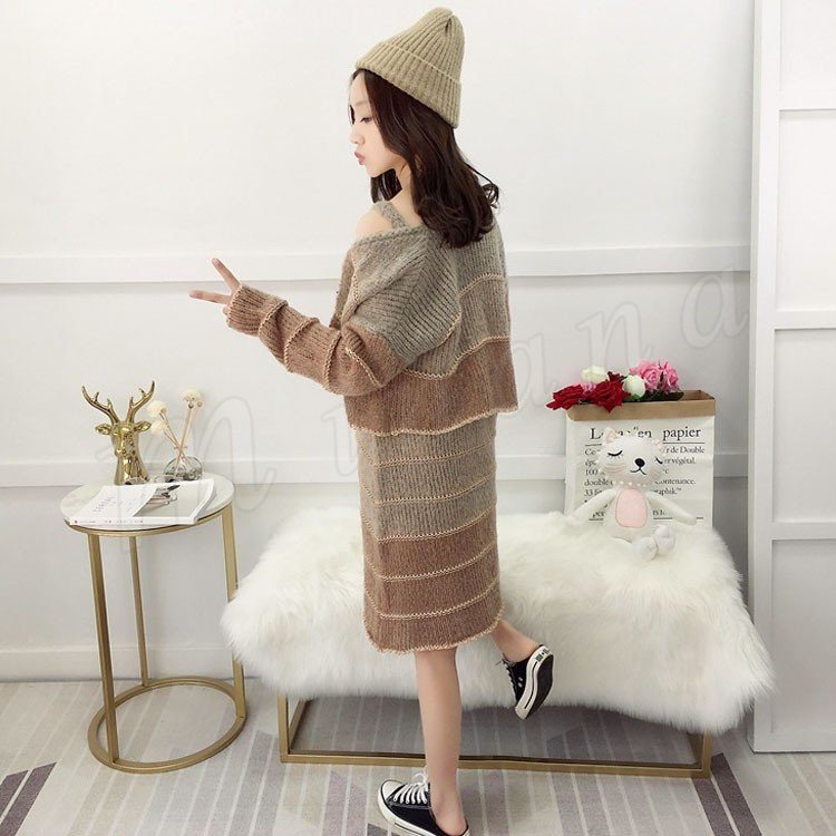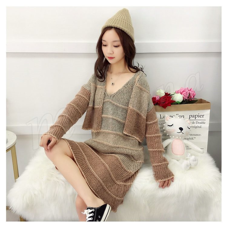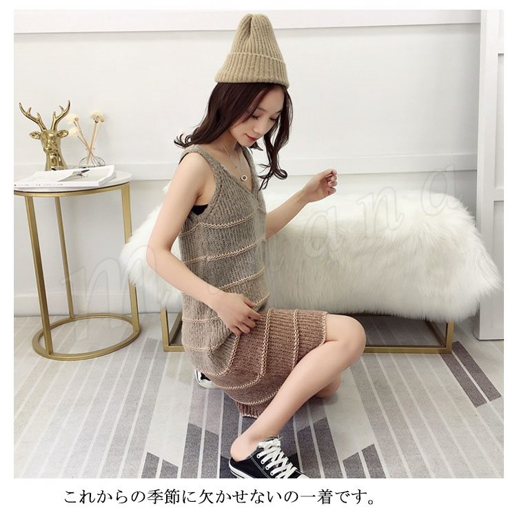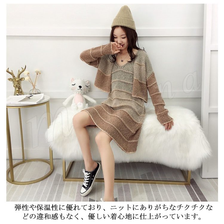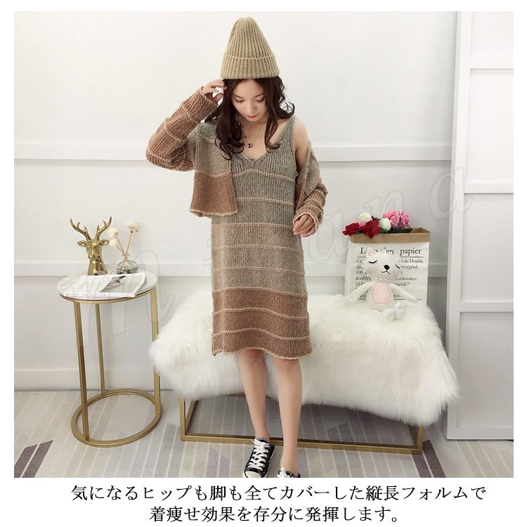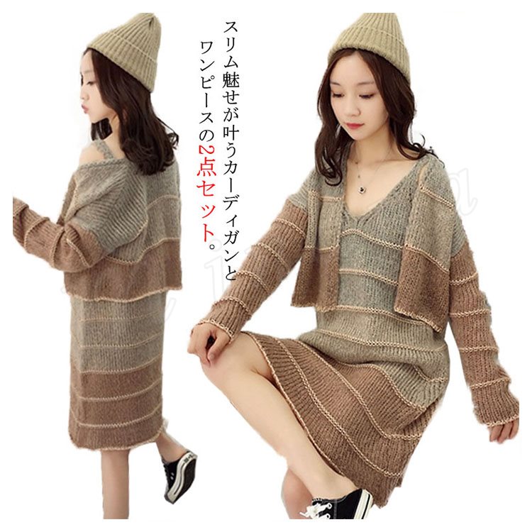 ニットカーディガン ノースリーブワンピース 2点セット リブニット ニットワンピース キャミワンピース ロング丈 ボーダー柄 着やせ 通勤 通学 デ