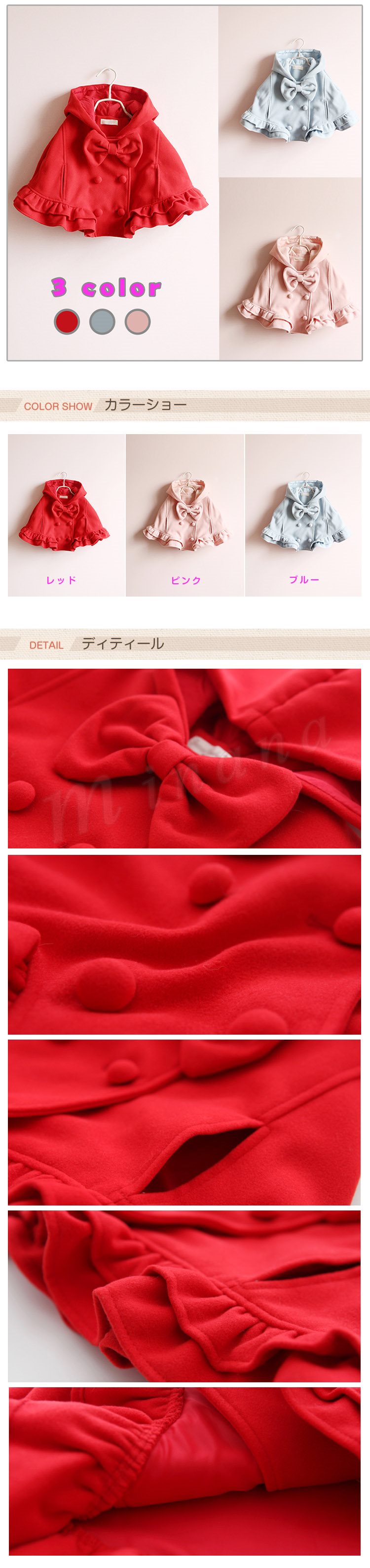 子供 マント フード付き 女の子 蝶結び飾り 前開き ボタン付き 長袖 アウター 防寒 スカラップ ショートコート ショートアウター