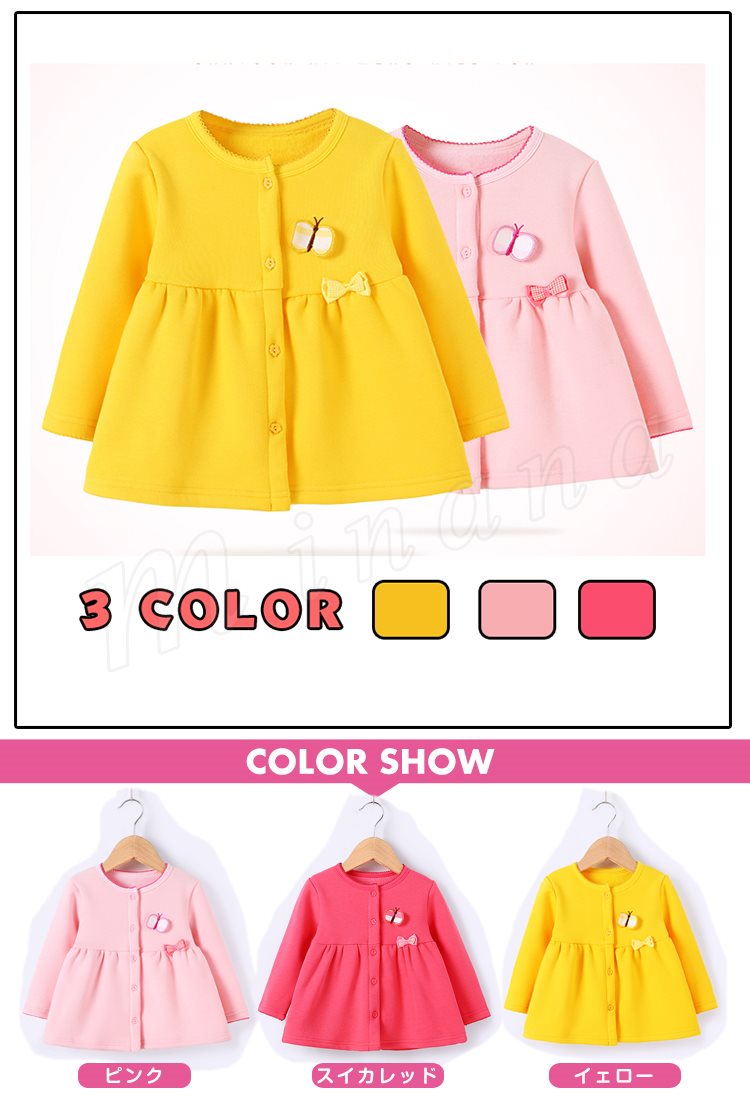 送料無料子供 アウター コート クルーネック 前開き Aライン ゆったり 長袖 無地 蝶結び飾り 裏起毛 厚地 キュート ショート丈