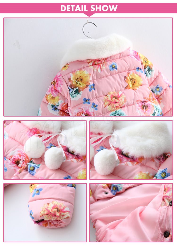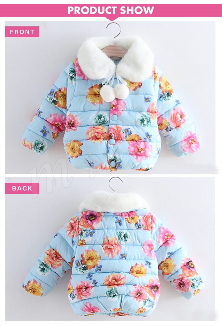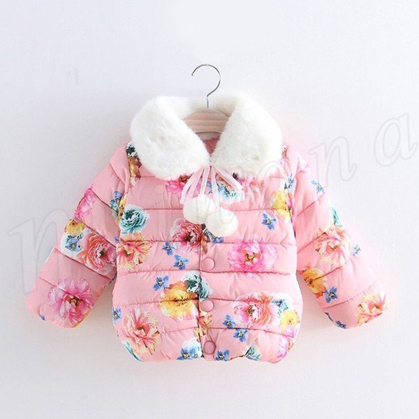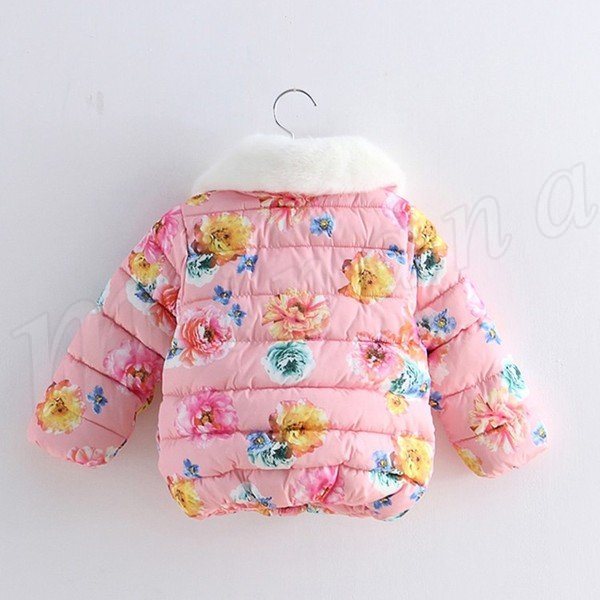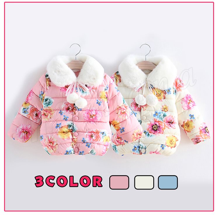 送料無料子供 長袖 ダウンジャケット 折襟 中綿 花柄 ファーネック 毛玉飾り ショート丈 前開き 襟あり アウター コート 2015新作 お出かけ