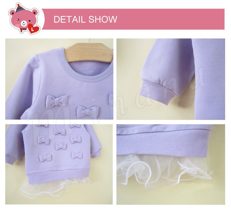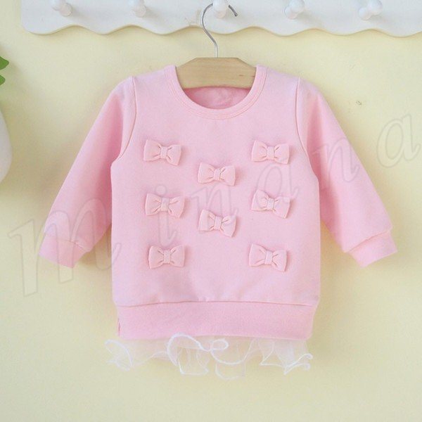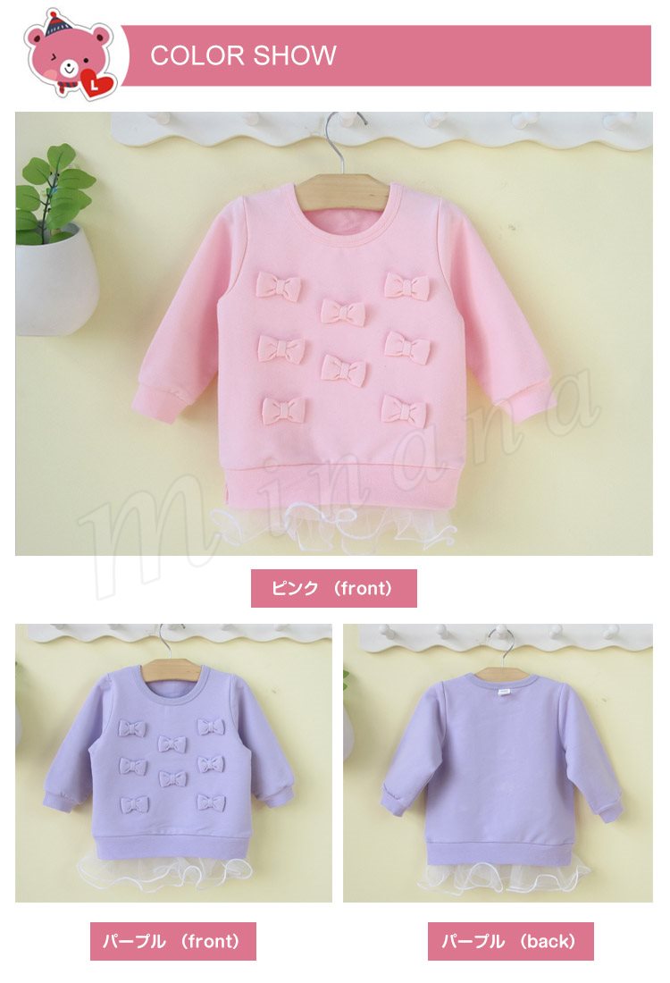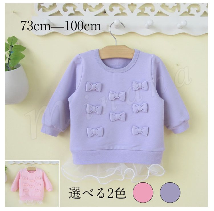 送料無料新生児 Tシャツ 長袖 プルオーバー クルーネック リボン飾り 無地 レース切替 レース裾 トップス 0-1-2-3歳ベビー