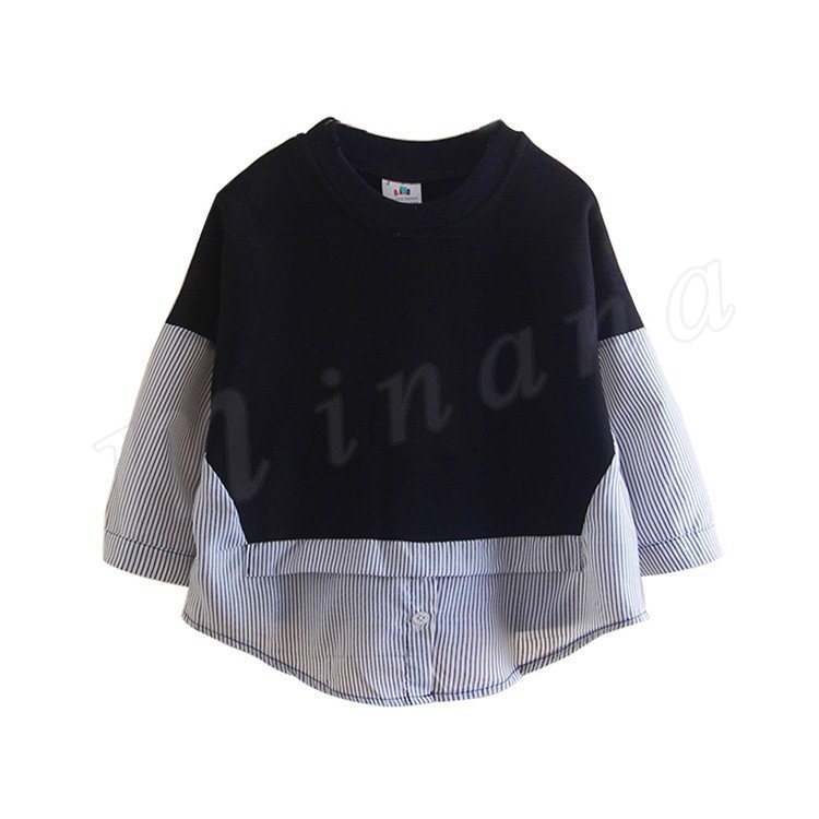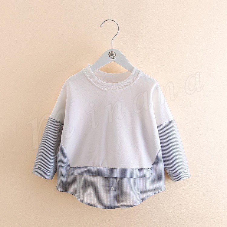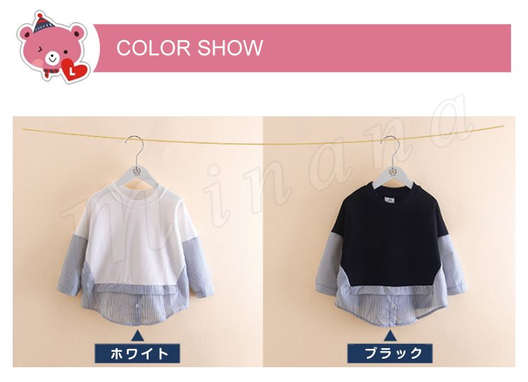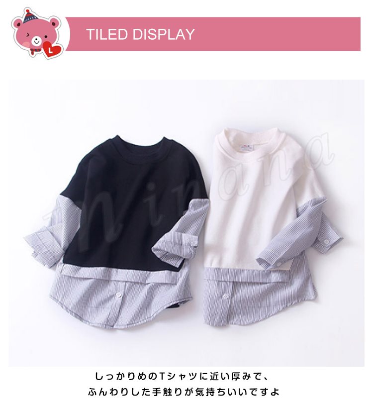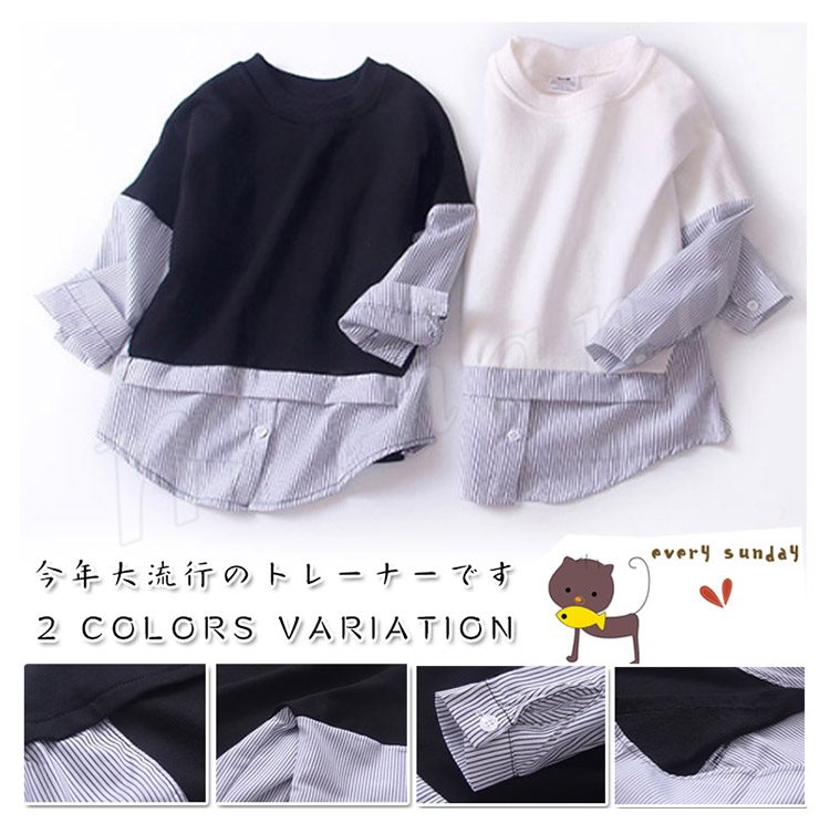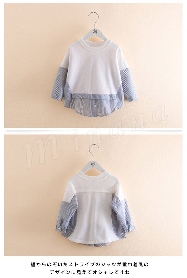 子供服 重ね着風トレーナー パーカー 女の子 トップス プルオーバー チュニック クルーネック 長袖 ストライプ柄 可愛い ゆったり 100c