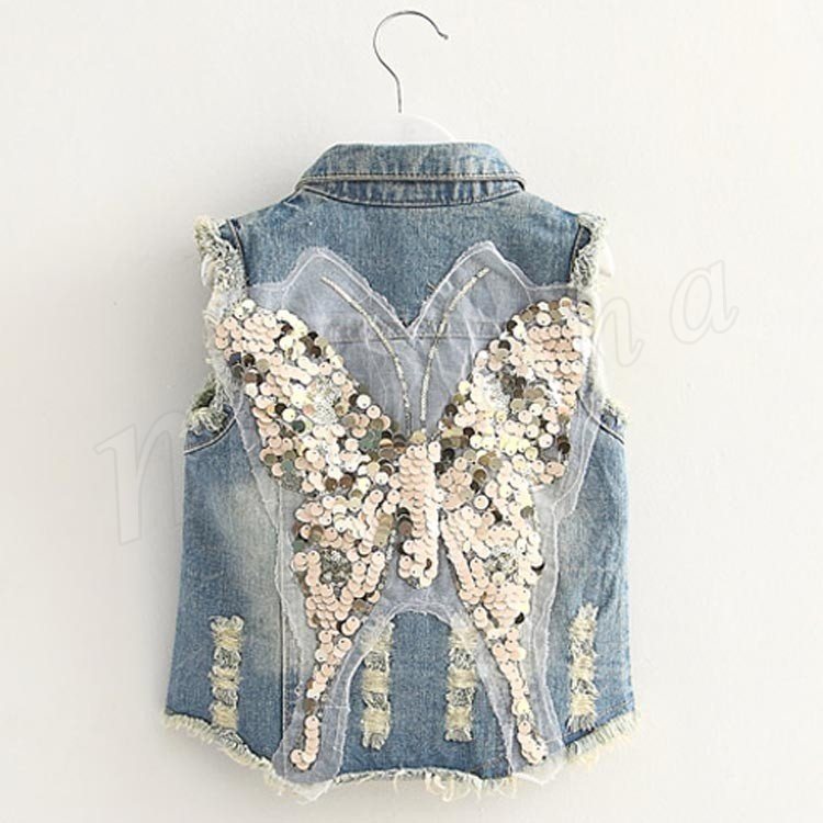 スパンコール×クラッシュ加工 デニムベスト 女の子 子供服 Gジャン デニム ベスト ダメージ加工 Gベスト デニム ジャケット キッズ 春