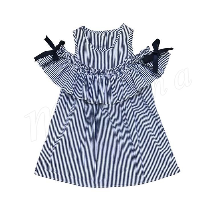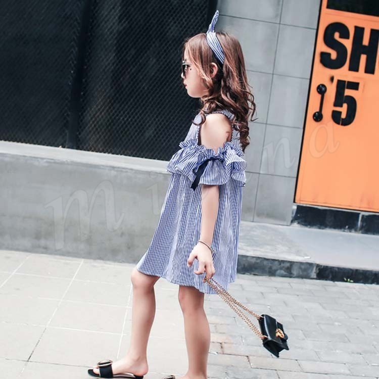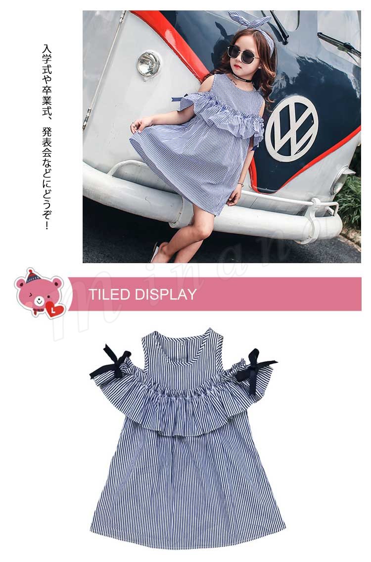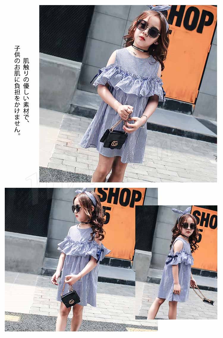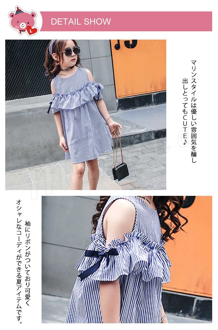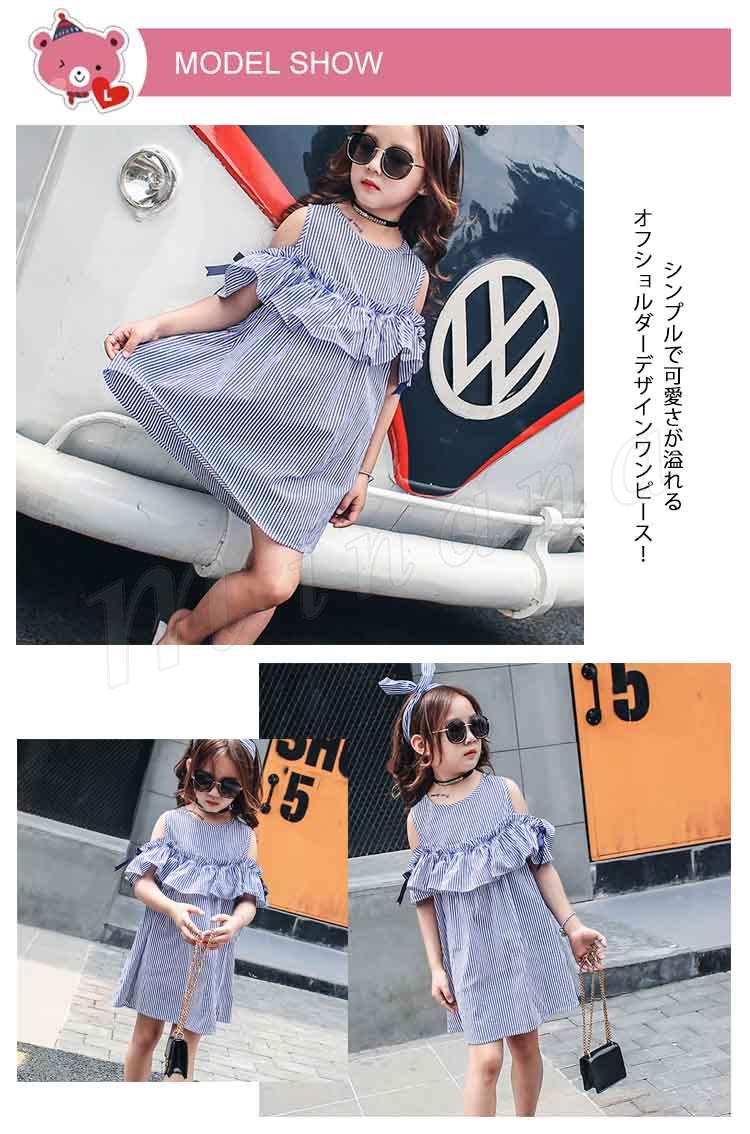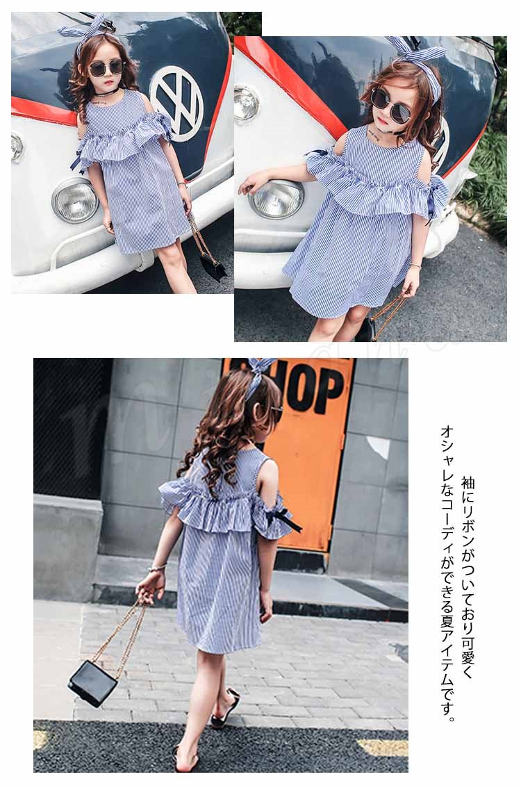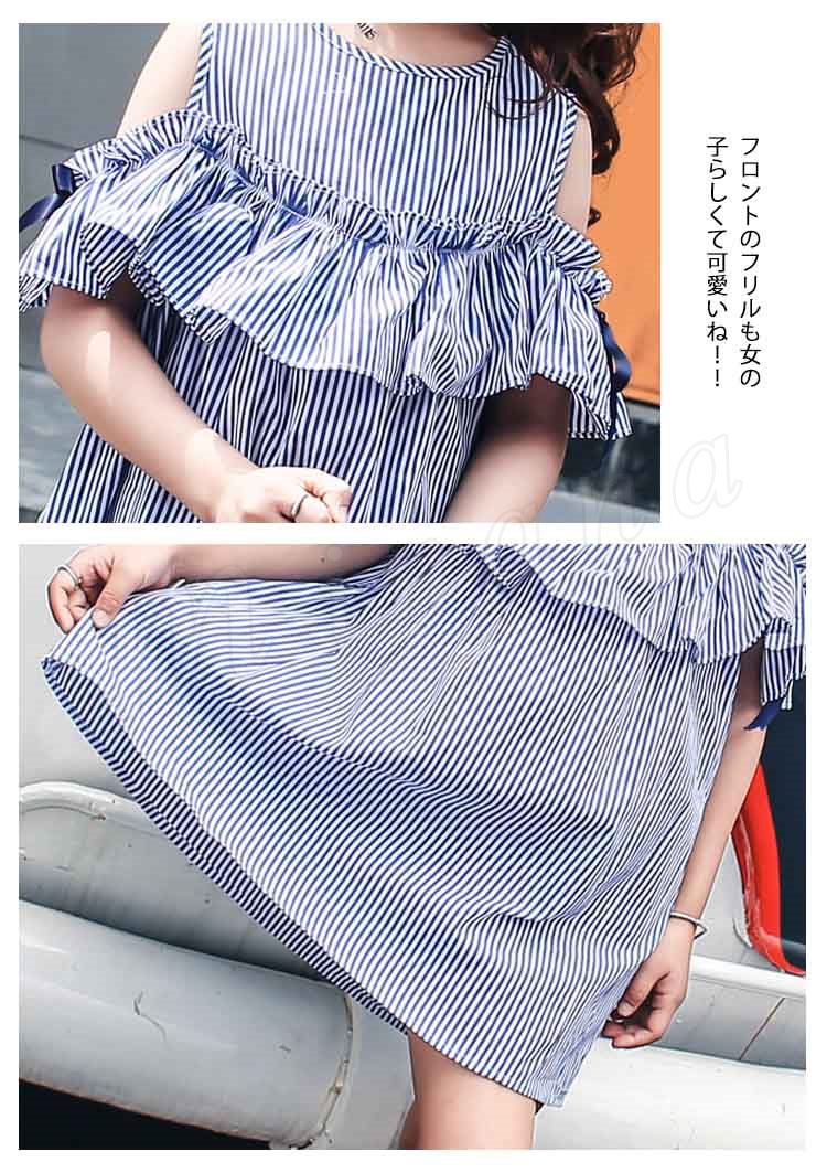 女の子 ワンピース 袖リボン オフショルダー ワンピース ストライプ柄 オフショル フレアワンピース 子供 ワンピース 子供ワンピース 夏ワン