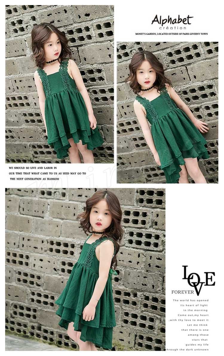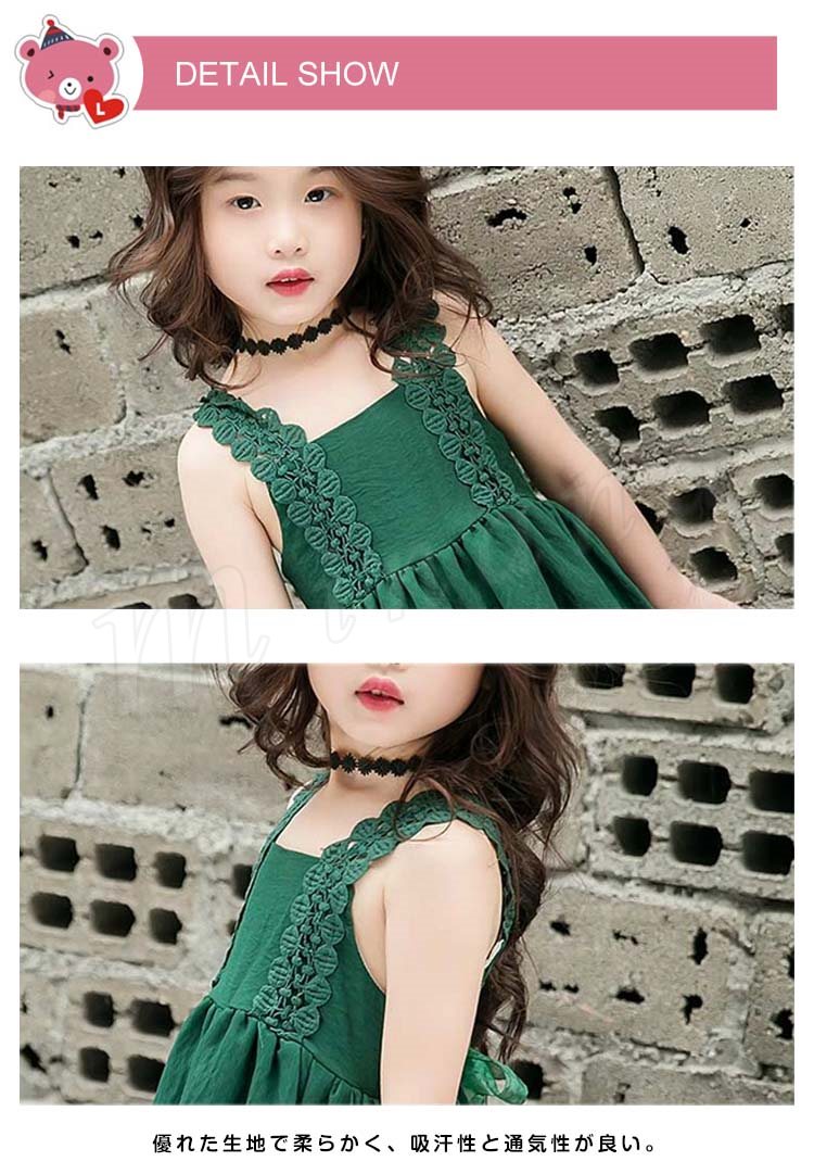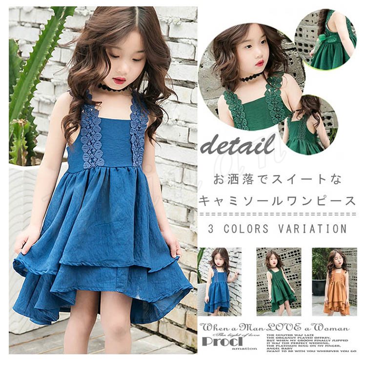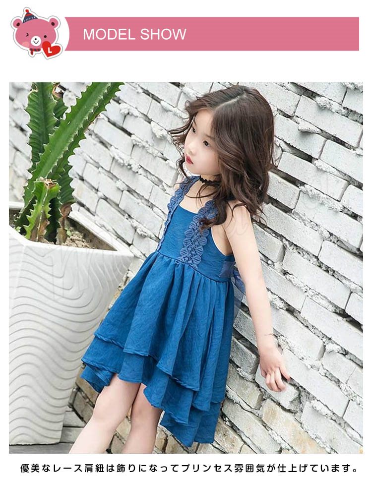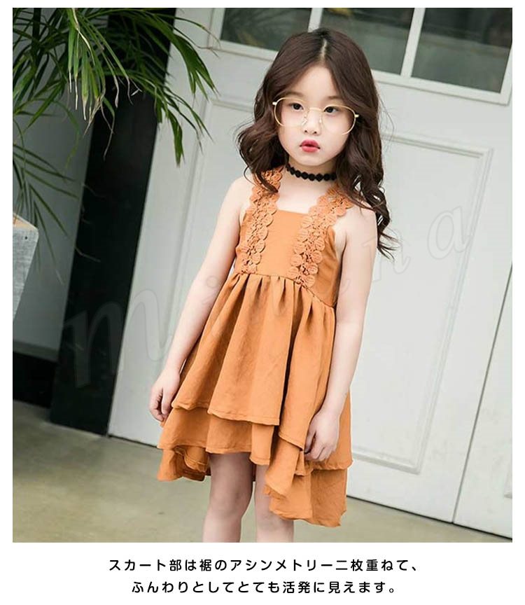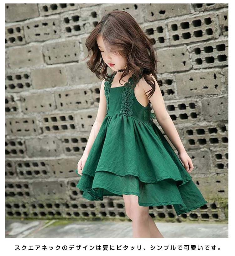 お洒落でスイートなキャミソールワンピース キッズノースリーブワンピース アシンメトリーワンピース 女の子 スクエアネック レース肩紐 シンプル