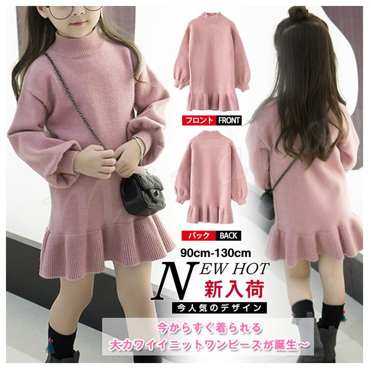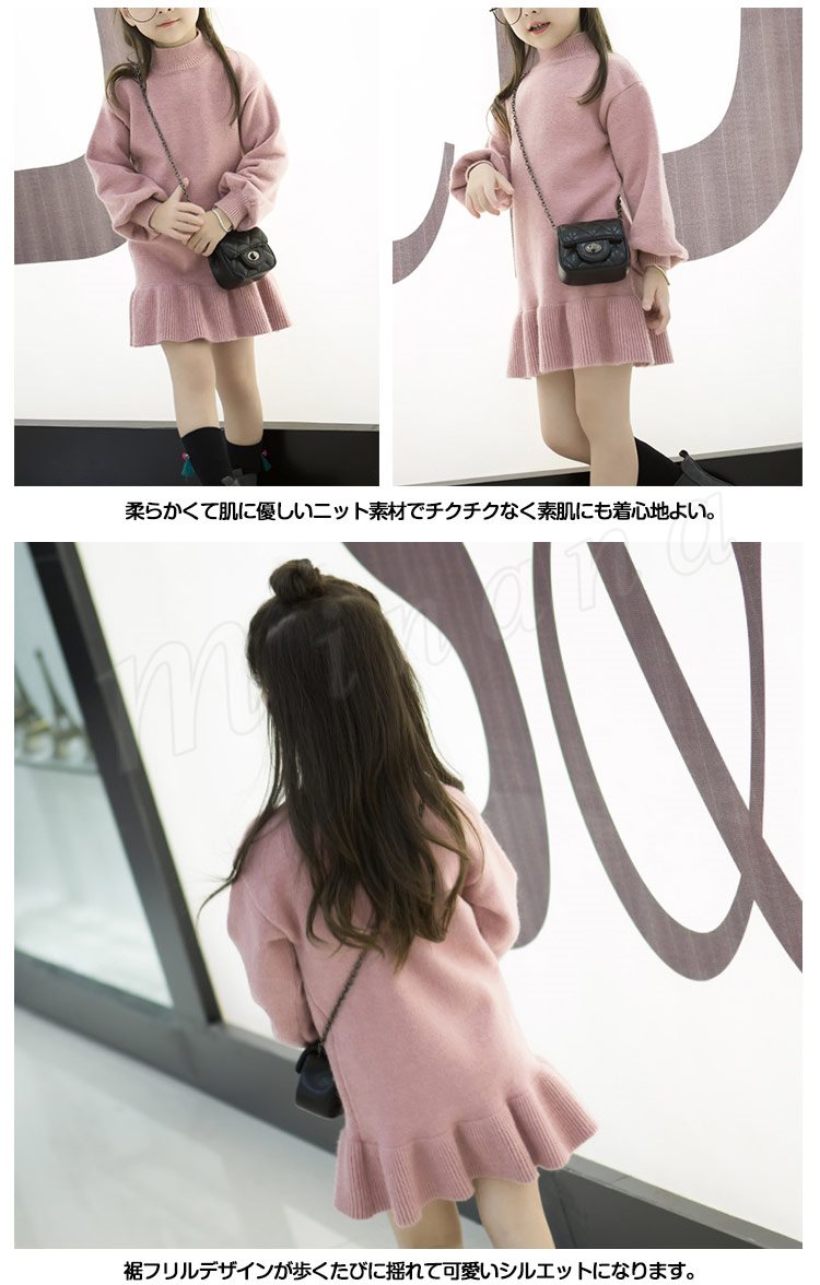 子供ワンピース ニットワンピース キッズ 女の子 ワンピース ニット ハイネック 子供服 キッズ ジュニア 春ワンピ フリル 長袖 無地 9