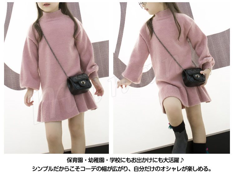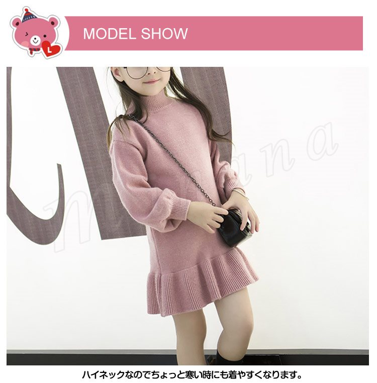 | 今からすぐ着られる大カワイイニットワンピースが誕生? ハイネックなのでちょっと寒い時にも着やすくなります。 柔らかくて肌に優しいニット素材でチクチクなく素肌にも着心地よい。 裾フリルデザインが歩くたびに揺れて可愛いシルエットになります。 保育園・幼稚園・学校にもお出かけにも大活躍♪ シンプルだからこそコーデの幅が広がり、自分だけのオシャレが楽しめる。 一枚ではもちろん、レギンスやソックス、どんなアイテムとも相性◎ | |