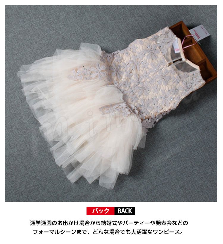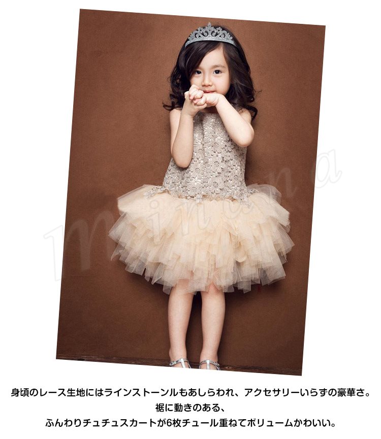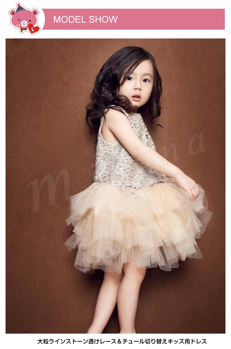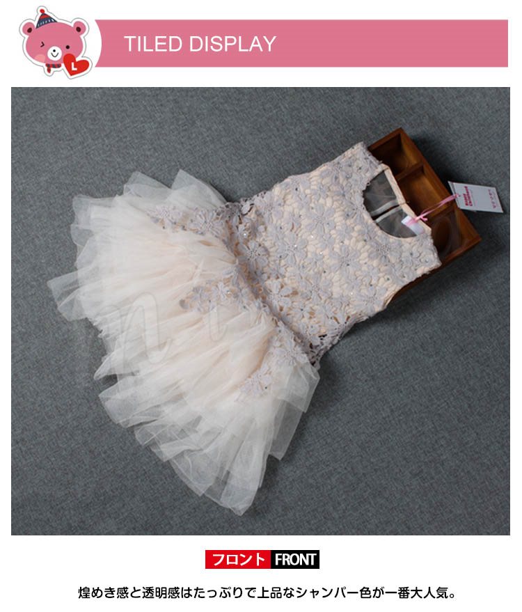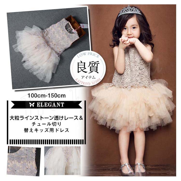 | 大粒ラインストーン透けレース&チュール切り替えキッズ用ドレス 身頃のレース生地にはラインストーンルもあしらわれ、アクセサリーいらずの豪華さ。 裾に動きのある、ふんわりチュチュスカートが6枚チュール重ねてボリュームかわいい。 またしなやかな裏地も付いて着心地抜群です。 煌めき感と透明感はたっぷりで上品なシャンパー色が一番大人気。 通学通園のお出かけ場合から結婚式やパーティーや発表会などのフォーマルシーンまで、どんな場合でも大活躍なワンピース。 | |