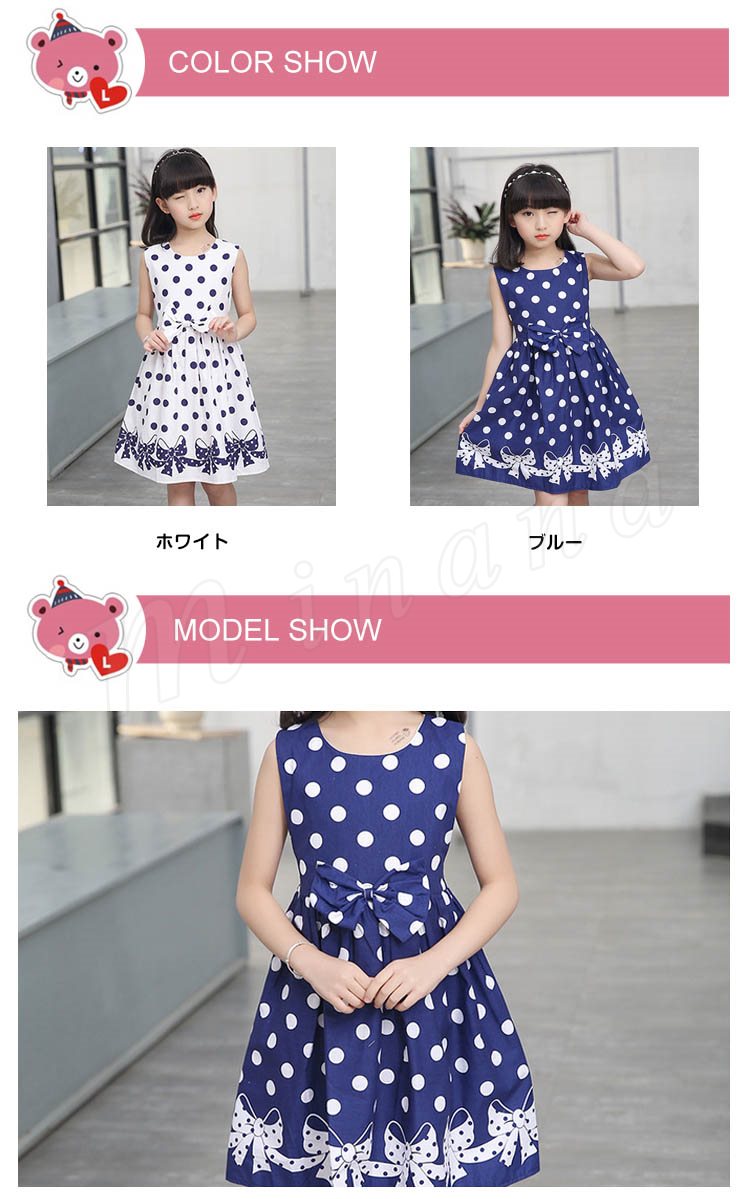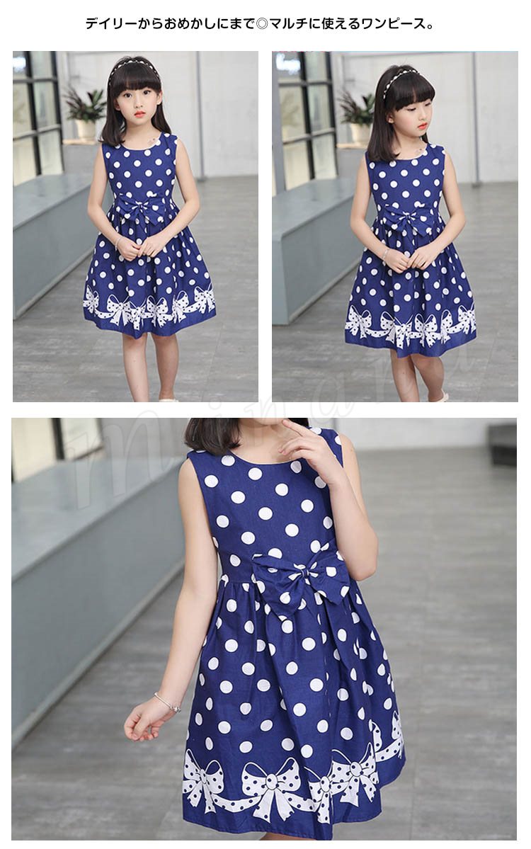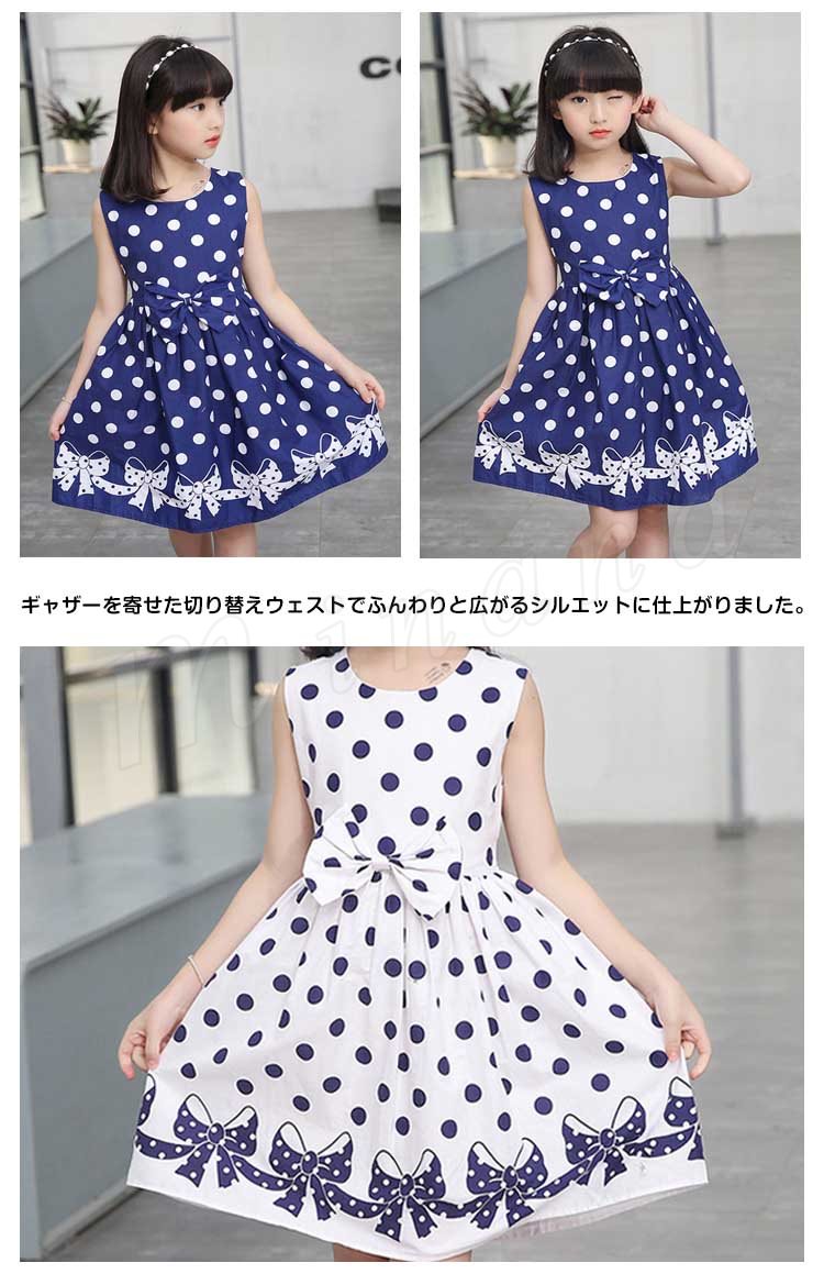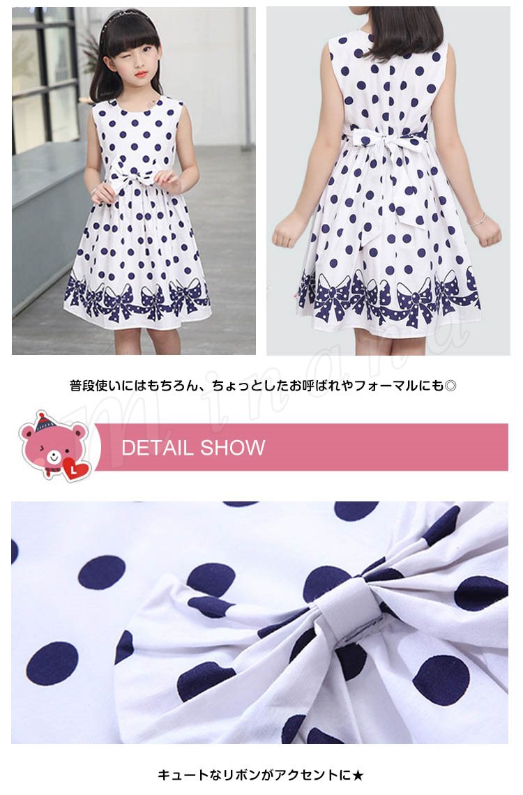 子供ワンピース 子供ドレス 水玉柄 ドット柄 フレアワンピース 女の子 ワンピース ノースリーブ リボン 子供 ワンピース ノースリーブ タン