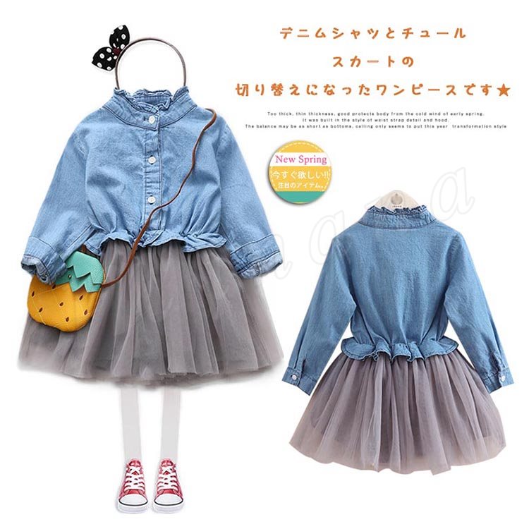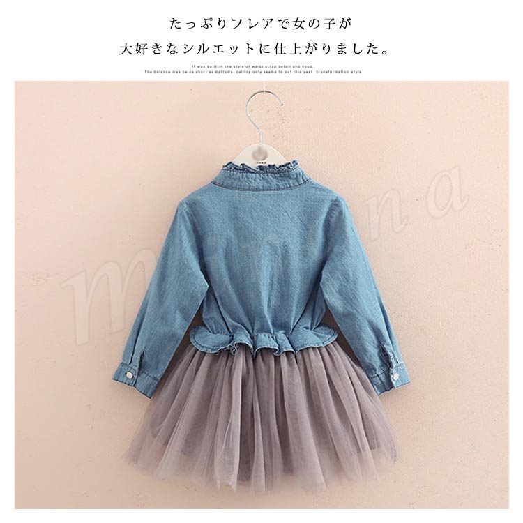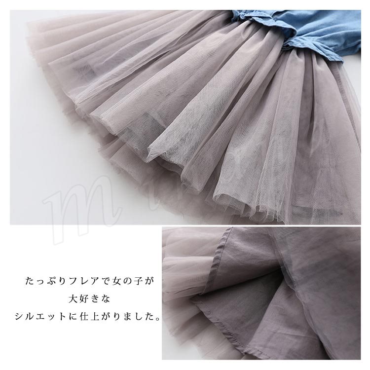 チュール切替 デニムワンピース 女の子 子供 ワンピース フェイクレイヤード風 ワンピース デニム チュールスカート 切替 ワンピース 子供服
