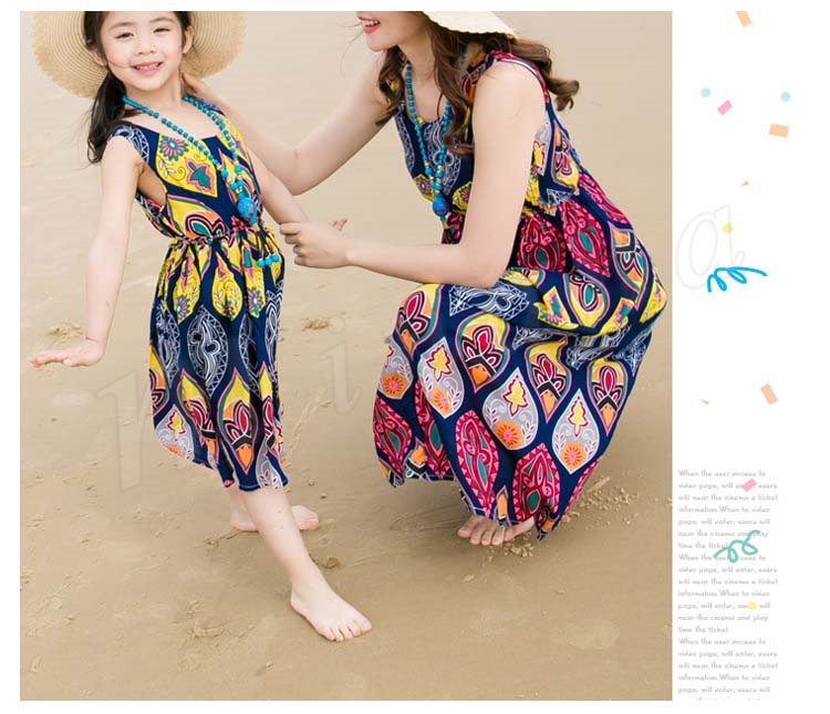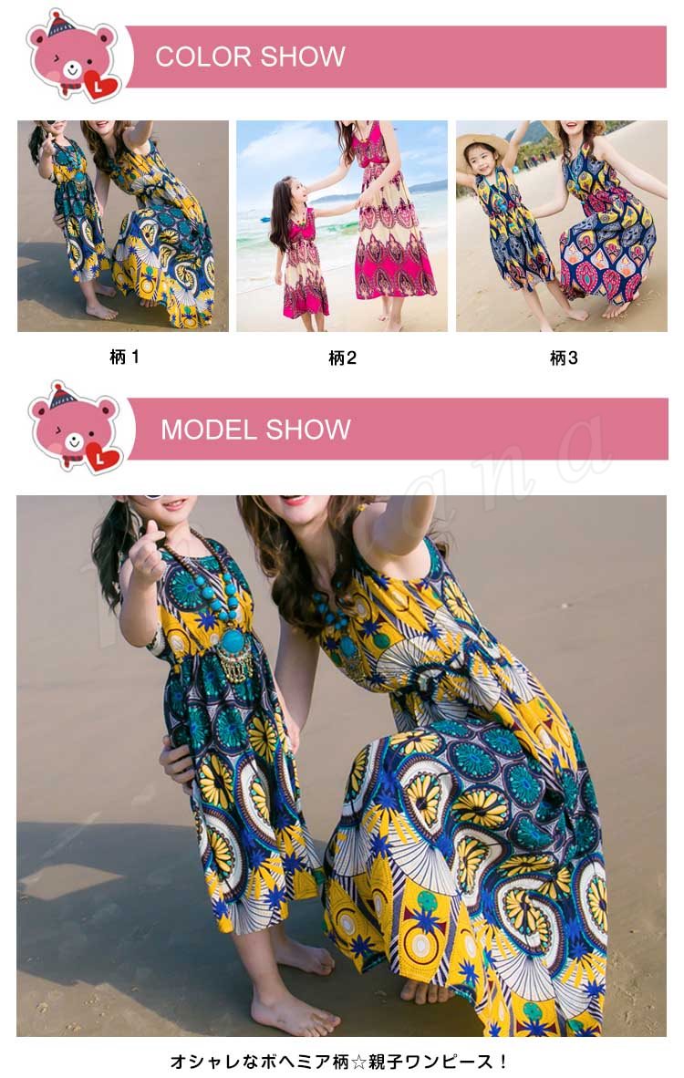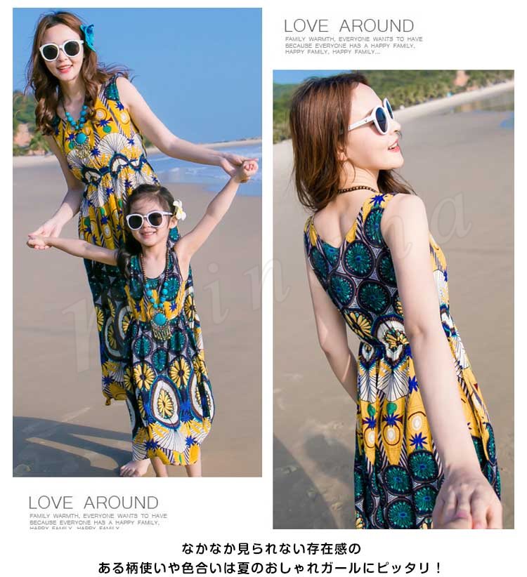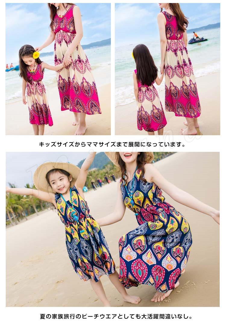 親子服 花柄 シフォンロング丈 ノースリーブ ボヘミア ワンピース 親子お揃い ペアルック ワンピース 親子ペア 家族旅行 キッズ 大人