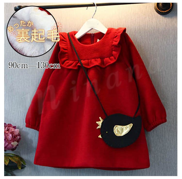 ワンピース 長袖 無地 クルーネック レッドワンピース 子供ワンピ チュニックワンピース ショート丈 キッズ ゆったり 裏起毛 ラシャ