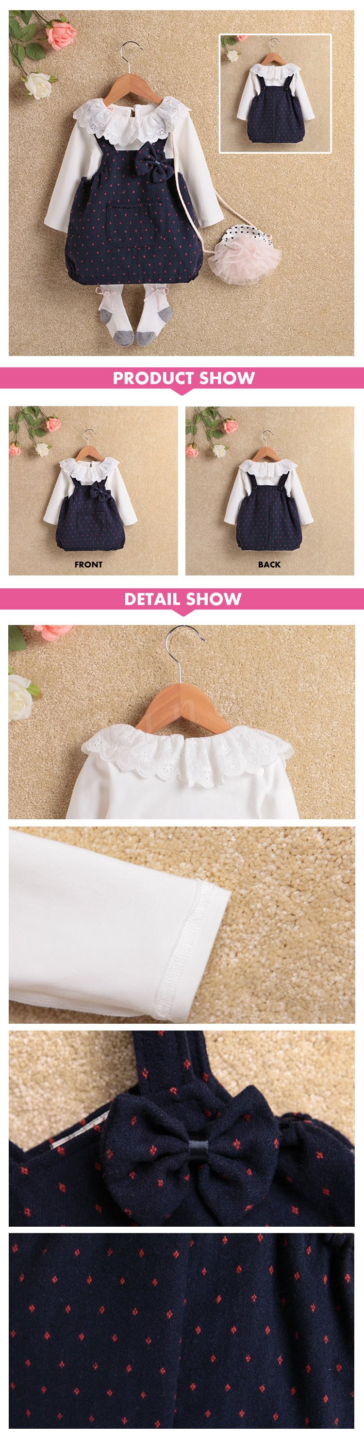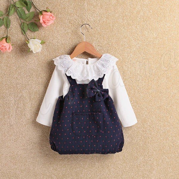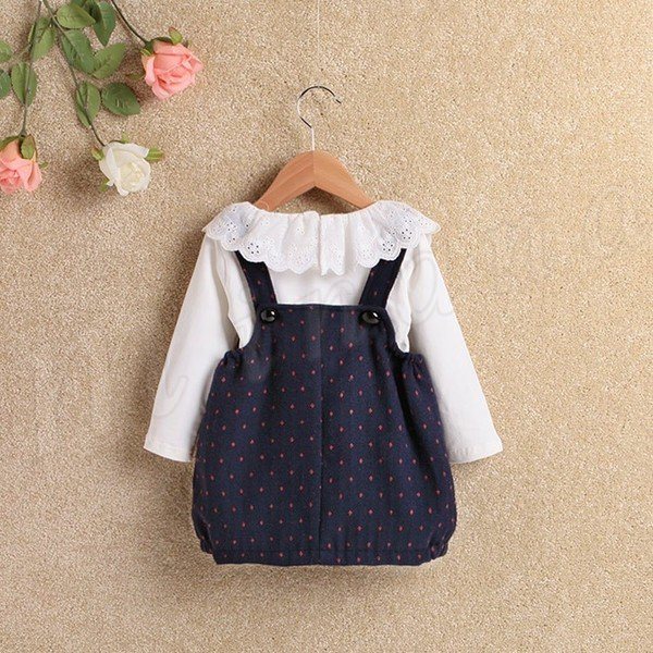送料無料子供服 ブラウス+サロペット2点セット ワンピース ドット柄 人形襟 レースネック 人形ネック 吊りスカート