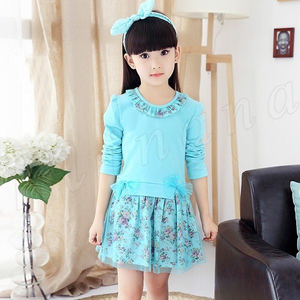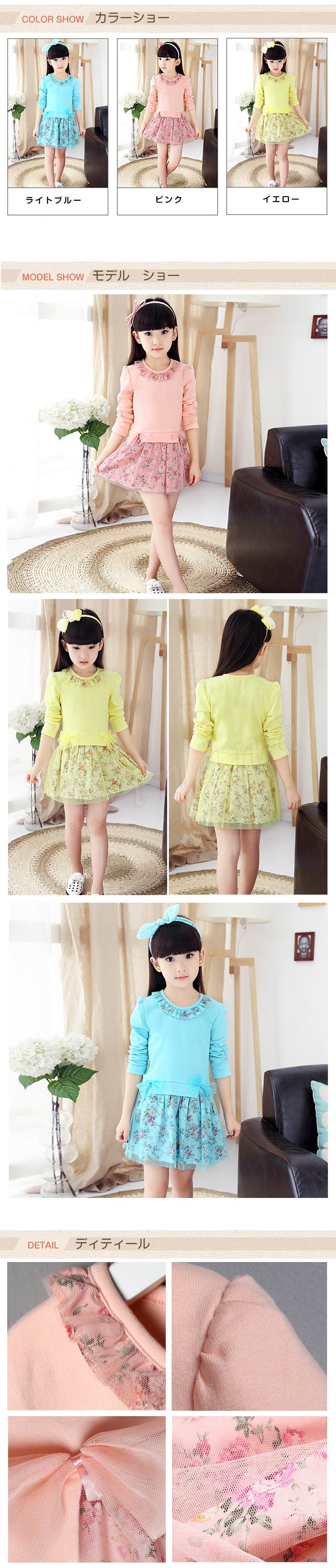 送料無料ワンピース レースコットン切替 ドッキング 長袖ワンピ レース付きネック 花飾り 子供ワンピ 女の子 受ぬあ