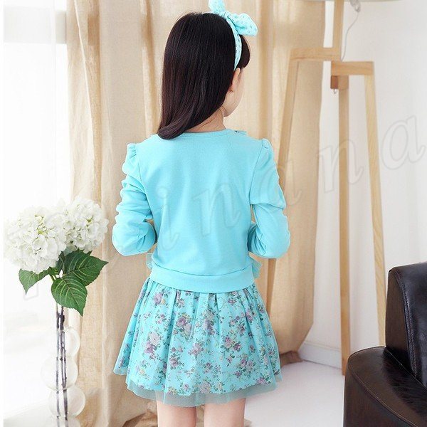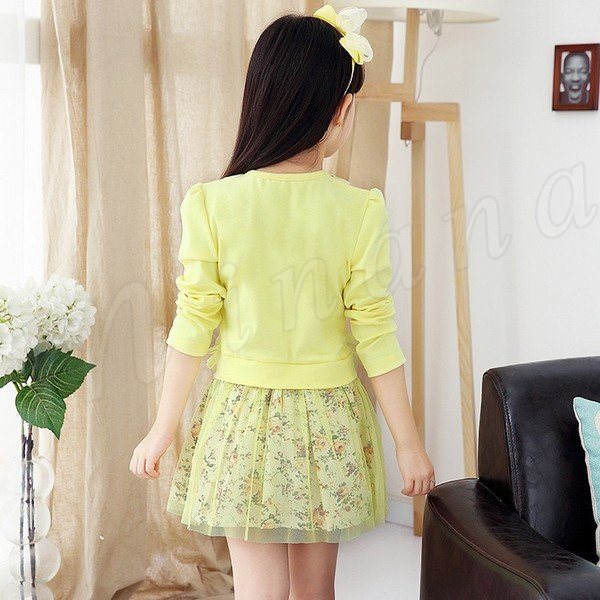 ワンピース レースコットン切替 ドッキング 長袖ワンピ レース付きネック 花飾り 子供ワンピ 女の子 受ぬあ